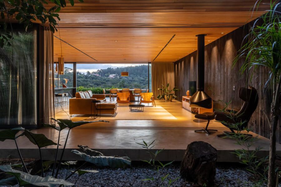 Implantada cuidadosamente em um terreno com topografia em aclive, a residência foi pensada para preservar o bosque que cobre a metade superior do lote. A solução encontrada pelo arquiteto foi acomodar a construção na cota média, onde não existiam árvores, garantindo o mínimo impacto ambiental. Assim, a casa se abre ao pôr do sol e ao vale circundante, exibindo uma fachada que ganha tons dourados sob a luz do fim da tarde.