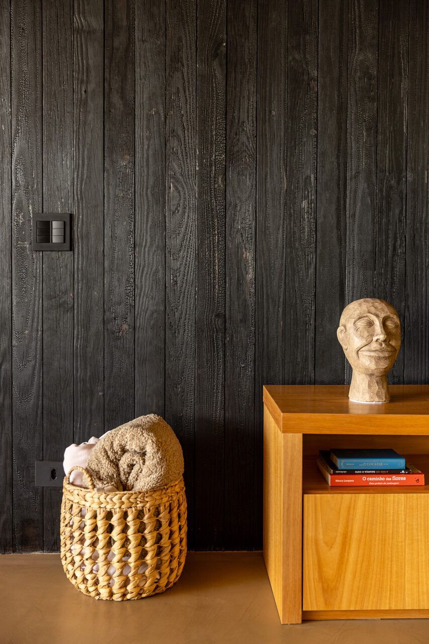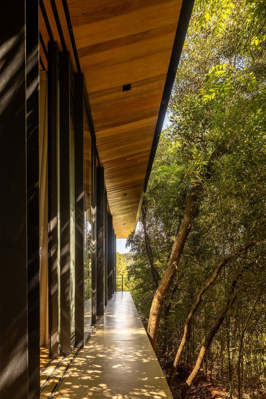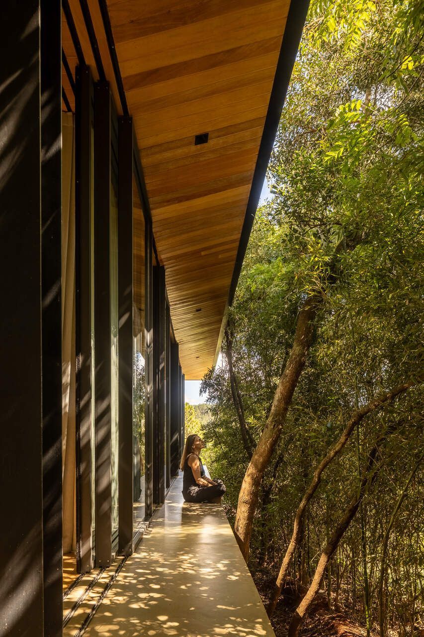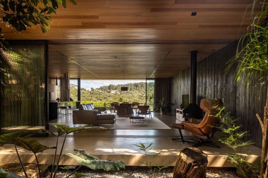 A estrutura reflete a inteligência construtiva que permeia todo o projeto. O volume principal, leve e linear, repousa sobre uma base robusta de concreto e pedra. Acima dela, o prisma metálico é revestido por painéis de madeira carbonizada, combinando sistemas pré-fabricados e técnicas artesanais. Essa combinação de materiais reforça o diálogo entre o natural e o industrial, uma síntese perfeita do espírito que norteia a obra e cria a sintonia entre arquitetura e natureza.