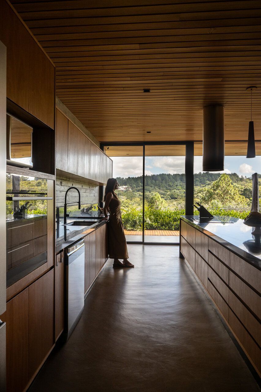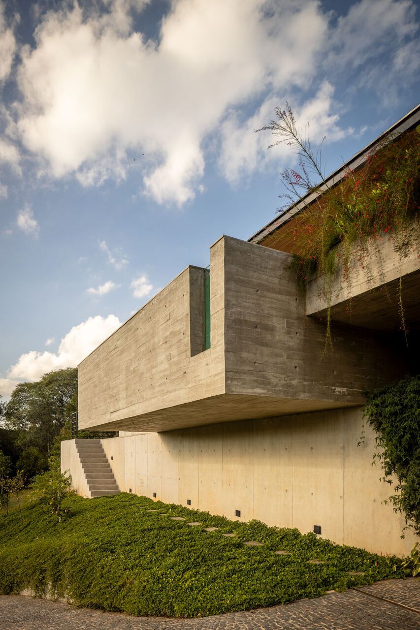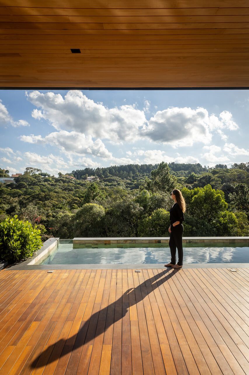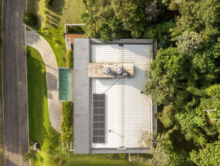Implantada cuidadosamente em um terreno com topografia em aclive, a residência foi pensada para preservar o bosque que cobre a metade superior do lote. A solução encontrada pelo arquiteto foi acomodar a construção na cota média, onde não existiam árvores, garantindo o mínimo impacto ambiental. Assim, a casa se abre ao pôr do sol e ao vale circundante, exibindo uma fachada que ganha tons dourados sob a luz do fim da tarde.