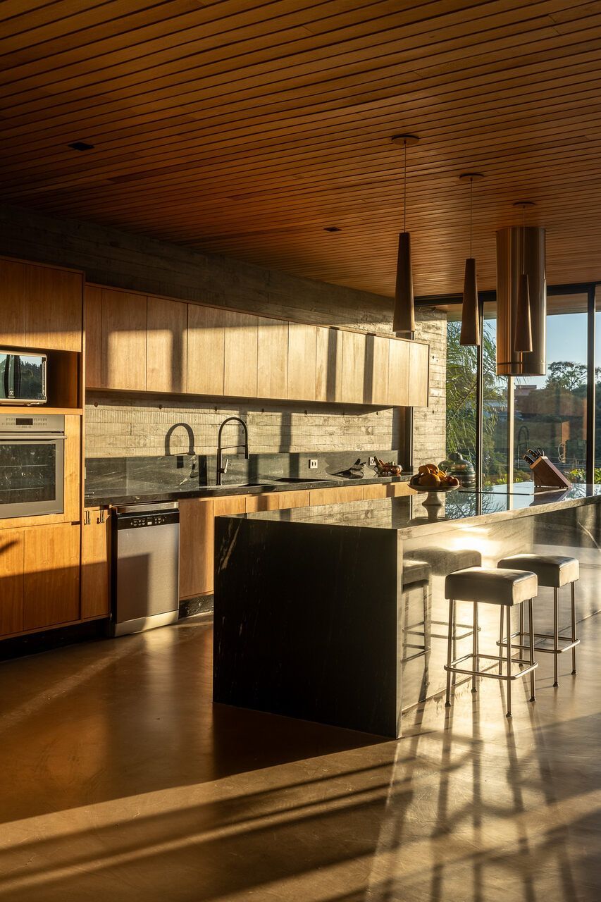 Internamente, os espaços também privilegiam a fluidez e a integração visual com o entorno. Grandes aberturas enquadram as vistas do vale e do bosque, transformando o cenário natural em protagonista. A luz, em constante mutação ao longo do dia, desenha novas atmosferas sobre as superfícies em concreto, madeira e vidro, criando um jogo interessantíssimo entre sombra e transparência.