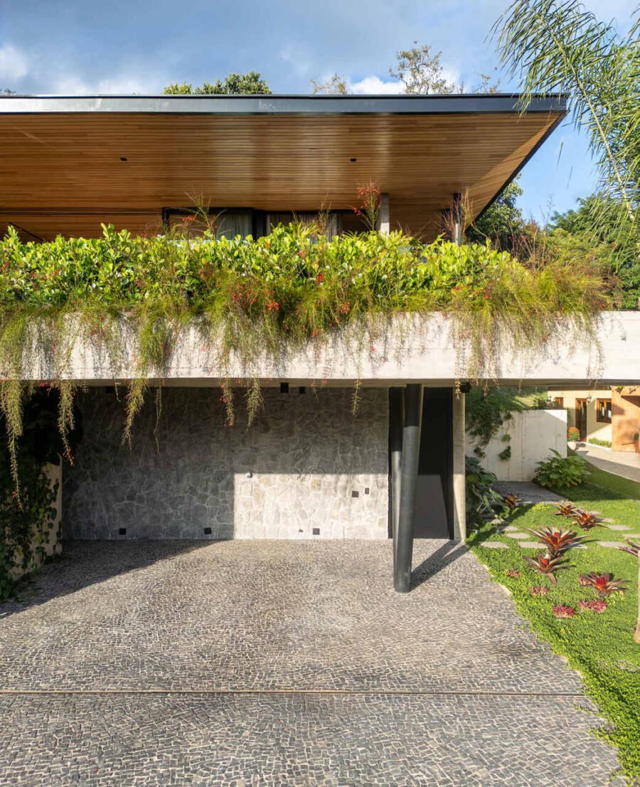 “Essa dupla condição de implantação se traduz em um desafio volumétrico que se tornou a linguagem do projeto: a residência parece ser térrea quando vista do bosque, mas revela dois pavimentos do lado oposto, pela via de acesso. Cada fachada reflete condicionantes distintas — luz, escala, usos — como se fossem dois projetos sobrepostos.”