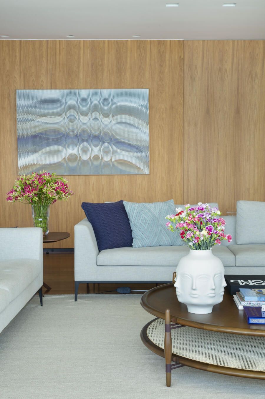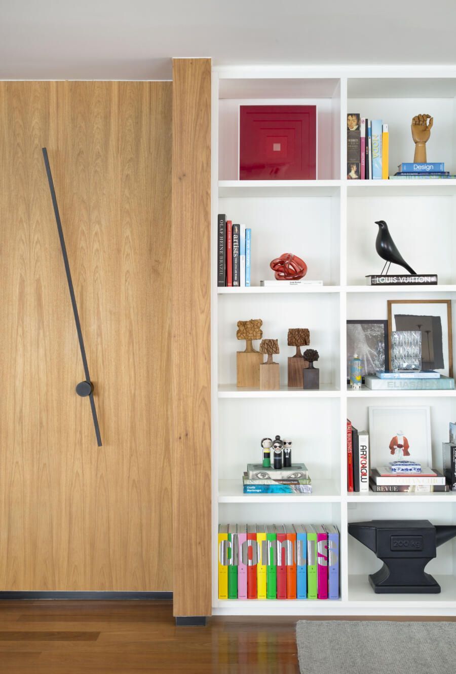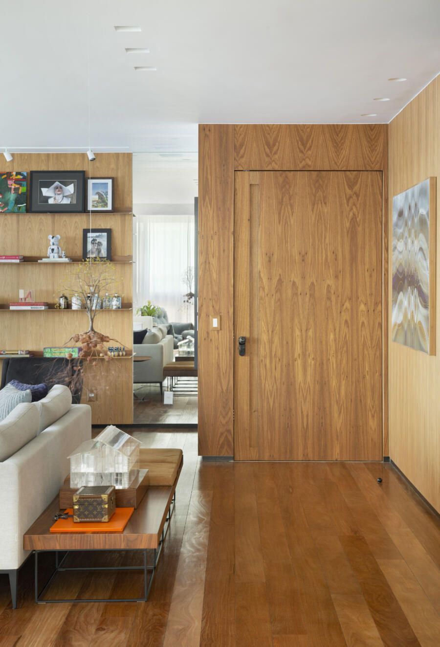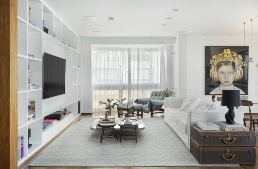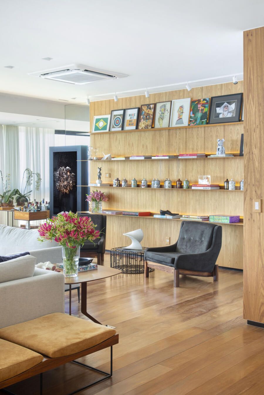 “O tamanho atual da sala é resultado da demolição de um dos quartos, o que ajudou a ampliar ainda mais a área social do apartamento. As paredes mantidas foram forradas com painéis de marcenaria, ora com acabamento em madeira natural ora com pintura branca, deixando os espaços mais acolhedores e propícios para expor e valorizar obras de artistas plásticos consagrados.”