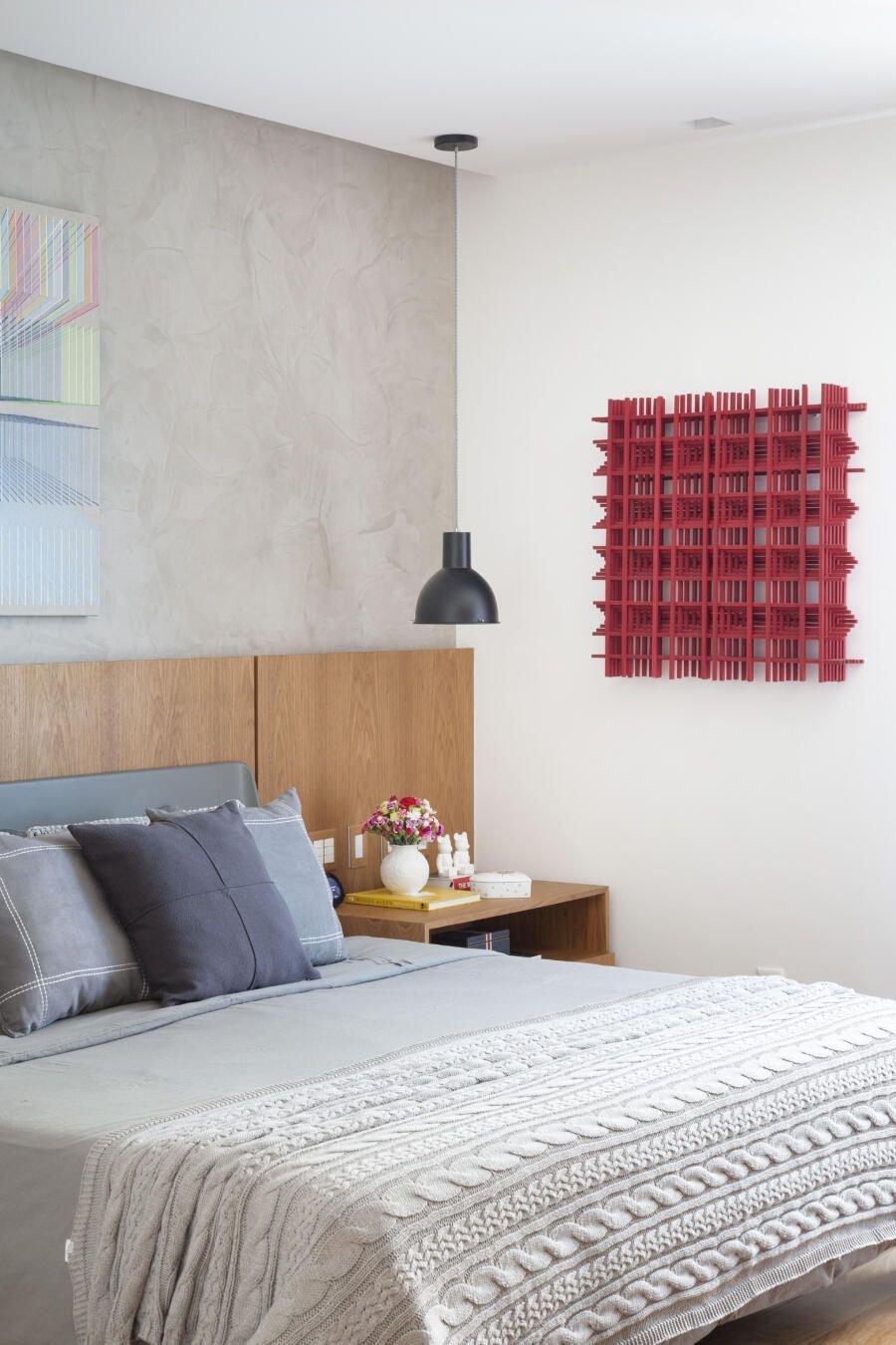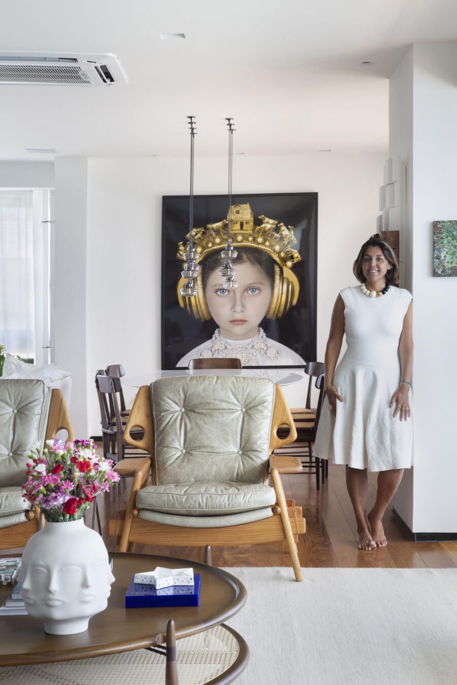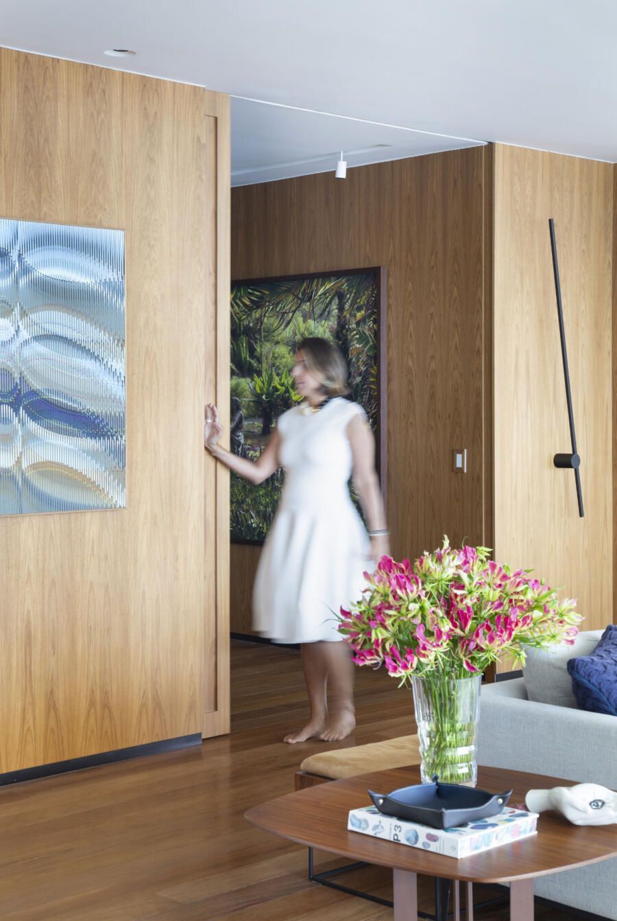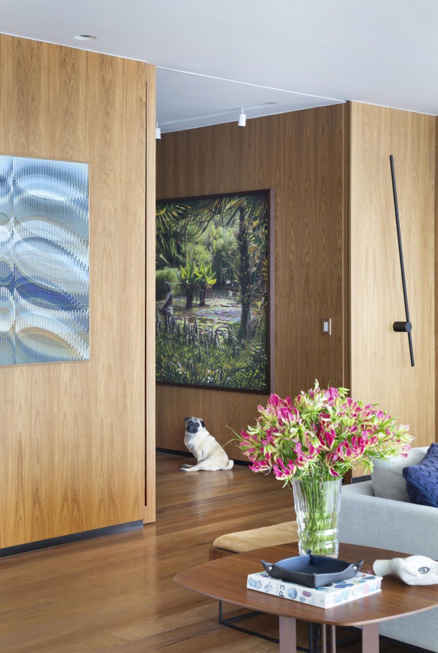 “O tamanho atual da sala é resultado da demolição de um dos quartos, o que ajudou a ampliar ainda mais a área social do apartamento. As paredes mantidas foram forradas com painéis de marcenaria, ora com acabamento em madeira natural ora com pintura branca, deixando os espaços mais acolhedores e propícios para expor e valorizar obras de artistas plásticos consagrados.”