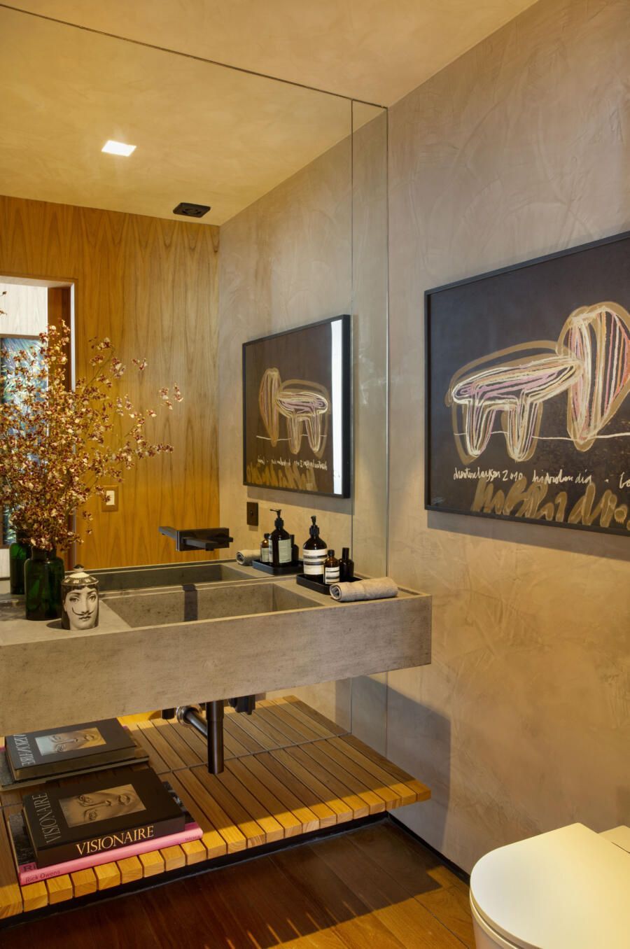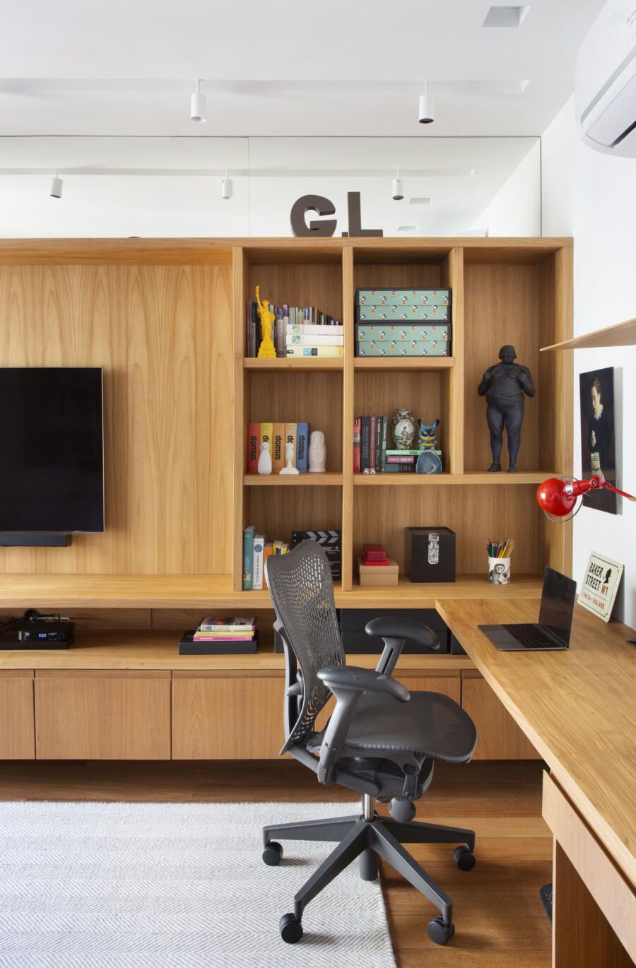 “O projeto é repleto de luzes indiretas, buscando valorizar a marcenaria de traços limpos desenhada por mim, e claro, as obras de arte do casal espalhadas pelo apartamento, que resgatam constantemente a memória afetiva dos moradores.”