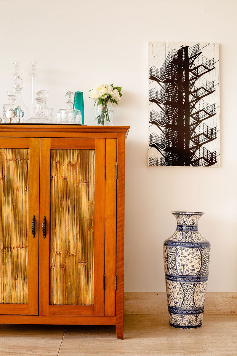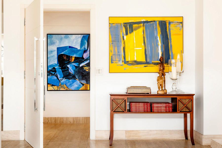 O apartamento tem uma paleta de cores neutras, materiais nobres e superfícies claras. Já a decoração imprime a personalidade e a história da família, com objetos marcantes e quadros e esculturas com cores vibrantes.