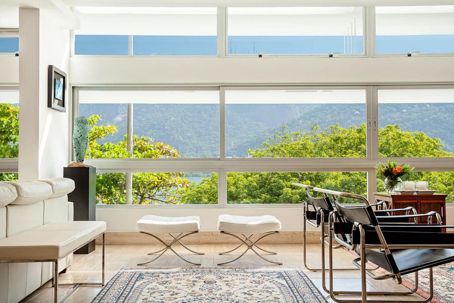 Outro recurso utilizado foi o de revestir com espelhos, em sua totalidade, a parede de fundo da sala de jantar, pois além de ter trazido a luz natural para o interior do recinto, refletiu a bela paisagem da Lagoa.
