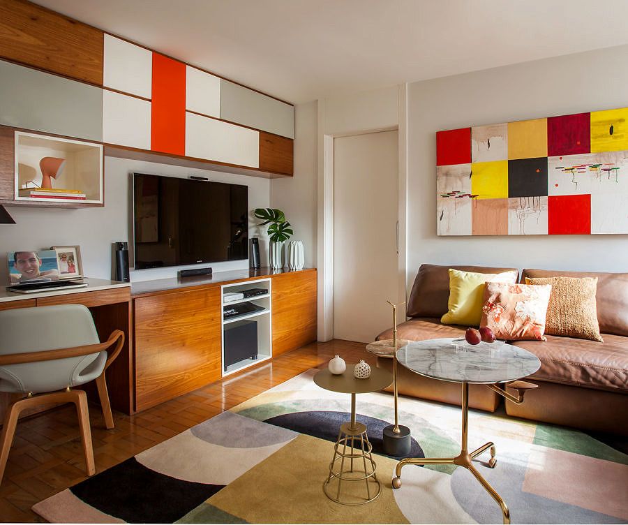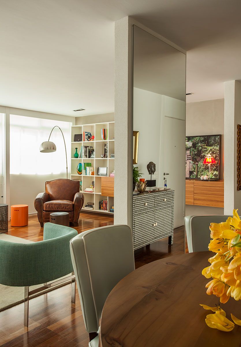 O apartamento dos anos 70, tem uma planta ortogonal, que permitiu mudanças para abertura e ampliação dos espaços, resultando em uma geometria bastante interessante e precisa. A decoração acompanha essa geometria nos desenhos de marcenaria assim como no layout de distribuição e formas do mobiliário.