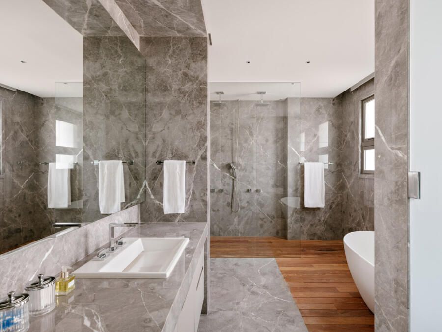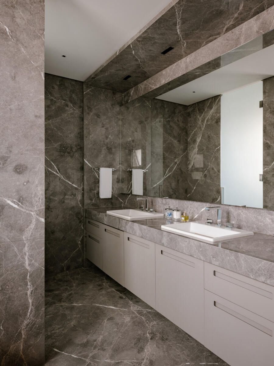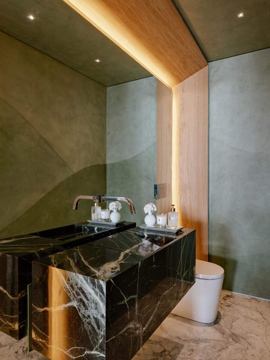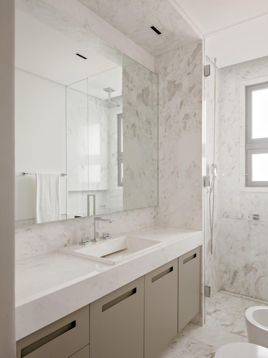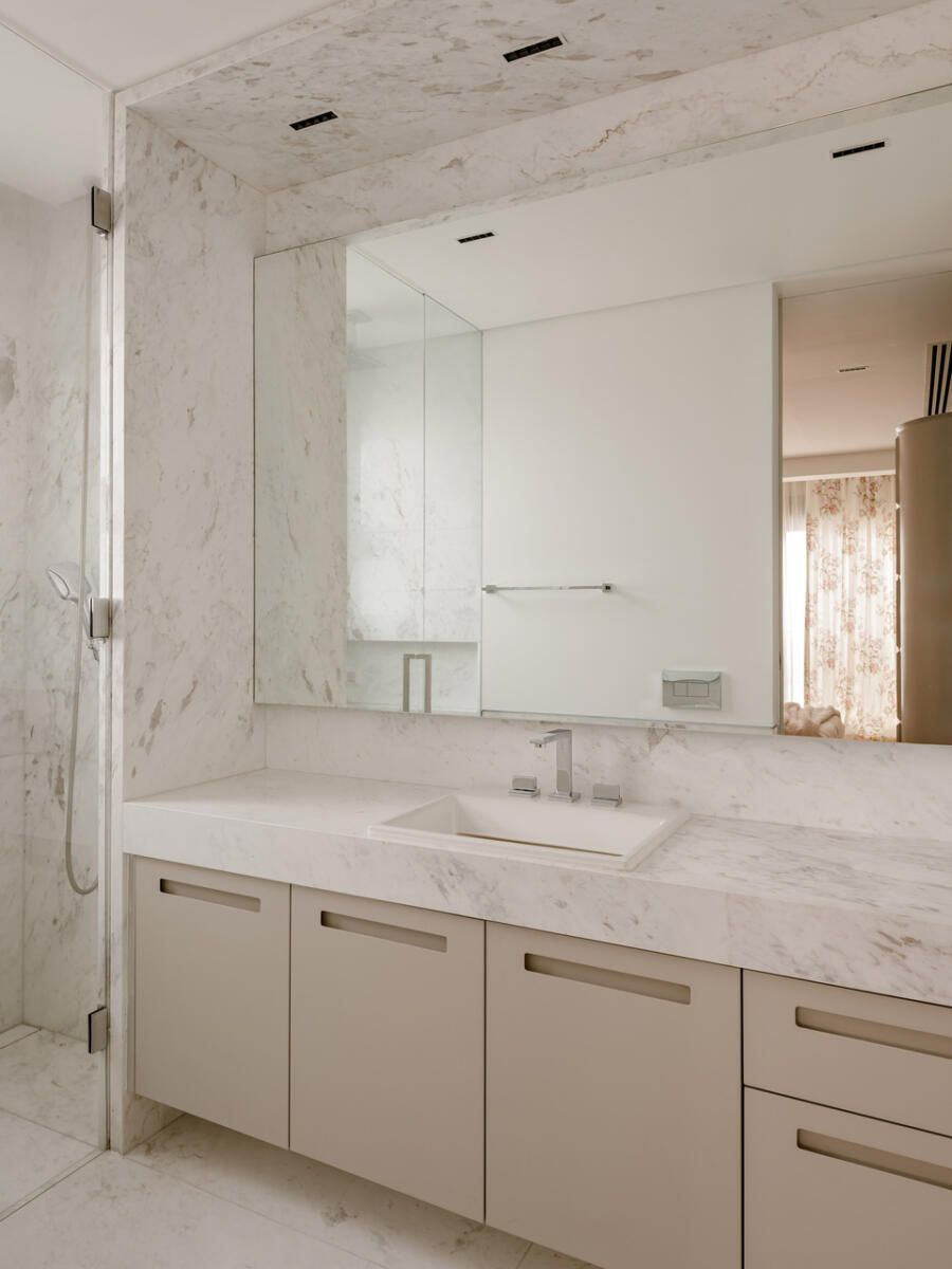A linguagem do projeto é contemporânea e atemporal, valorizando materiais naturais e nobres. O mármore branco Paraná reveste o piso das áreas principais, enquanto a madeira de carvalho aquece o piso e o forro da varanda integrada. Essa combinação de texturas cria uma atmosfera sofisticada sem abrir mão da leveza e do aconchego.