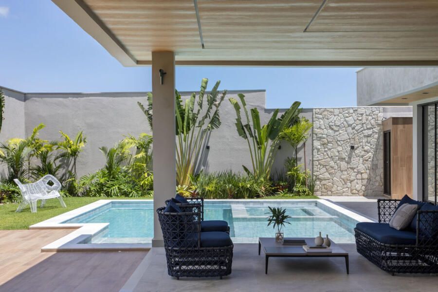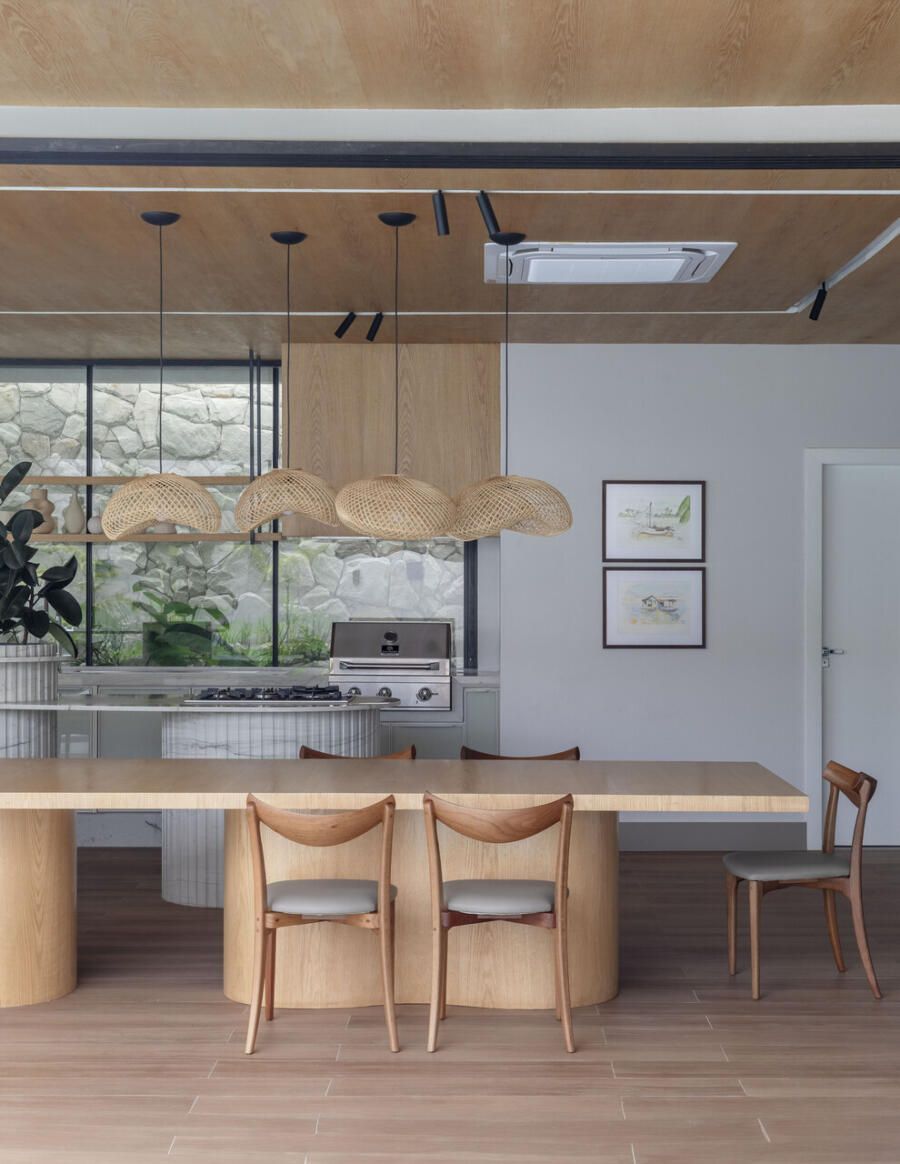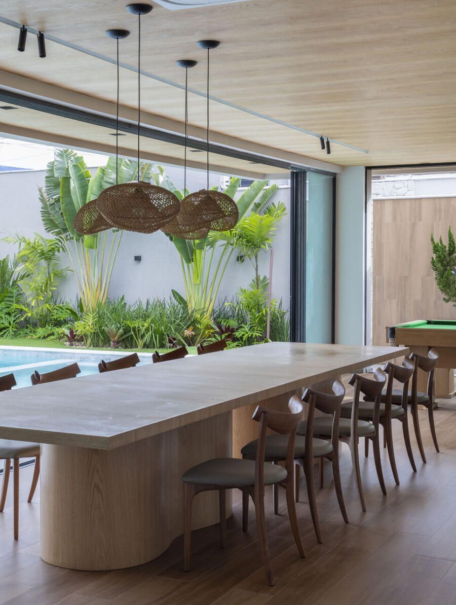 A reforma completa durou 18 meses, e entre os principais pedidos estavam a ampliação da varanda gourmet, a reformulação da área da piscina, a implantação de um paisagismo exuberante e a criação de uma sala de cinema. Atendendo a essas demandas, a dupla desenvolveu um projeto caracterizado pela harmonia entre linhas puras e orgânicas, fluidez espacial, uso de materiais naturais e peças assinadas por designers brasileiros.