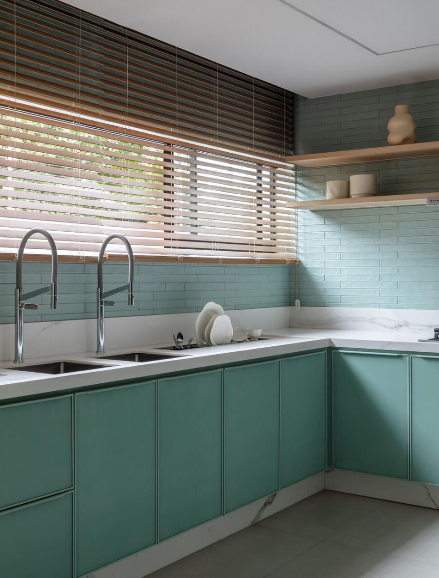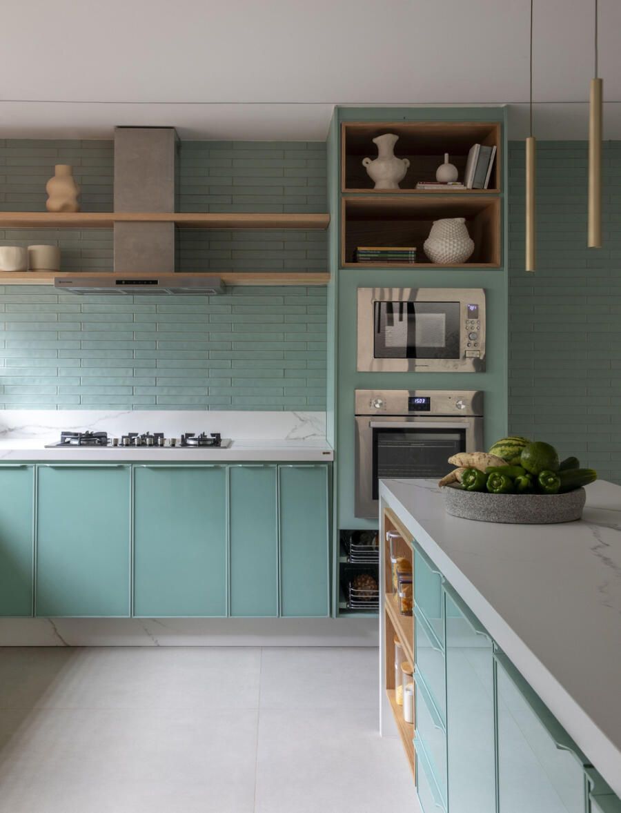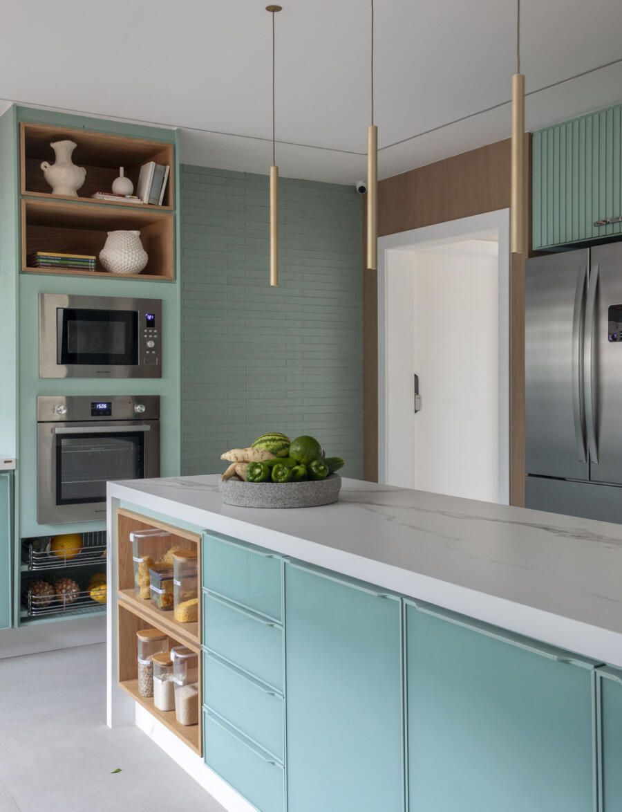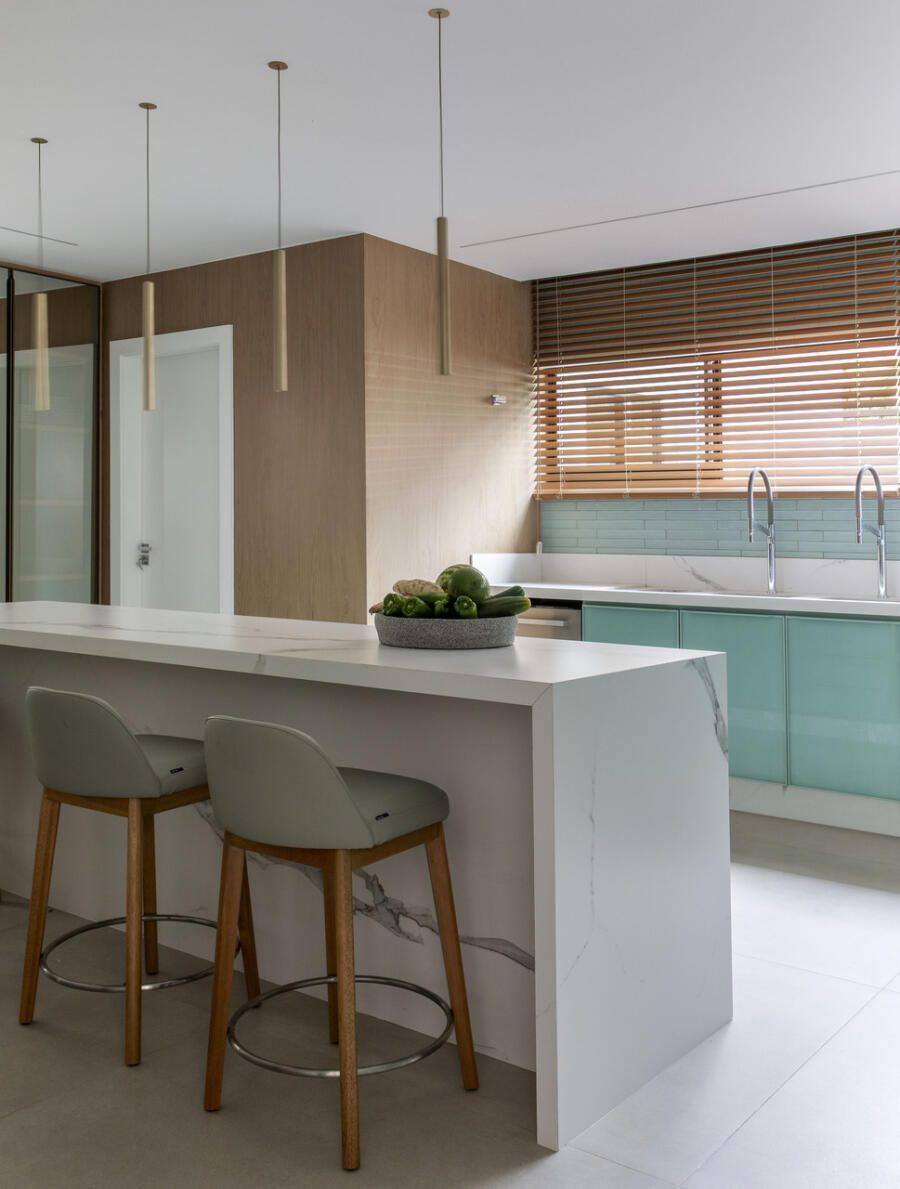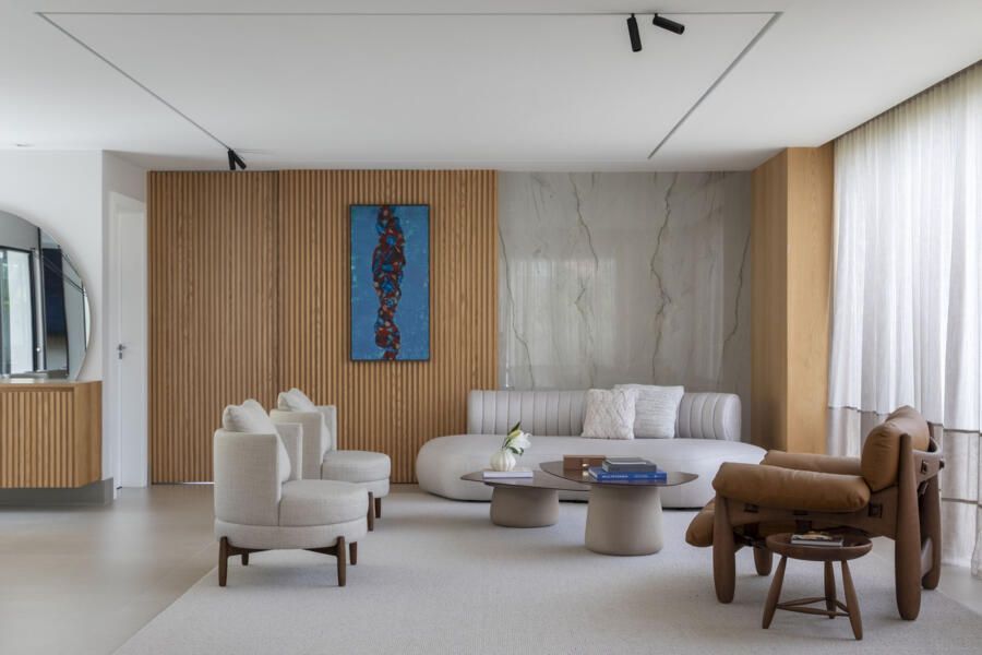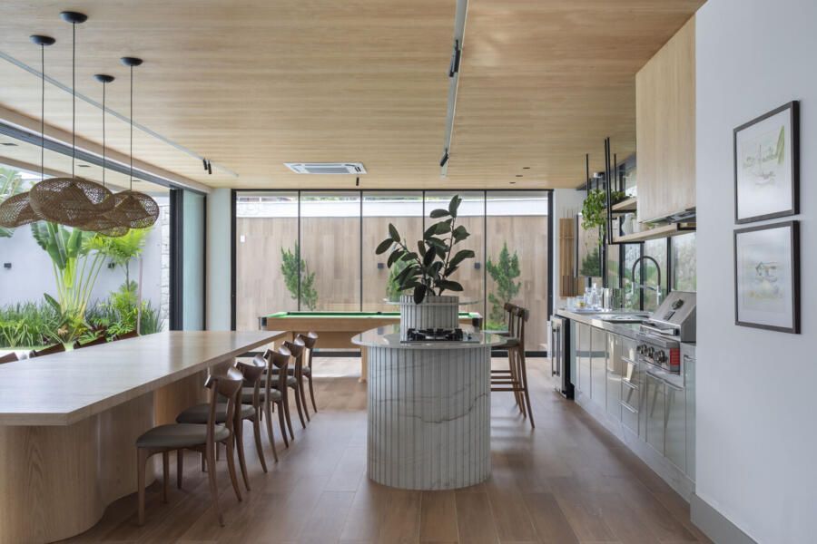 Na paleta da área social, predominam tons neutros e naturais, como marcenaria em carvalho, estofamentos off-white e cinza, piso em porcelanato claro e paredes em tons neutros. Entre os pontos altos estão o espaço gourmet com ilha em quartzito Mont Blanc e luminárias de fibras naturais, a cozinha funcional com tons coordenados de verde entre marcenaria e revestimentos, e a sala de jantar integrada ao jardim interno.
