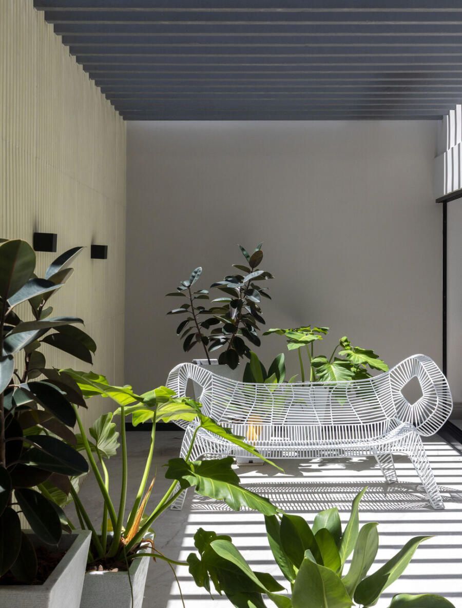 A decoração foi inteiramente renovada, desde o mobiliário solto às marcenarias desenhadas sob medida, passando por tapetes, luminárias e objetos. As áreas sociais internas destacam peças de design assinado, como a mesa Concrete Disforme (Estudiobola), a poltrona Calisto (Junior Brandão), além da icônica poltrona Mole e do banco Mocho, ambos de Sergio Rodrigues.