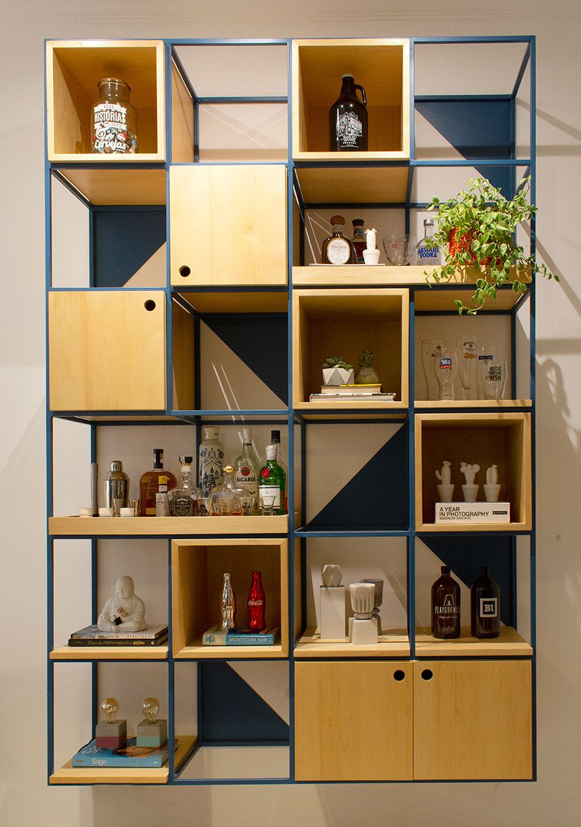 A sala é multiuso, tem uma mesa de jantar, uma área confortável para ver TV, um local para armazenar as louças e um bar. Para isso, o escritório desenvolveu uma estante polivalente que comporta os livros e objetos e também serve de bar e aparador.