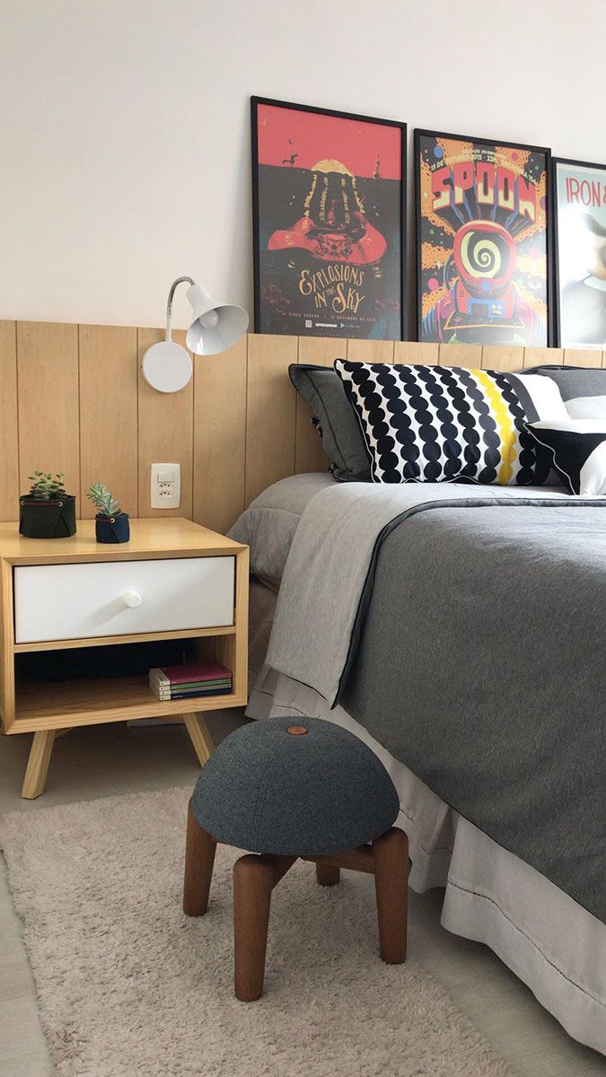 No quarto o escritório escolheu uma base mais neutra, pontuando elementos com padronagens e cores mais fortes em objetos que podem ser substituídos, tornando o espaço versátil, conforme o gosto do cliente.