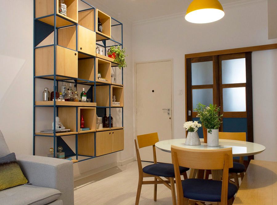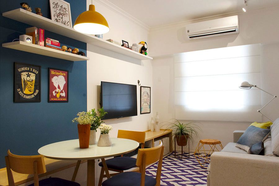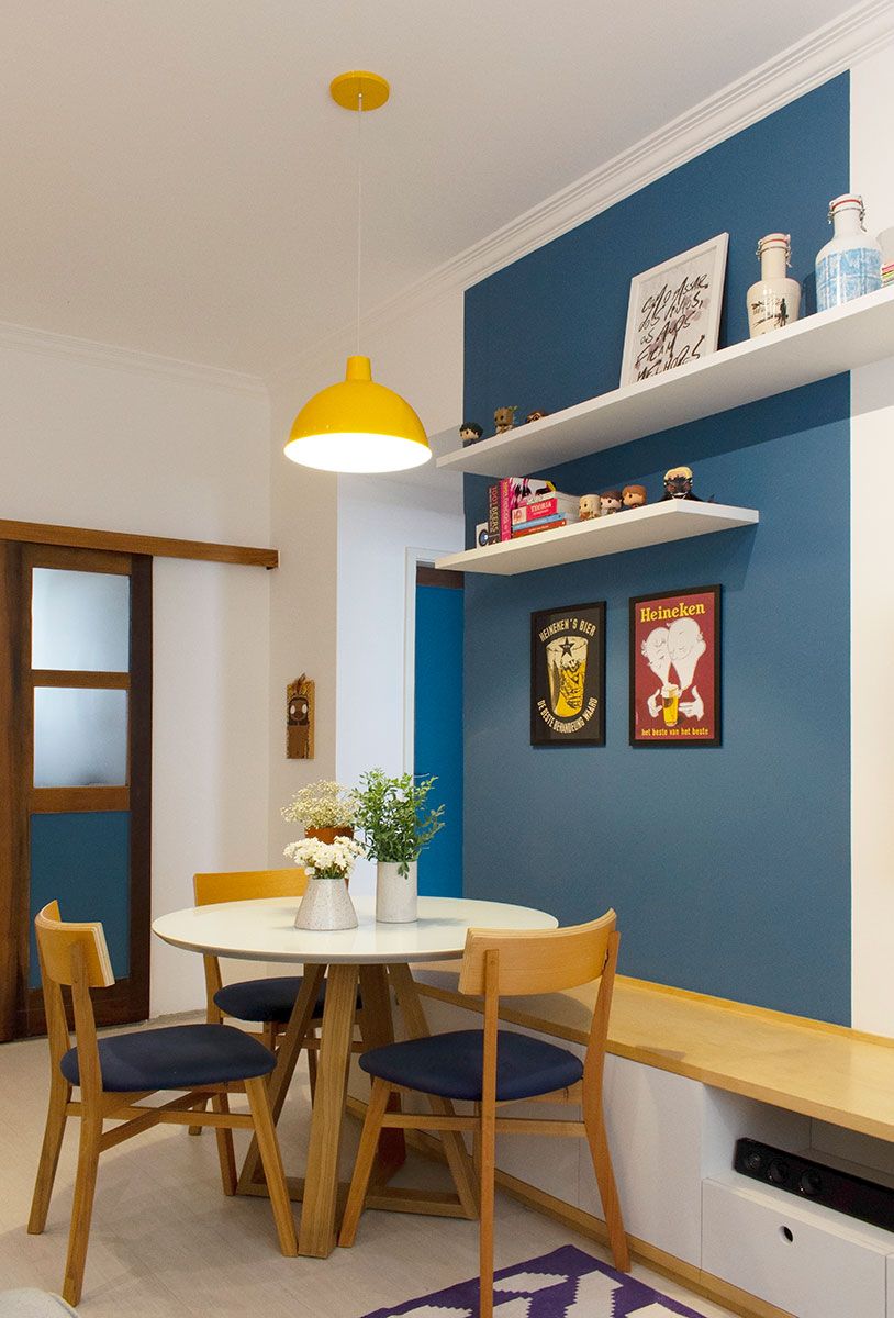 A cor azul, além de delimitar a área da mesa de jantar, também foi disposta em vários elementos e objetos de forma a conectar e trazer harmonia ao espaço.