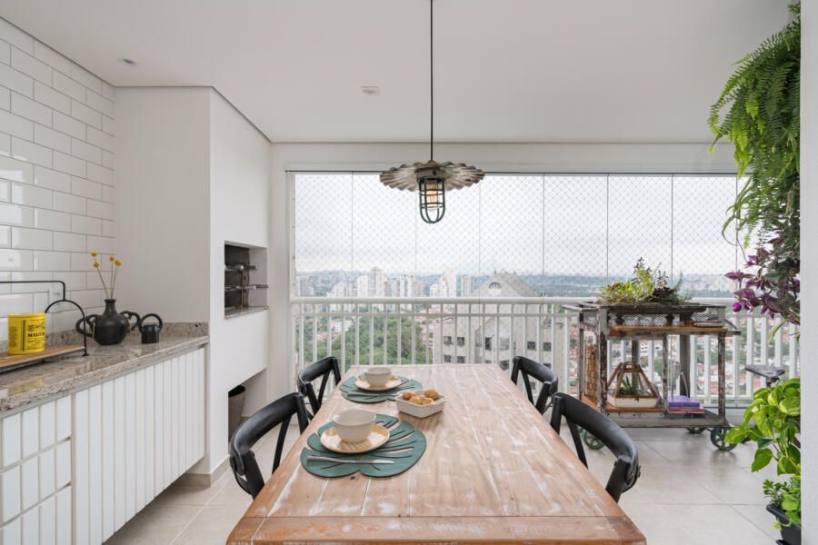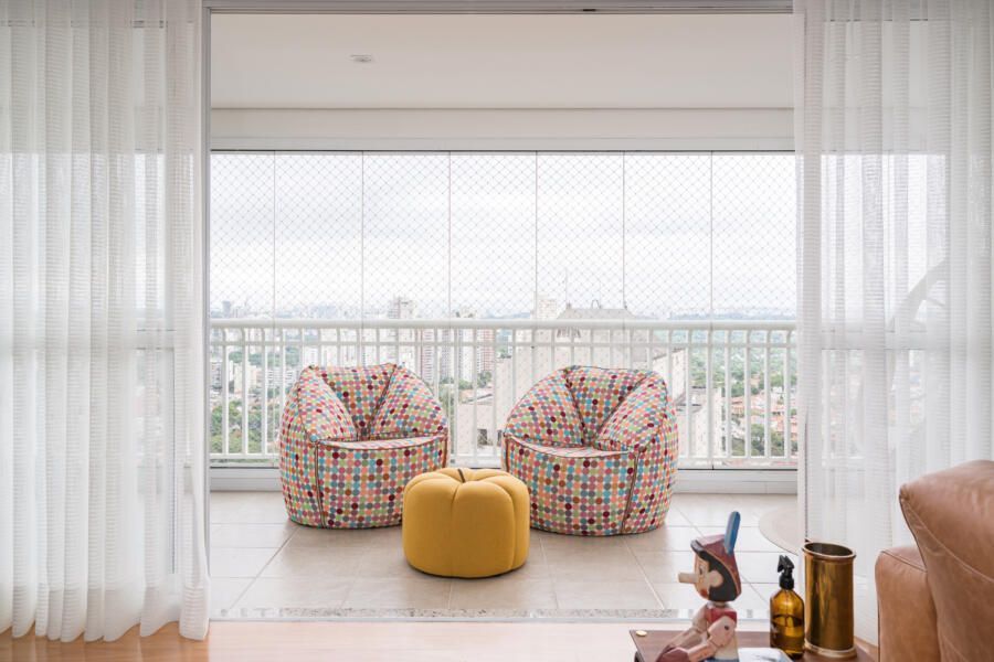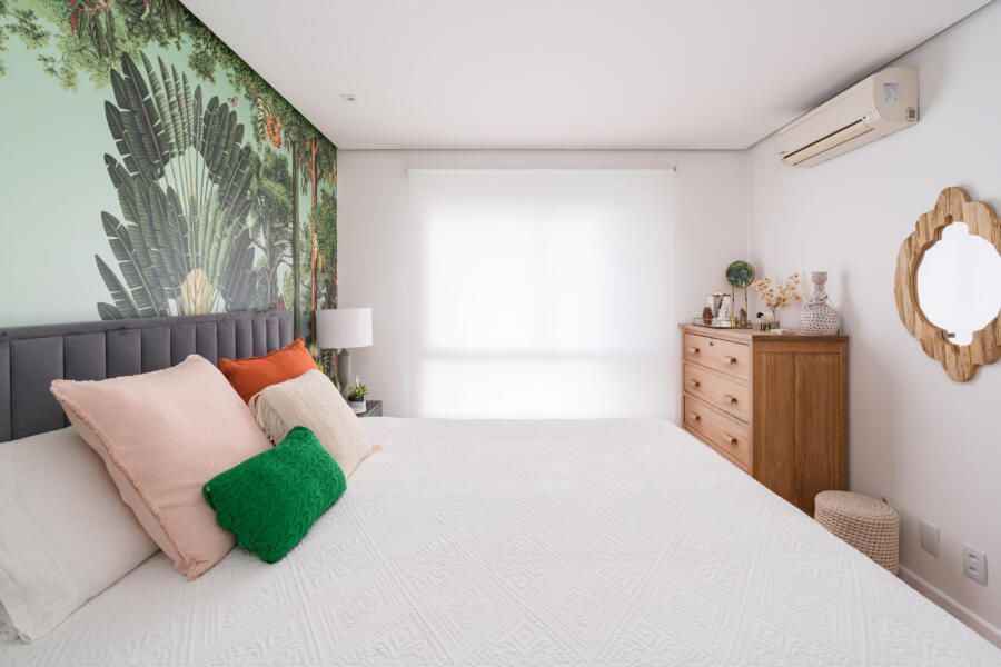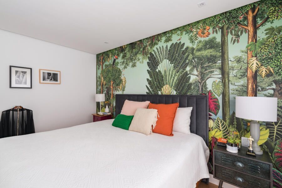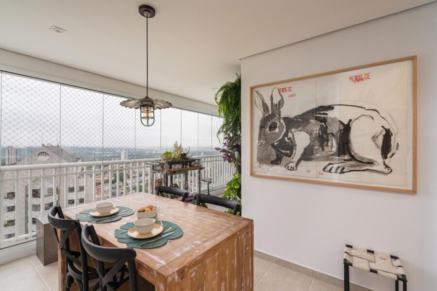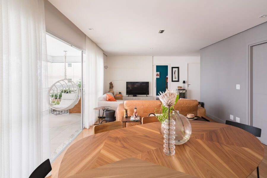 “Por ser um apartamento alugado, o casal queria investir o mínimo em itens fixos. Além disso, o prazo da obra deveria ser o menor possível, pois estavam morando de aluguel em um outro imóvel e tinham um prazo reduzido para realizar a mudança. Nesse contexto, optamos por realizar alterações mínimas e de rápida execução, mas que ao mesmo tempo gerassem um efeito completamente novo nos espaços. Os moradores gostam bastante de peças de design e de um mobiliário confortável, atemporal e cheio de estilo. Assim, apostamos em itens não fixos e trabalhamos as cores, texturas e paisagismo.”