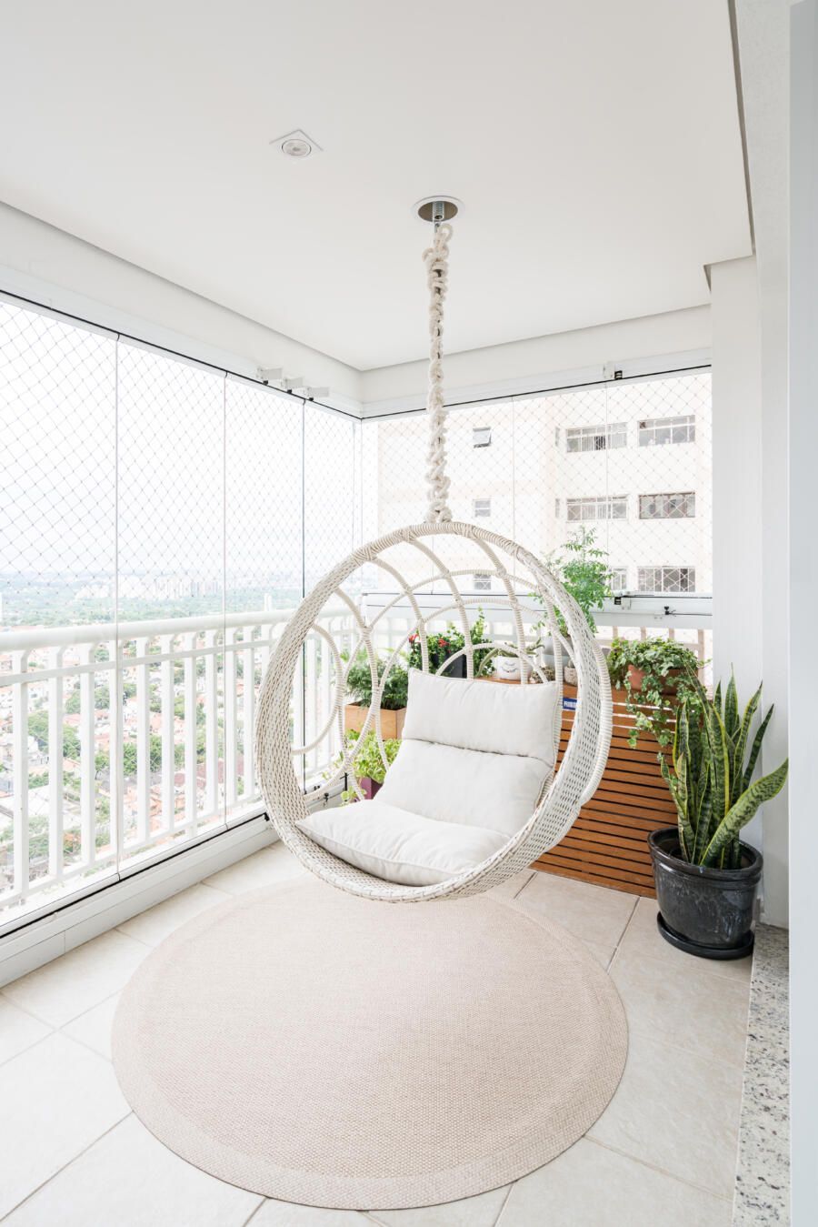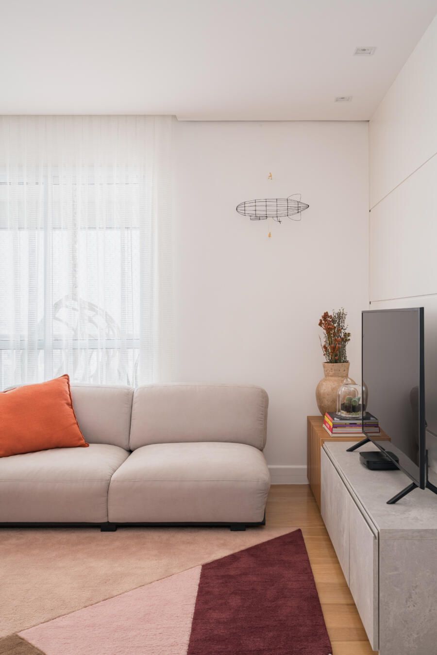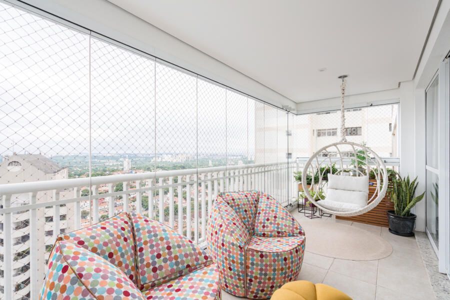 “Por ser um apartamento alugado, o casal queria investir o mínimo em itens fixos. Além disso, o prazo da obra deveria ser o menor possível, pois estavam morando de aluguel em um outro imóvel e tinham um prazo reduzido para realizar a mudança. Nesse contexto, optamos por realizar alterações mínimas e de rápida execução, mas que ao mesmo tempo gerassem um efeito completamente novo nos espaços. Os moradores gostam bastante de peças de design e de um mobiliário confortável, atemporal e cheio de estilo. Assim, apostamos em itens não fixos e trabalhamos as cores, texturas e paisagismo.”