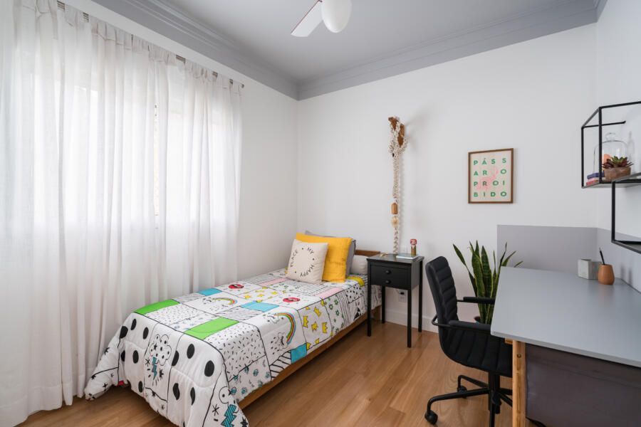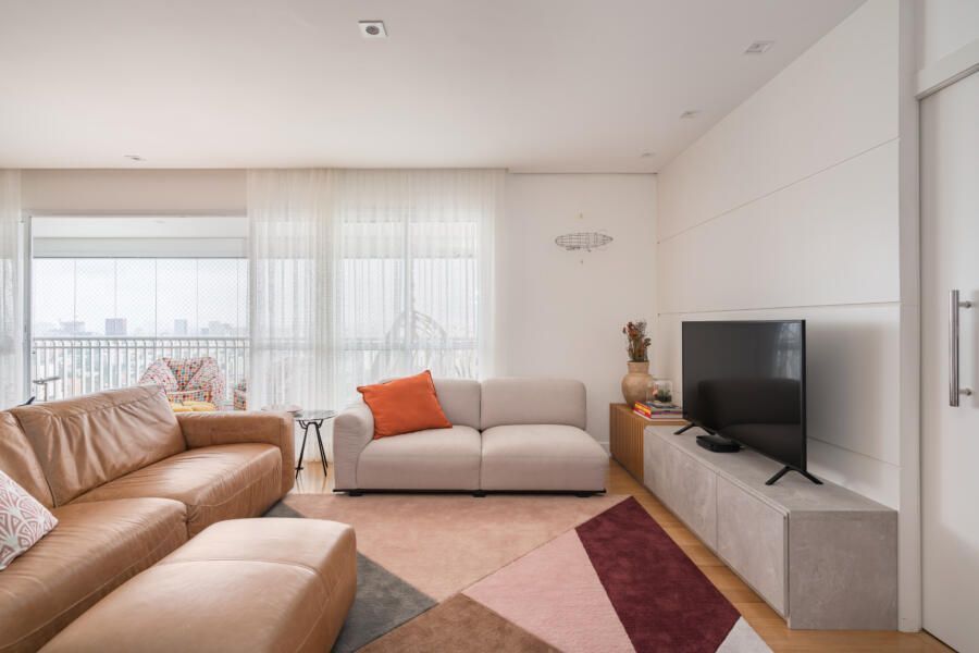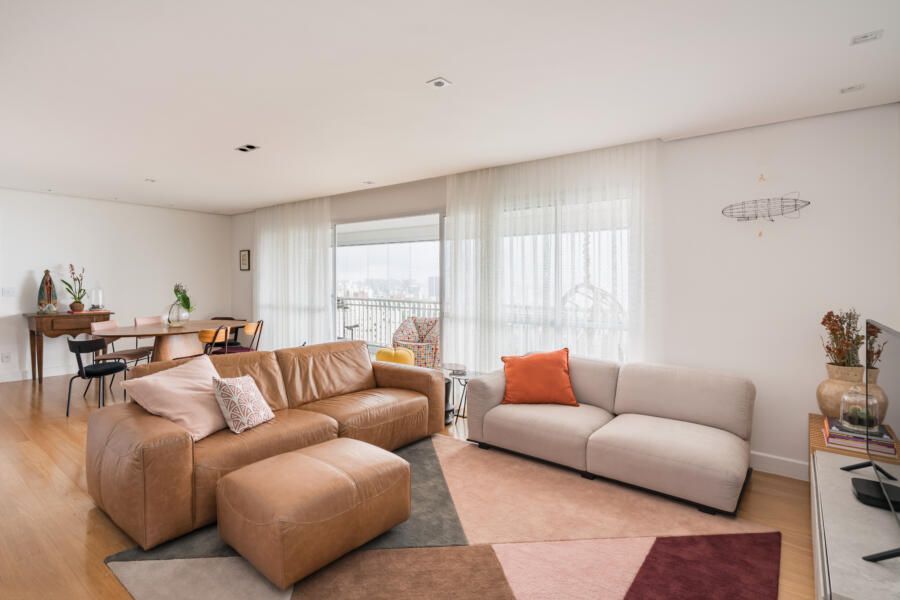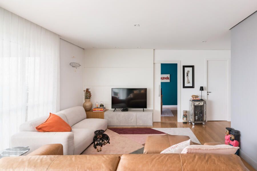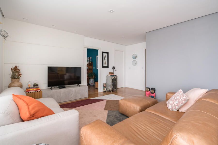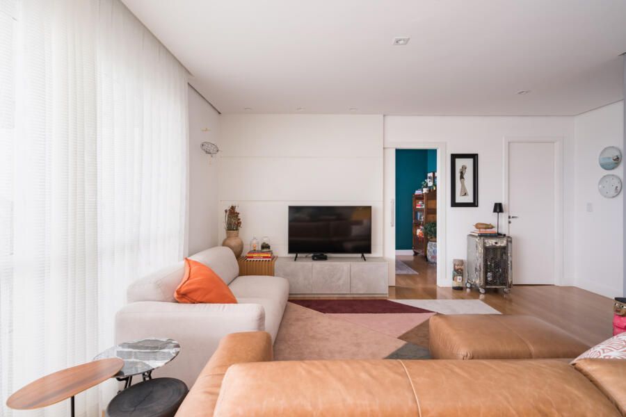 “De maneira geral, executamos a pintura de todo o apartamento e tratamos o piso de madeira existente com raspagem, calafetação e aplicação de verniz. Também atualizamos a iluminação ao trocar todas as lâmpadas por LED e ao adicionar mais alguns pontos no forro de gesso.”