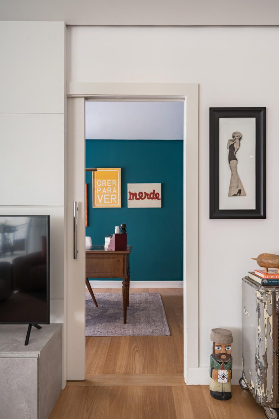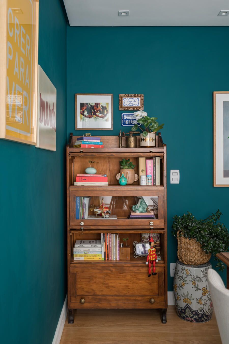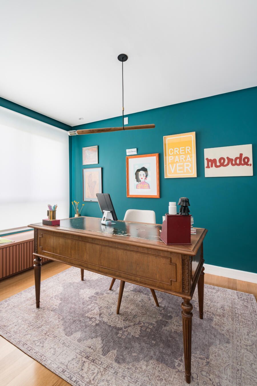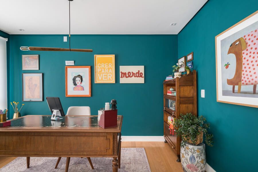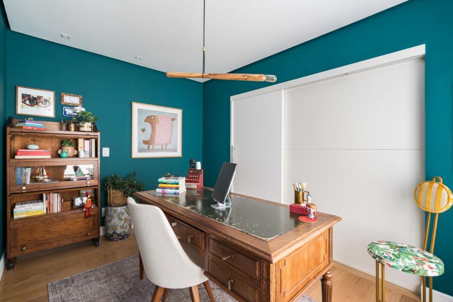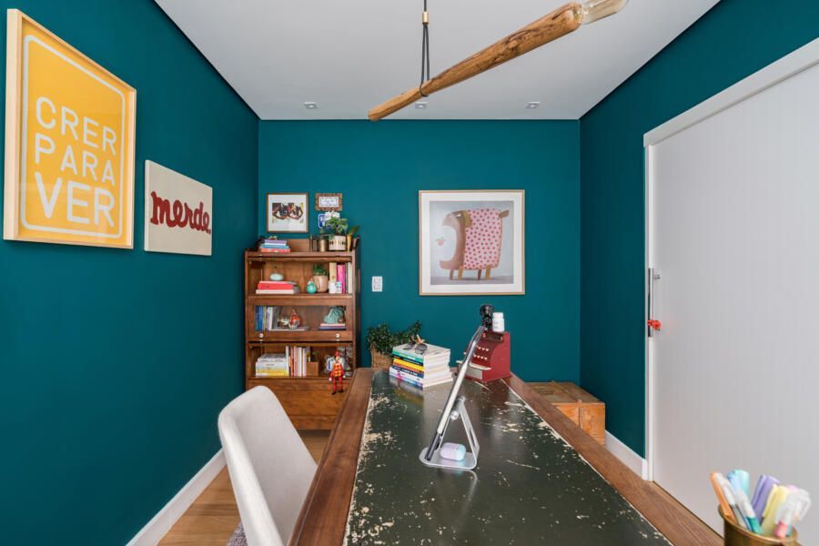 “A base do projeto tem uma paleta clara, pintamos o apartamento todo de branco, porém alguns ambientes receberam uma cor mais forte e marcante propositalmente, como é o caso do escritório que é todo verde e o lavabo, terracota. Esses tons também se repetem em detalhes na decoração da varanda e da sala. A cristaleira, a mesa do escritório, o aparador na sala de jantar e alguns quadros são exemplos de peças antigas que fazem parte da coleção da sogra da moradora, ex- dona de antiquário.”