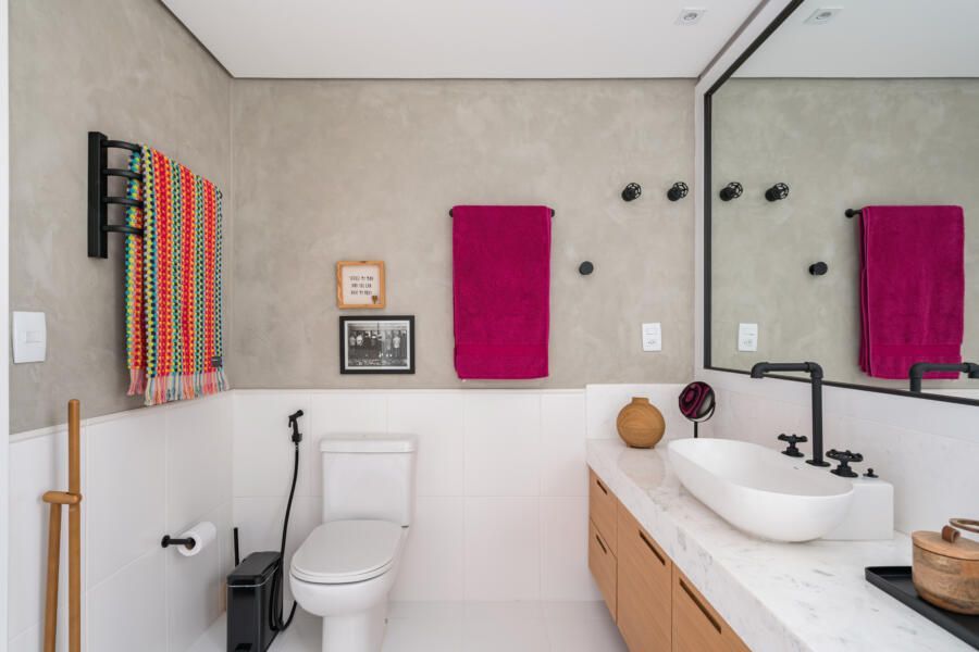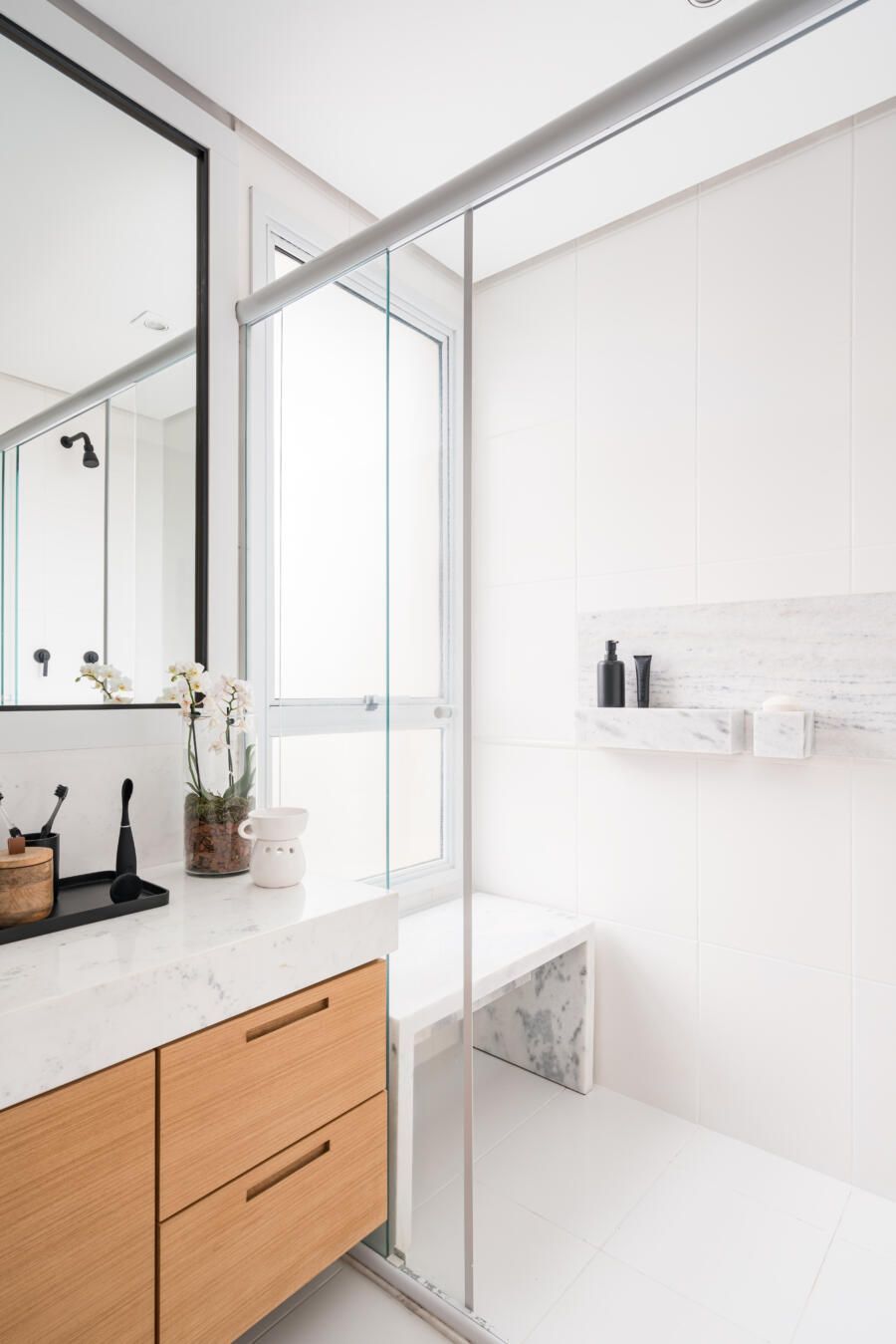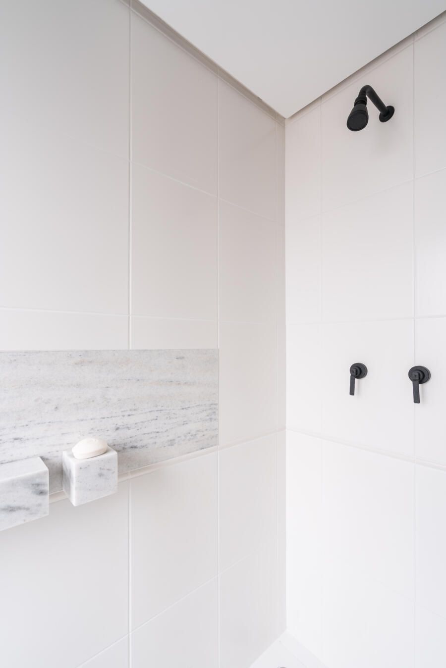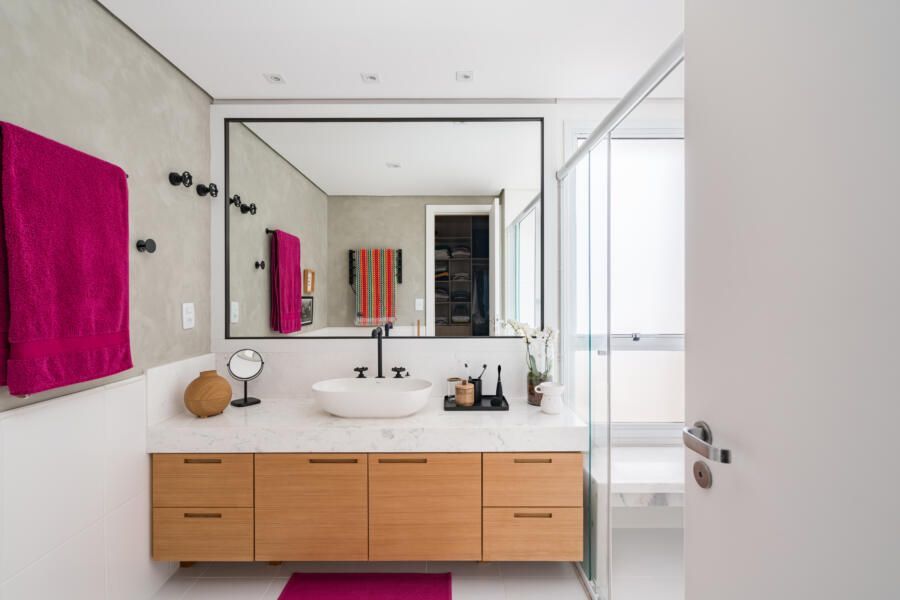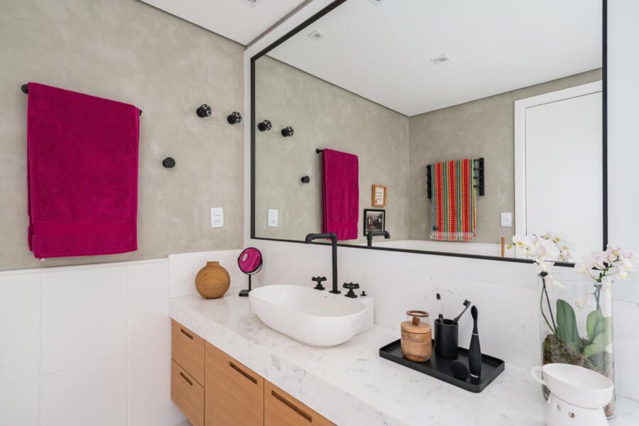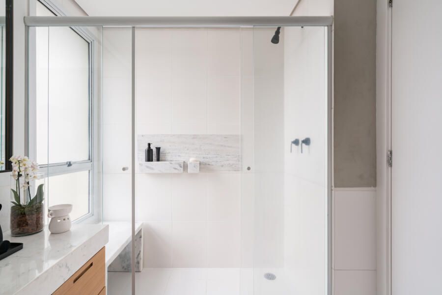 “Em cima do espelho existente executamos uma moldura para esconder a oxidação que aparecia nas bordas e desenhamos um novo gabinete, pois não existia nada ali. Além disso, criamos um nicho no box do banheiro do casal. Inicialmente planejávamos executá-lo da forma convencional, através do recorte na alvenaria e posterior instalação do nicho pronto de mármore. Porém, a partir do momento em que começamos a demolição, notamos que toda a parede era estrutural, ou seja, não seria possível executar o nicho ali. Como já havíamos removido parte dos azulejos da construção original e não tínhamos nenhum modelo igual para repor, optamos por desenvolver um desenho diferente para solucionar o problema. Assim, foi feita uma placa de mármore estruturada com 2 módulos sobressalentes para apoio dos produtos. Ficou super funcional, diferente do convencional e os clientes amaram o resultado.”
