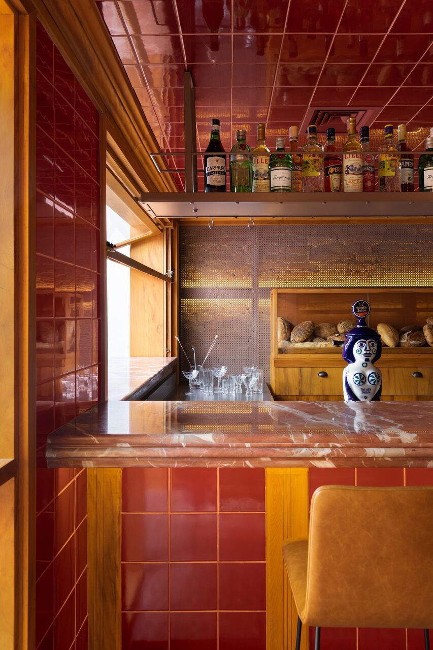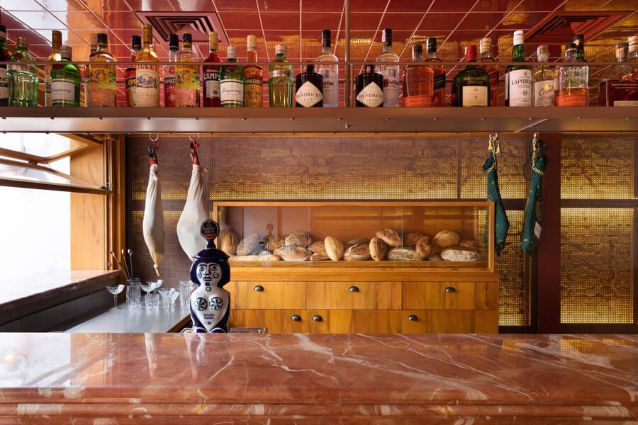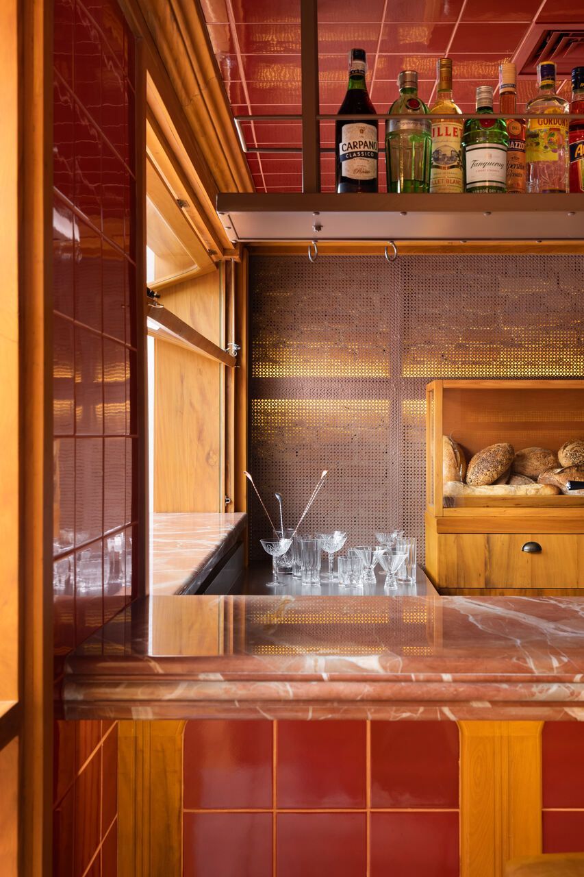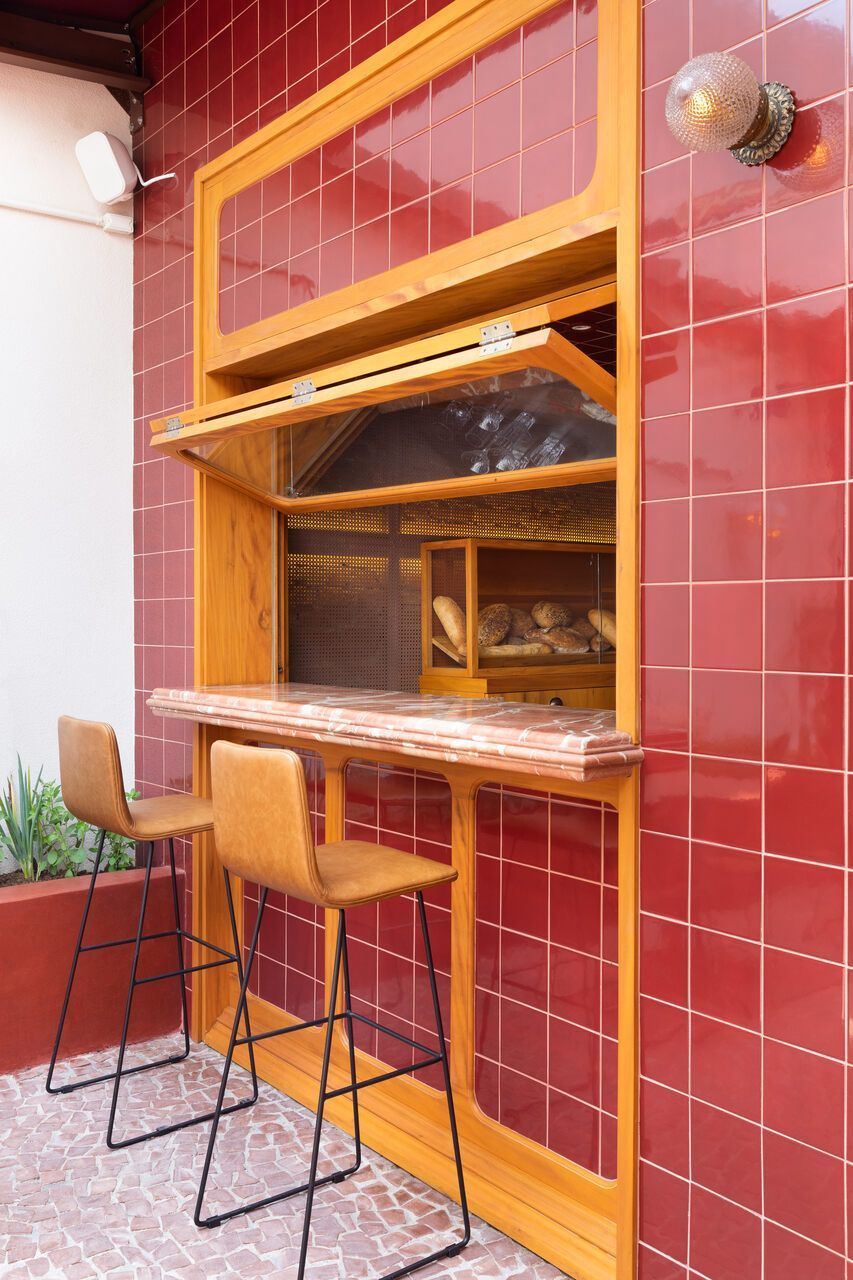 “Um armário de madeira especialmente desenhado para o projeto é também vitrine para o armazenamento e exposição dos pães do cardápio e, na sua frente, sobre a bancada de mármore vermelho, uma prateleira alta e fixada no teto serve para a mostra das garrafas de bebidas.”