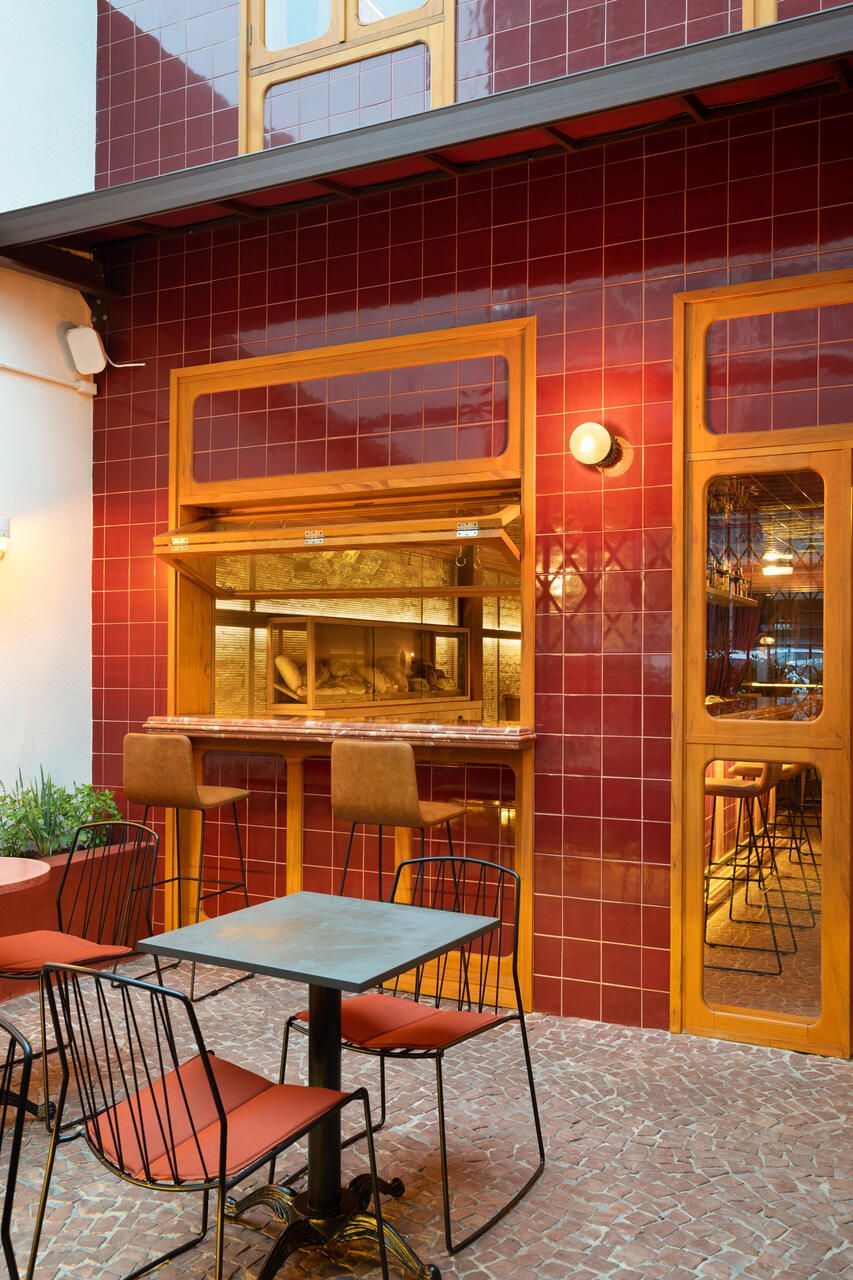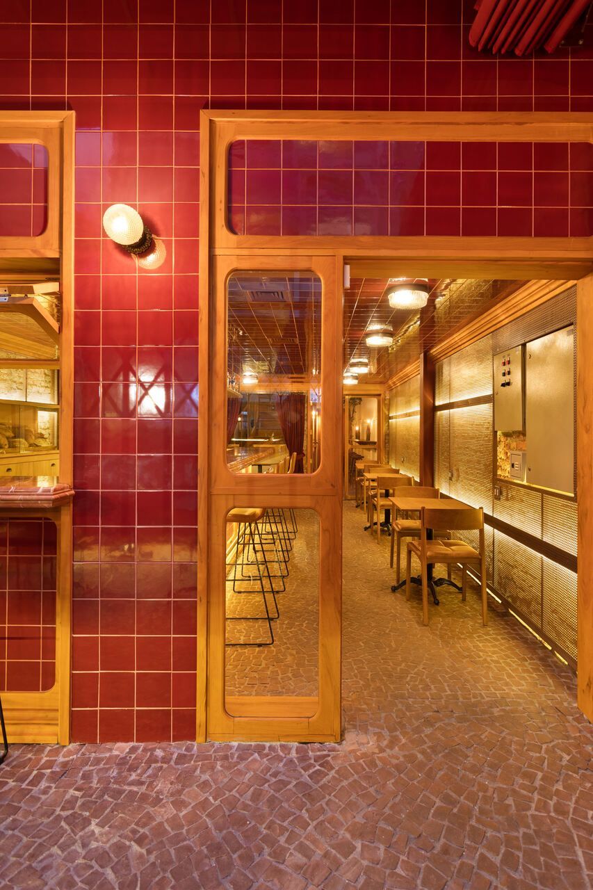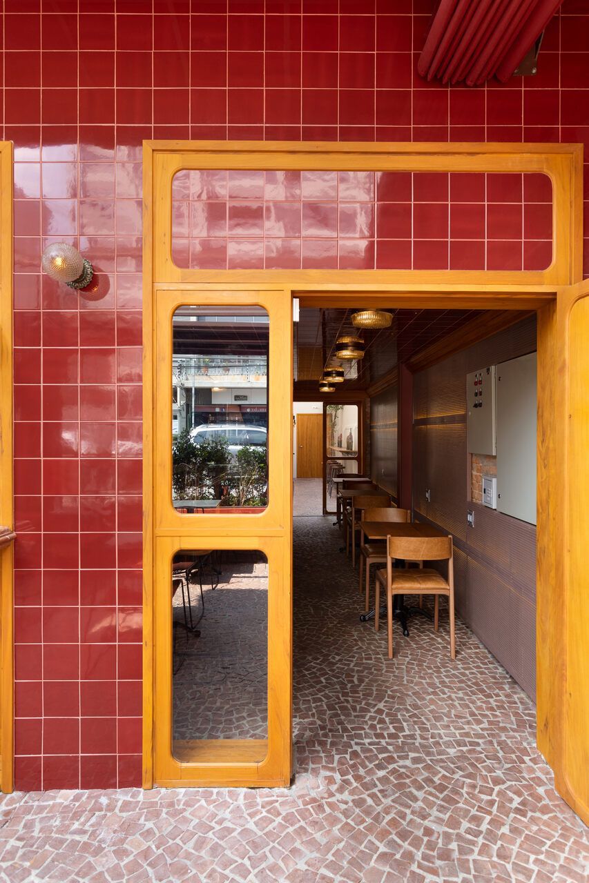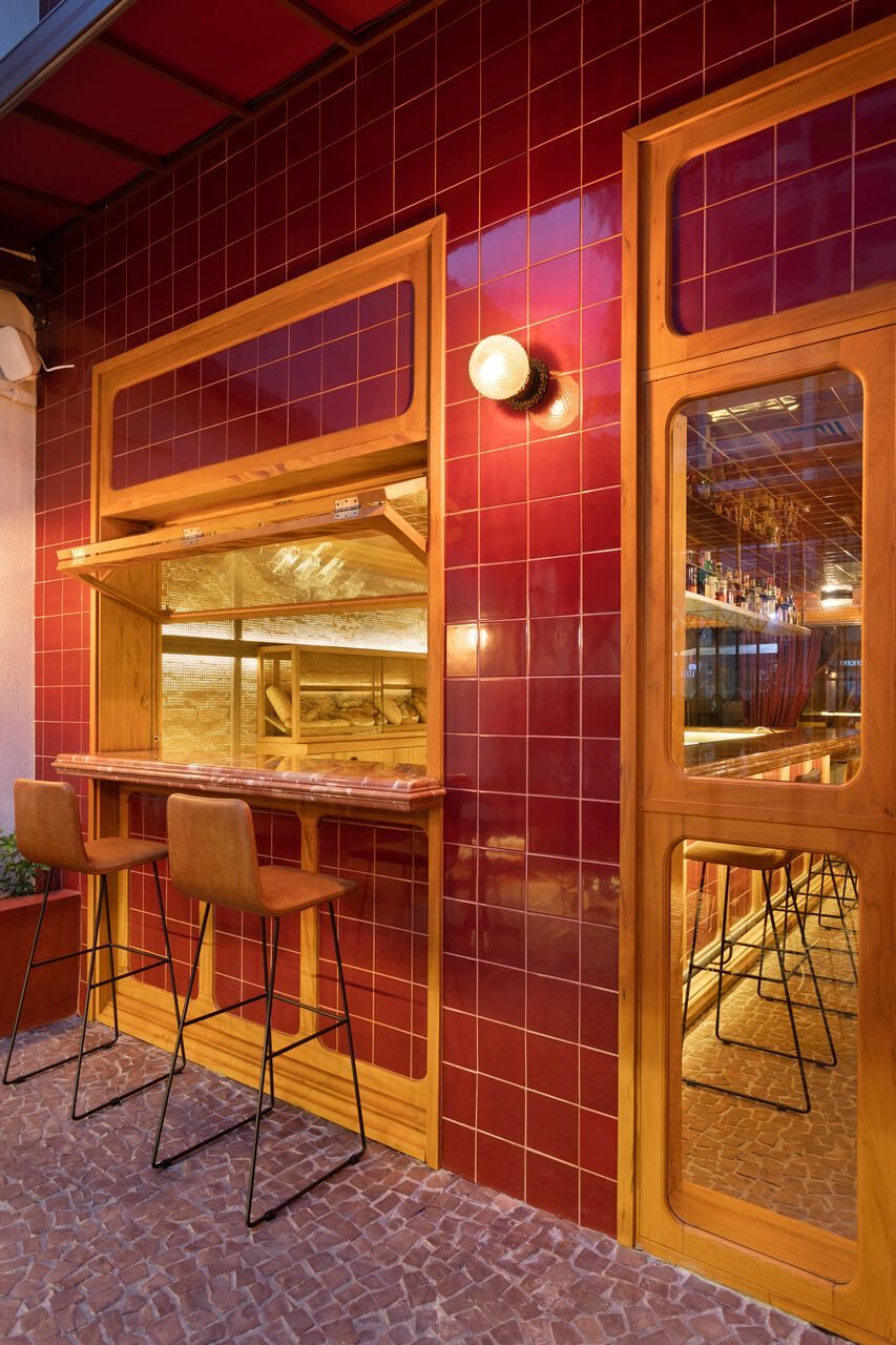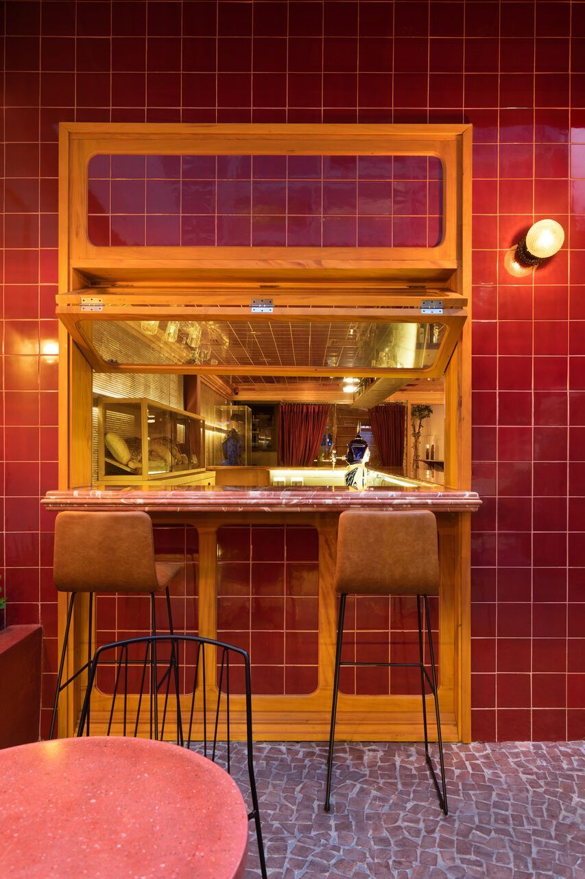 Já na entrada é possível perceber a dramaticidade do projeto com a fachada revestida por azulejos vermelhos intensos e brilhantes. Esses mesmos azulejos também se encontram no balcão do bar e no teto do salão central, criando continuidade. No piso, destaque para o mosaico português.