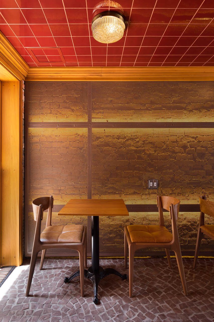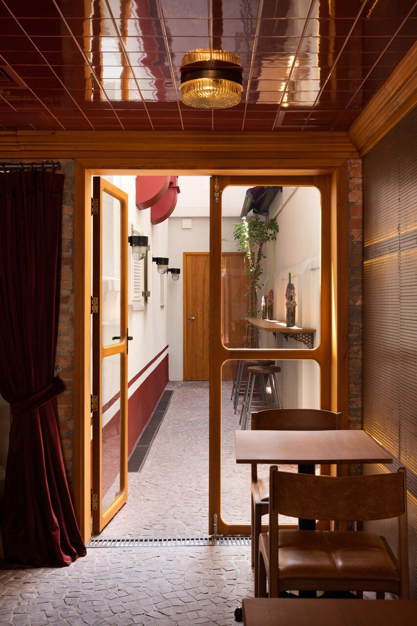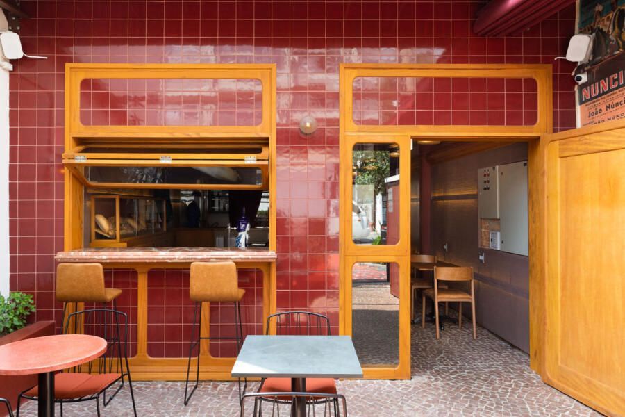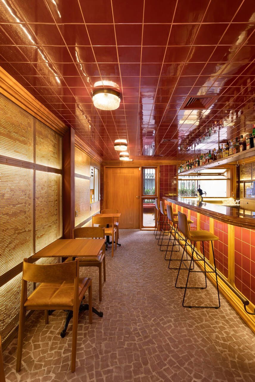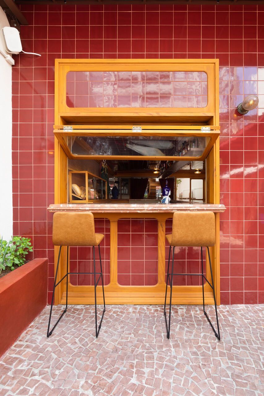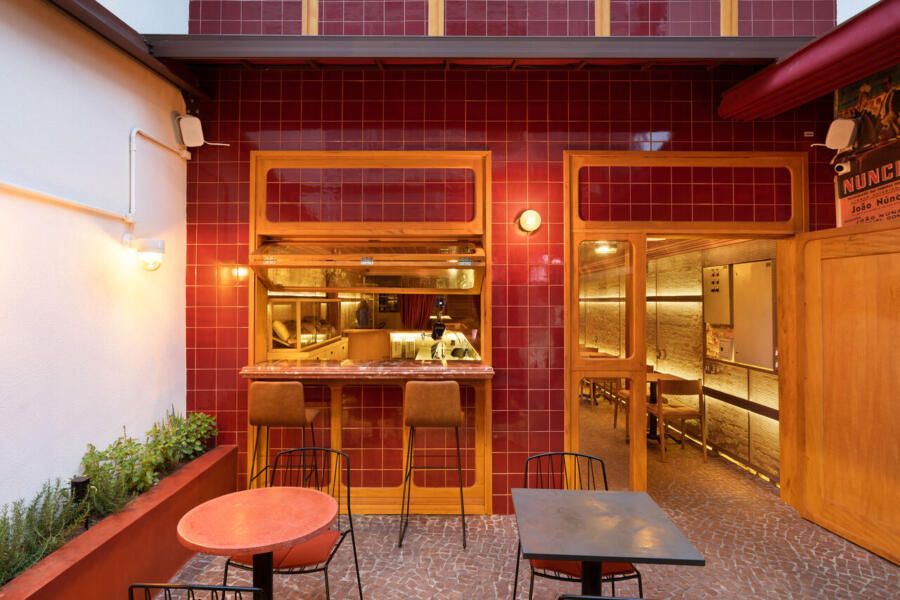 Já na entrada é possível perceber a dramaticidade do projeto com a fachada revestida por azulejos vermelhos intensos e brilhantes. Esses mesmos azulejos também se encontram no balcão do bar e no teto do salão central, criando continuidade. No piso, destaque para o mosaico português.