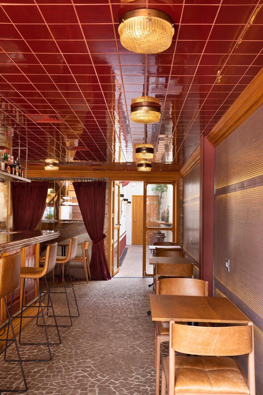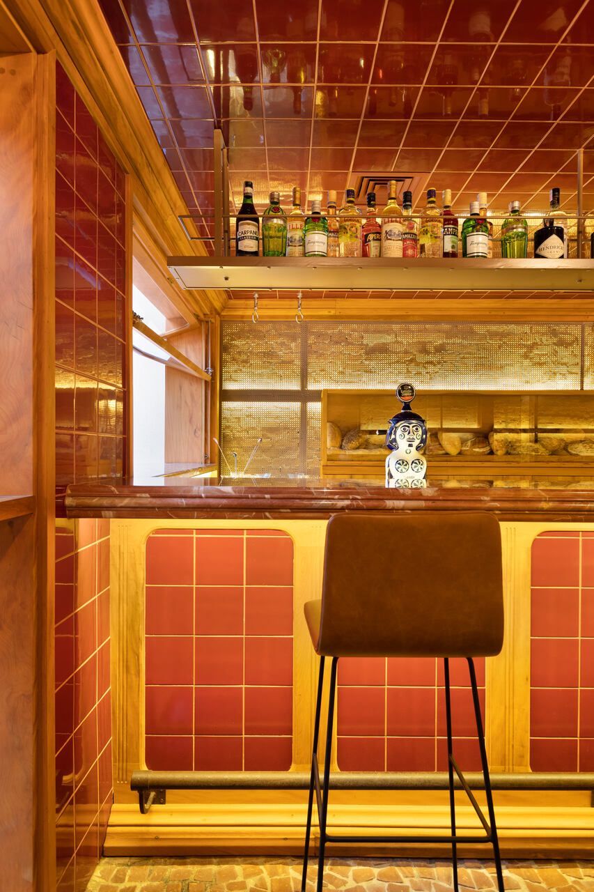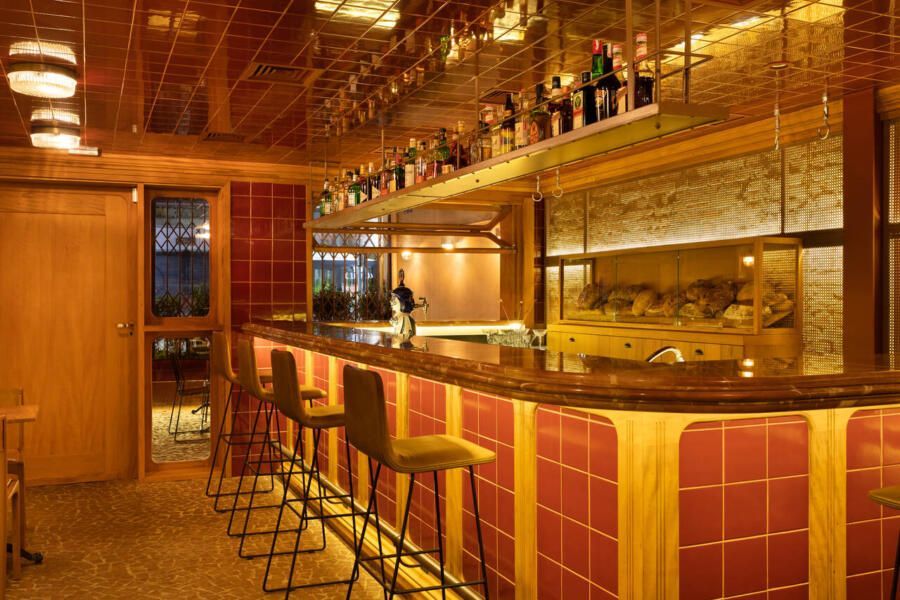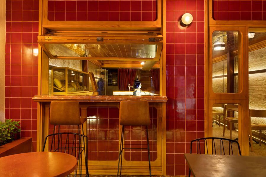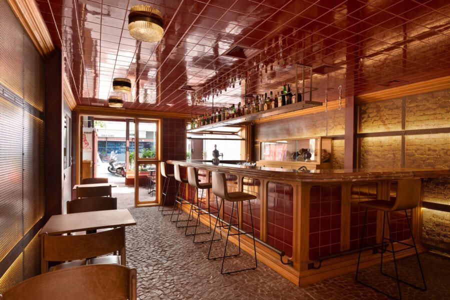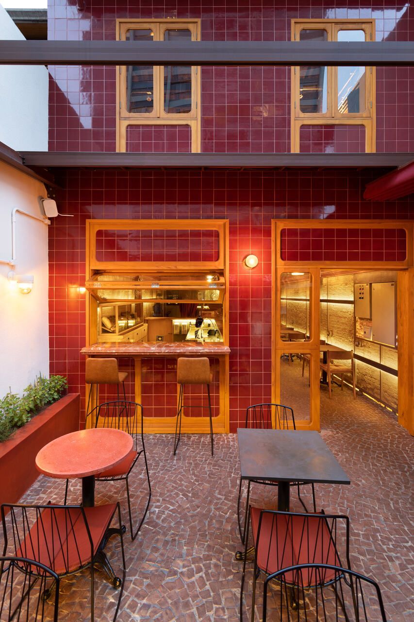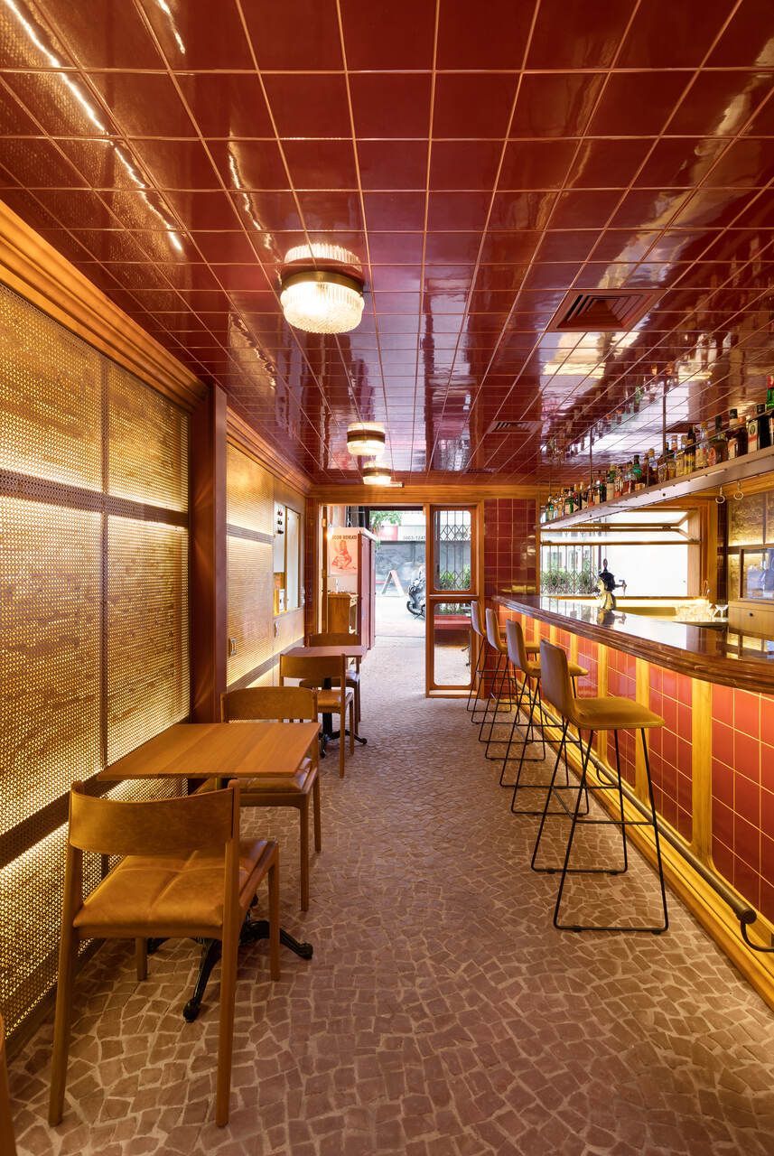 Já na entrada é possível perceber a dramaticidade do projeto com a fachada revestida por azulejos vermelhos intensos e brilhantes. Esses mesmos azulejos também se encontram no balcão do bar e no teto do salão central, criando continuidade. No piso, destaque para o mosaico português.