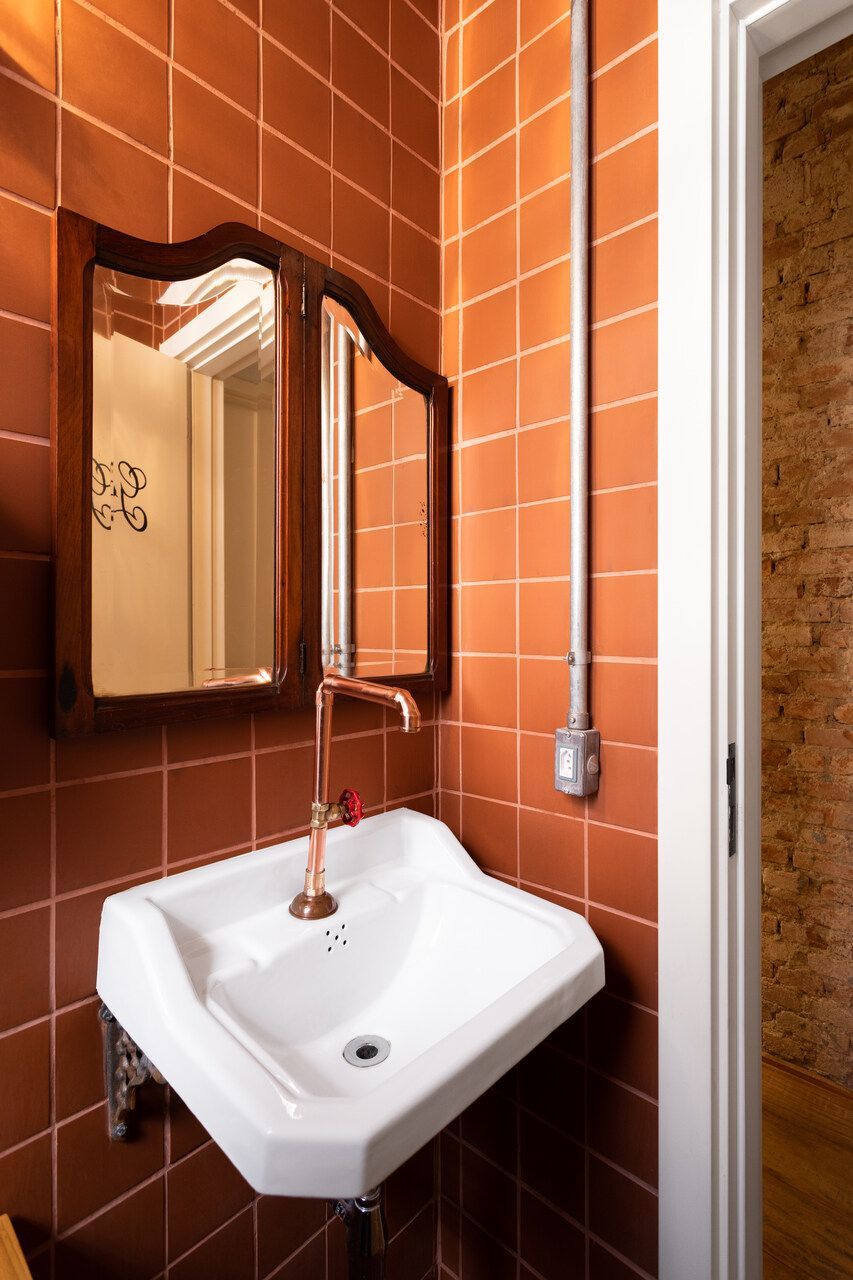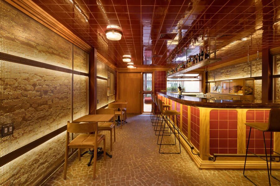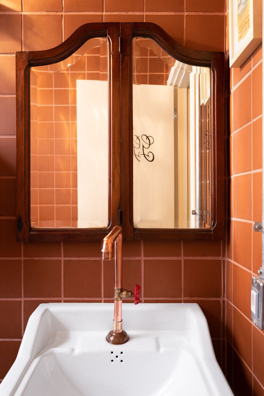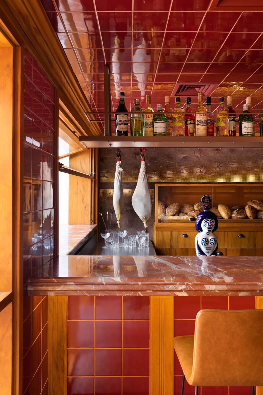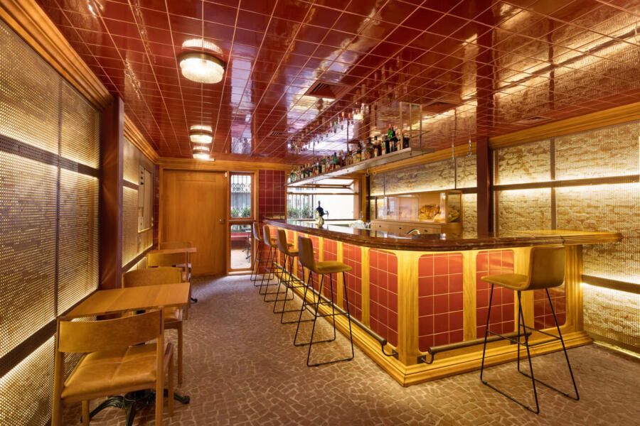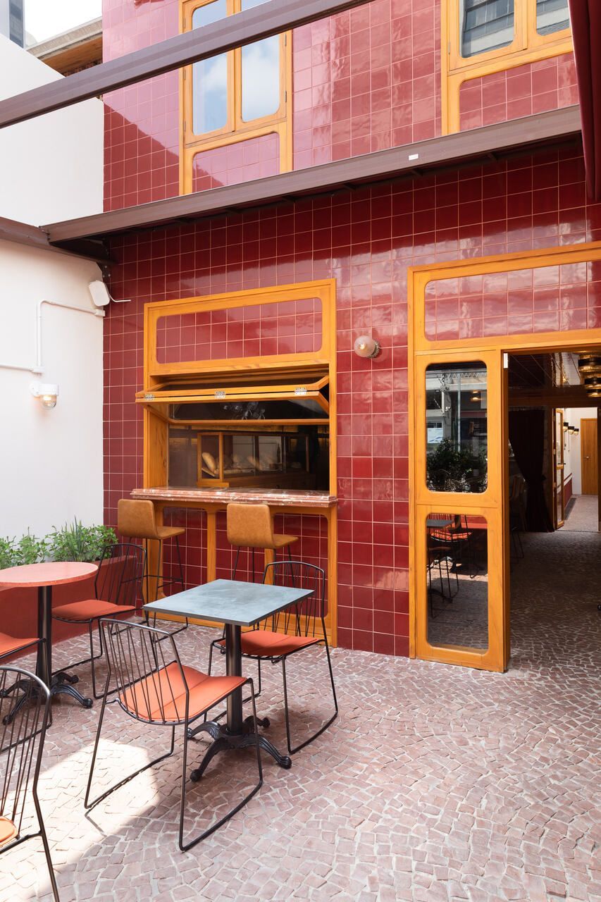 Já na entrada é possível perceber a dramaticidade do projeto com a fachada revestida por azulejos vermelhos intensos e brilhantes. Esses mesmos azulejos também se encontram no balcão do bar e no teto do salão central, criando continuidade. No piso, destaque para o mosaico português.