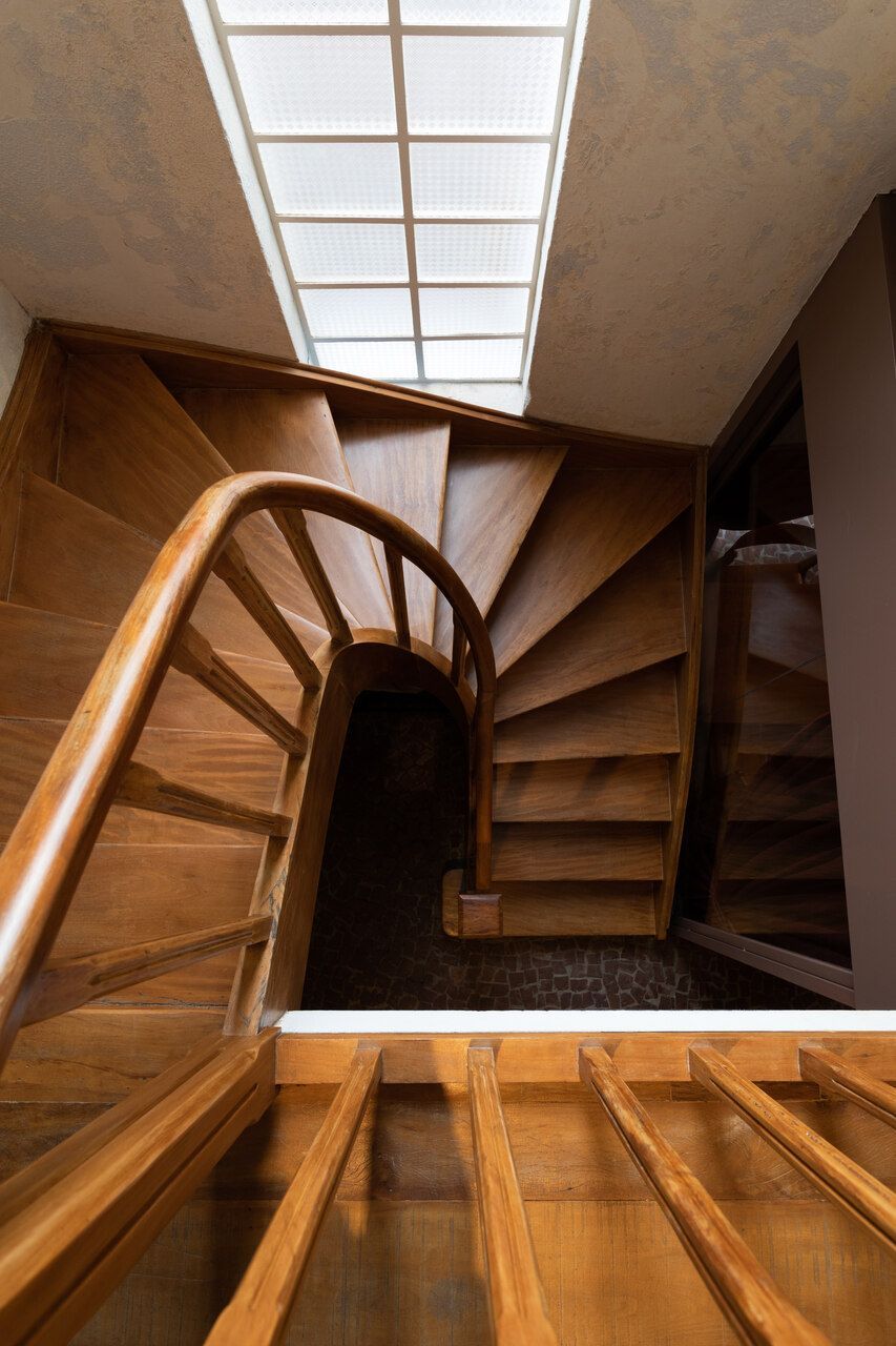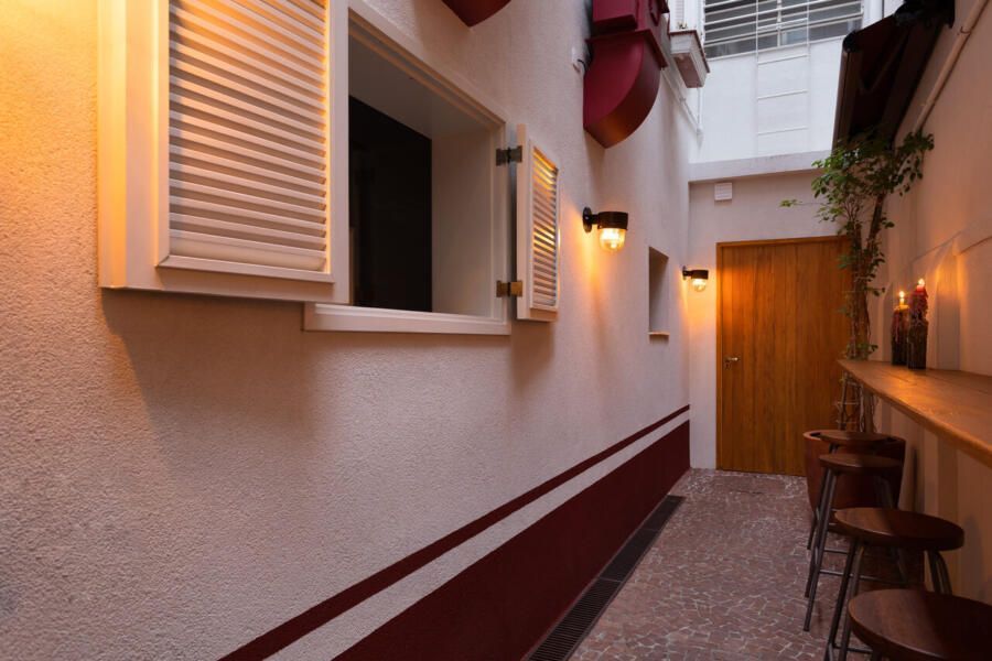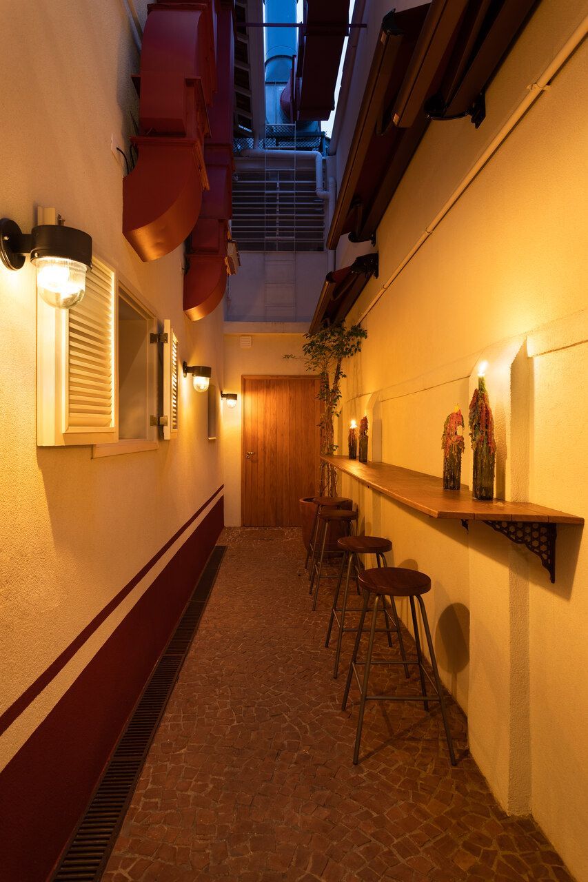 “O pavimento superior foi projetado para acolher eventos temporários e a intervenção estrutural de maior impacto ocorreu nos fundos do imóvel, onde ambientes que eram compartimentados foram unidos para abrigar a cozinha. Ela é reservada mas se comunica com o pátio lateral dos fundos através de pequenas janelas altas. Este corredor lateral está equipado com bancada contínua e banquetas e, descoberto, tem faixas vermelhas percorrendo as altas paredes brancas que o cercam.”