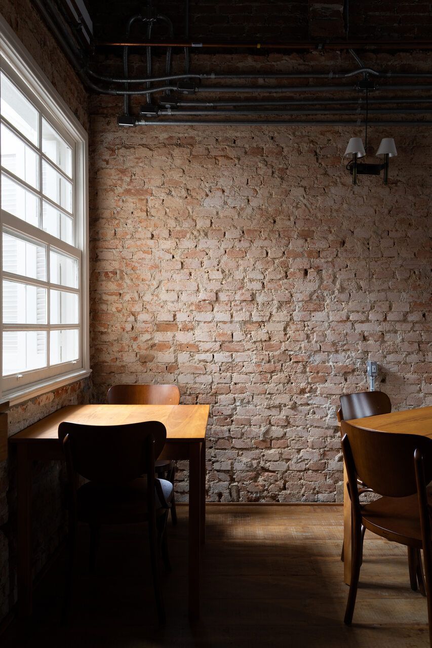 As paredes laterais e de fundo do salão central foram descascadas, a fim de deixar os tijolos mais desgastados, mas não diretamente aparentes.
