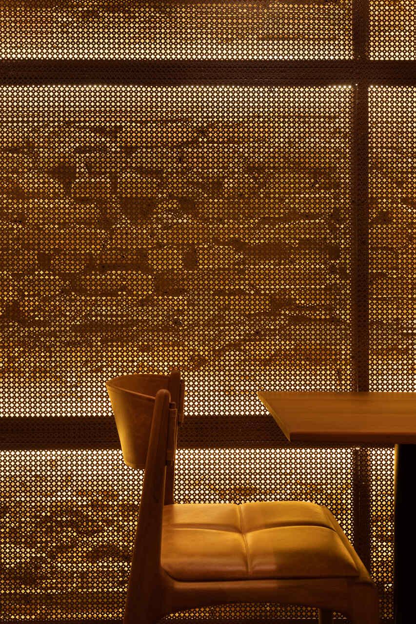 “Telas metálicas perfuradas foram sobrepostas a eles, e no pequeno afastamento entre os materiais inseriram-se luminárias contínuas e de luz indireta, dispostas na horizontal. Além de criar um grafismo que contrasta com a paginação e a textura dos revestimentos, tal solução amplia visualmente as dimensões do ambiente porque confere efeito tridimensional às paredes.”