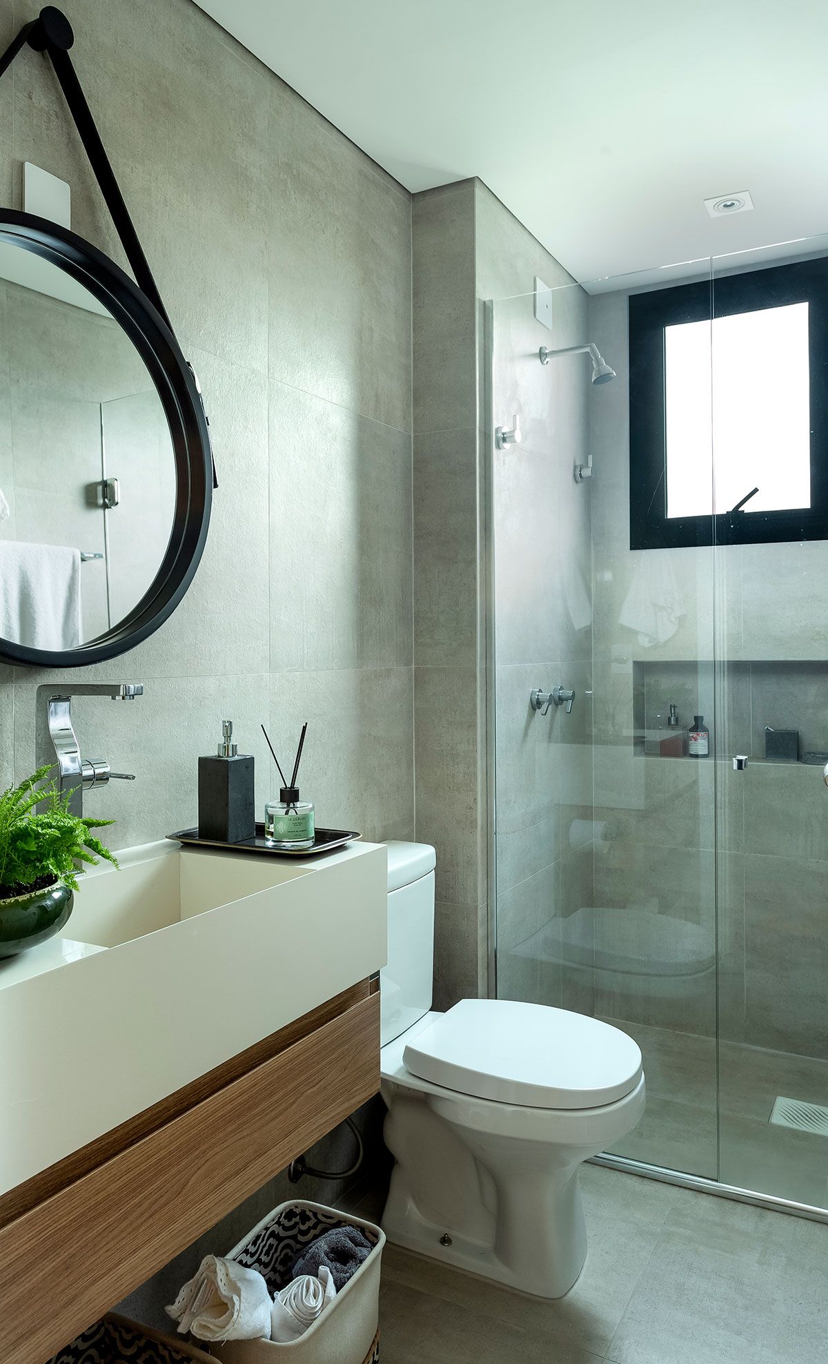 Optamos por uma base neutra para destacar o décor, além da mistura de materiais mais sóbrios com o acolhimento da madeira.