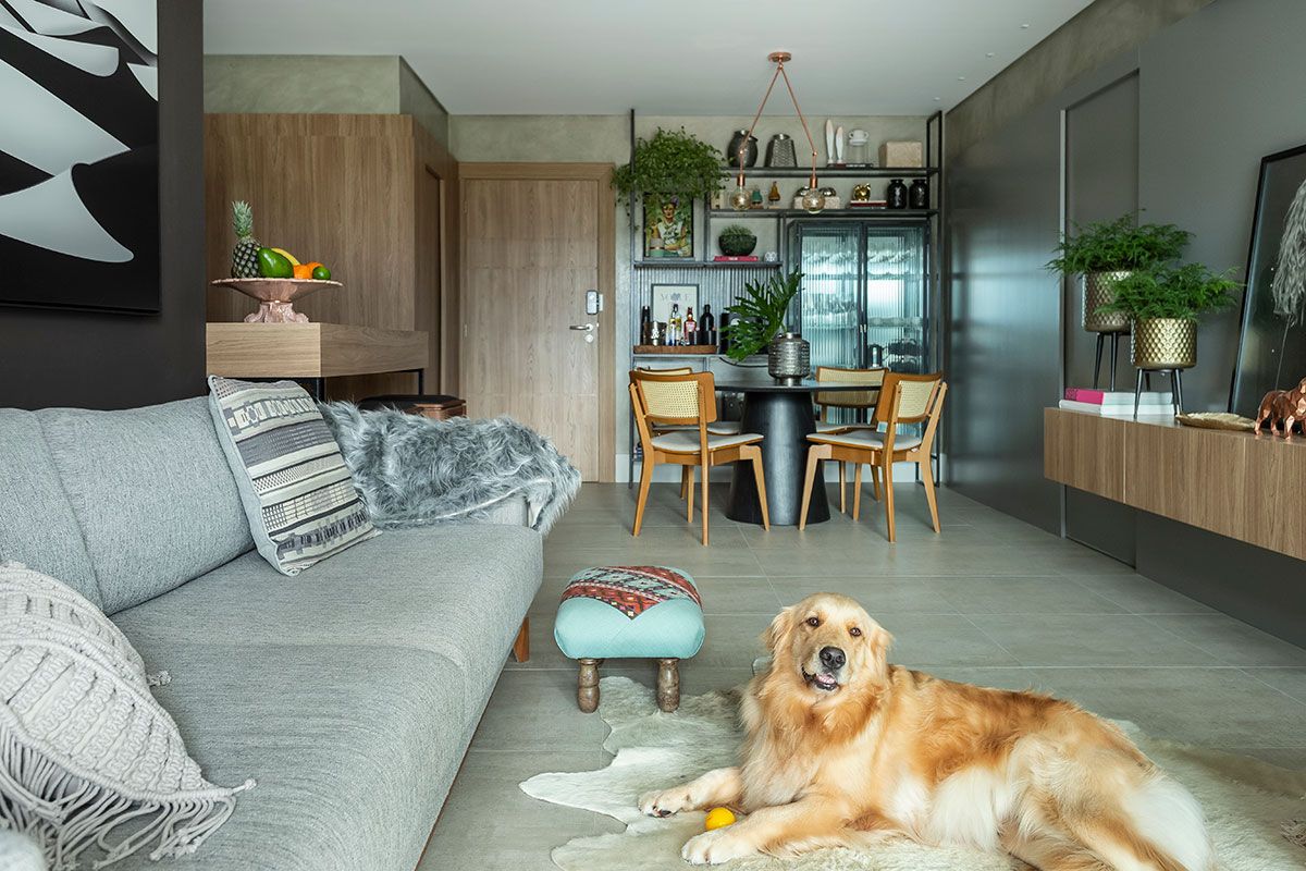 Além disso, era preciso que os materiais escolhidos fossem práticos para o dia a dia, pois eles tem um cachorro, e queriam facilidade para limpeza. Por isso, foi escolhido um piso atual e que ajuda a disfarçar os pelos.
