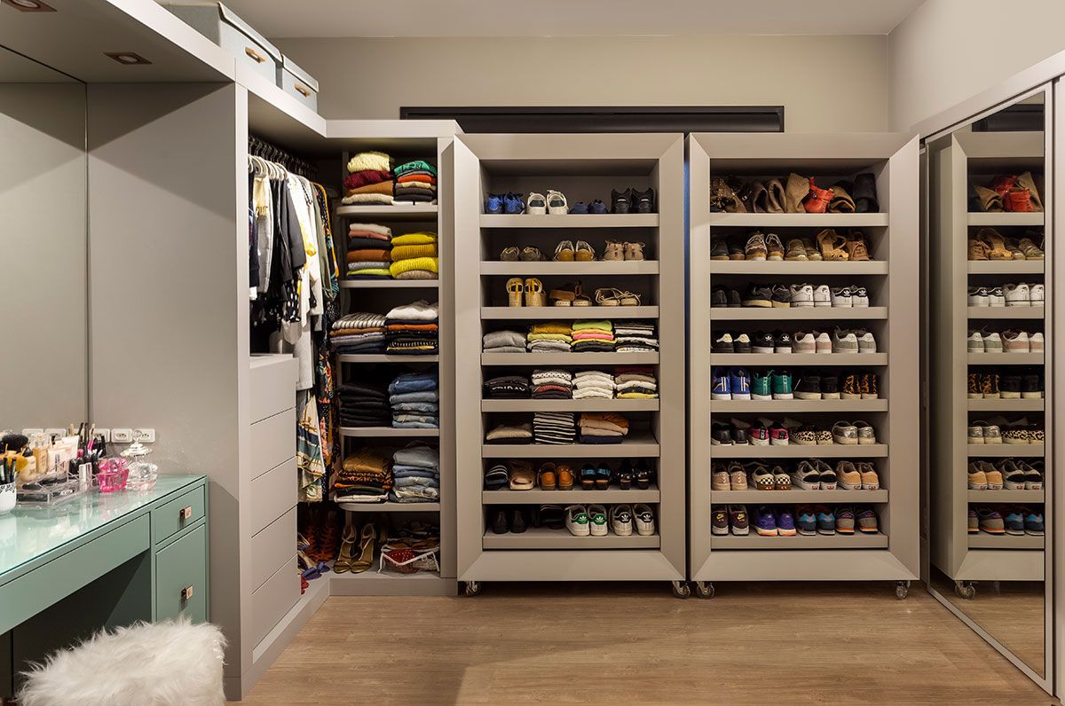 O maior desafio do escritório foi conciliar o gosto e as necessidades do casal e acomodar todo o vestuário/acessórios da cliente que é designer de acessórios. Para solucionar o problema de espaço, um dos quartos foi transformado em closet com acesso direto da suíte e foram feitos dois banheiros, mantendo a individualidade de cada um.