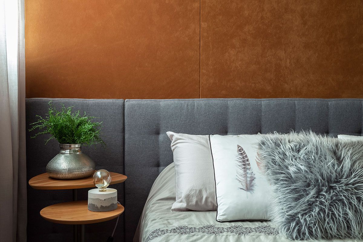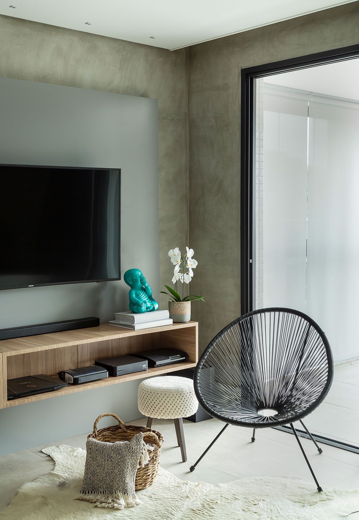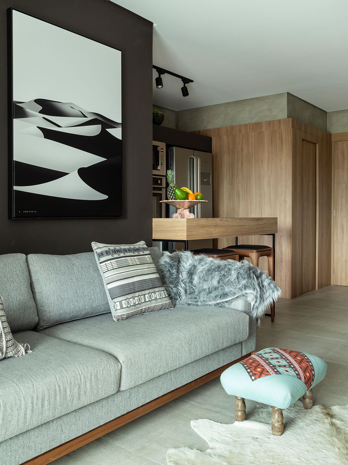 Optamos por uma base neutra para destacar o décor, além da mistura de materiais mais sóbrios com o acolhimento da madeira.