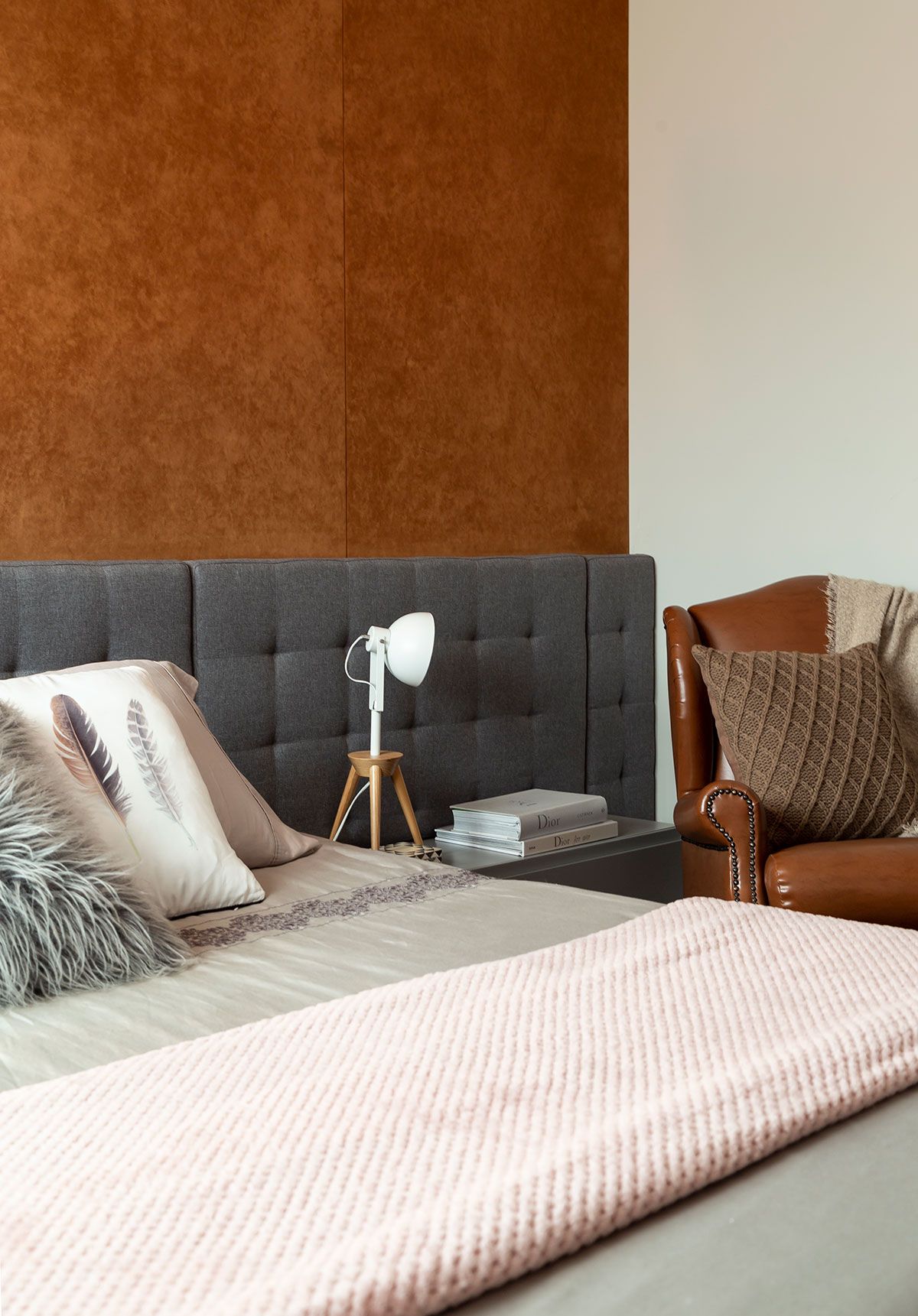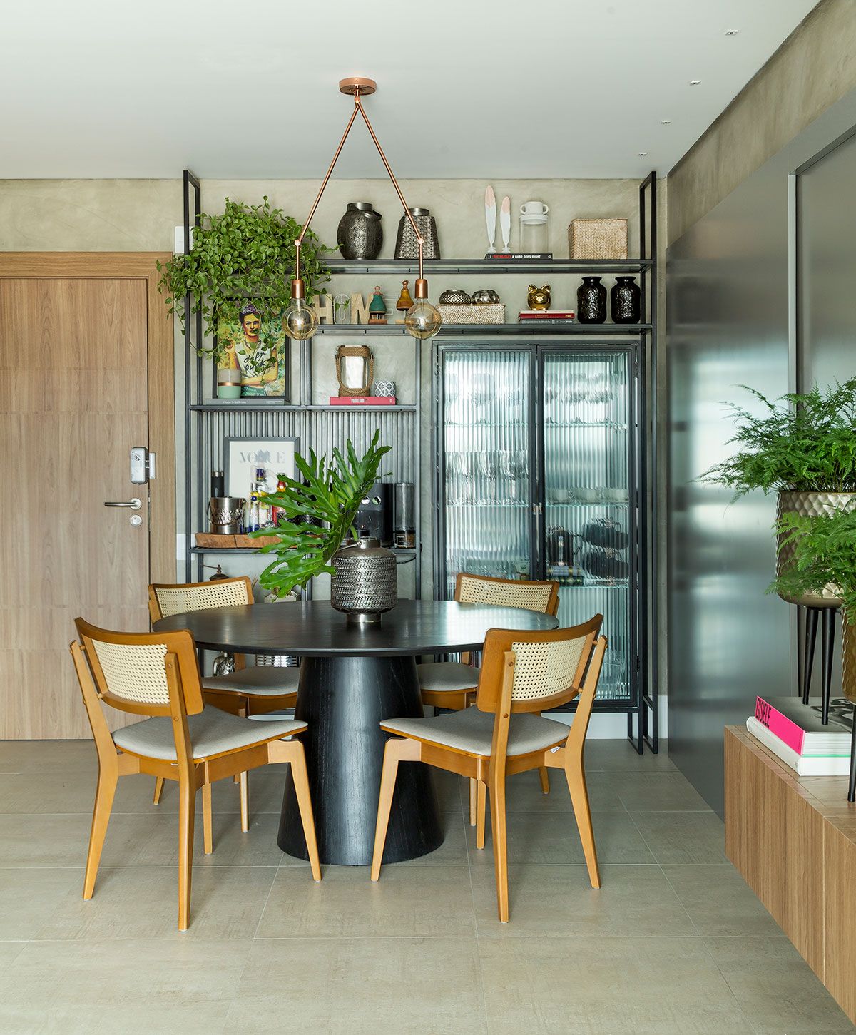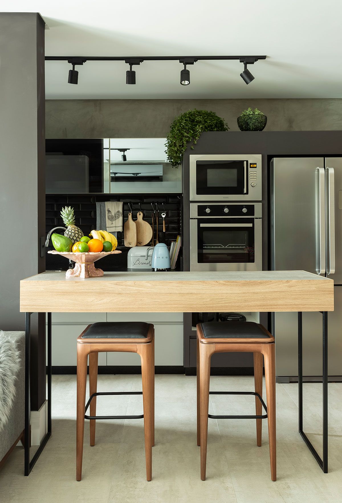 Optamos por uma base neutra para destacar o décor, além da mistura de materiais mais sóbrios com o acolhimento da madeira.
