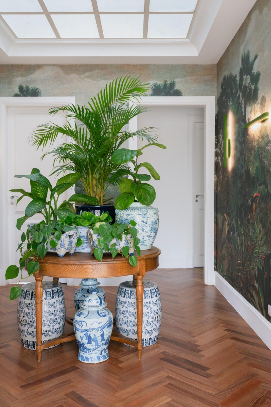 “Ela cobre todo o Hall íntimo e liga os quartos, permitindo uma entrada de luz maravilhosa. Essa iluminação fez com que decidíssemos criar uma espécie de floresta interna, colocando um papel de parede de mata e uma mesa de centro com várias plantas próprias para área externa.”