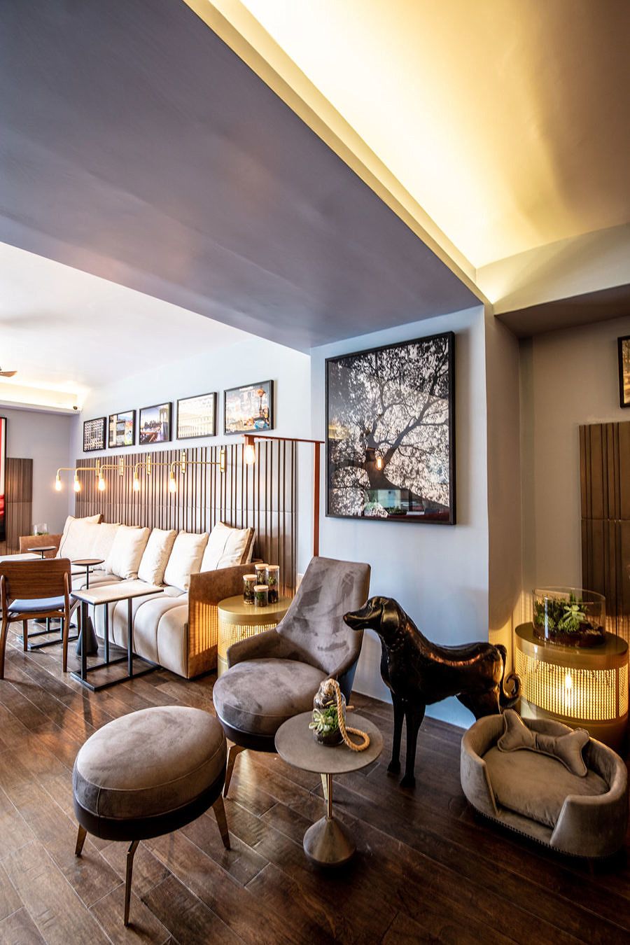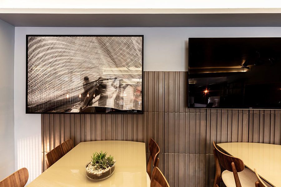 Ponto alto do espaço, o sofá curvo de veludo vermelho contrasta muito bem com o azul, a madeira e os tons de dourado e cobre. Na iluminação, as profissionais optaram pelas fitas de LED, além de luminárias de fibra de carbono, que agregam beleza e baixo consumo.