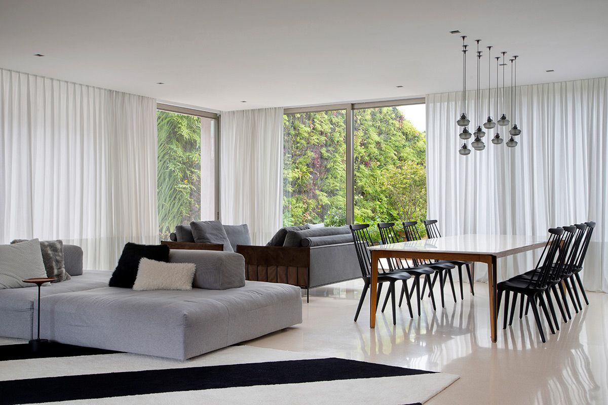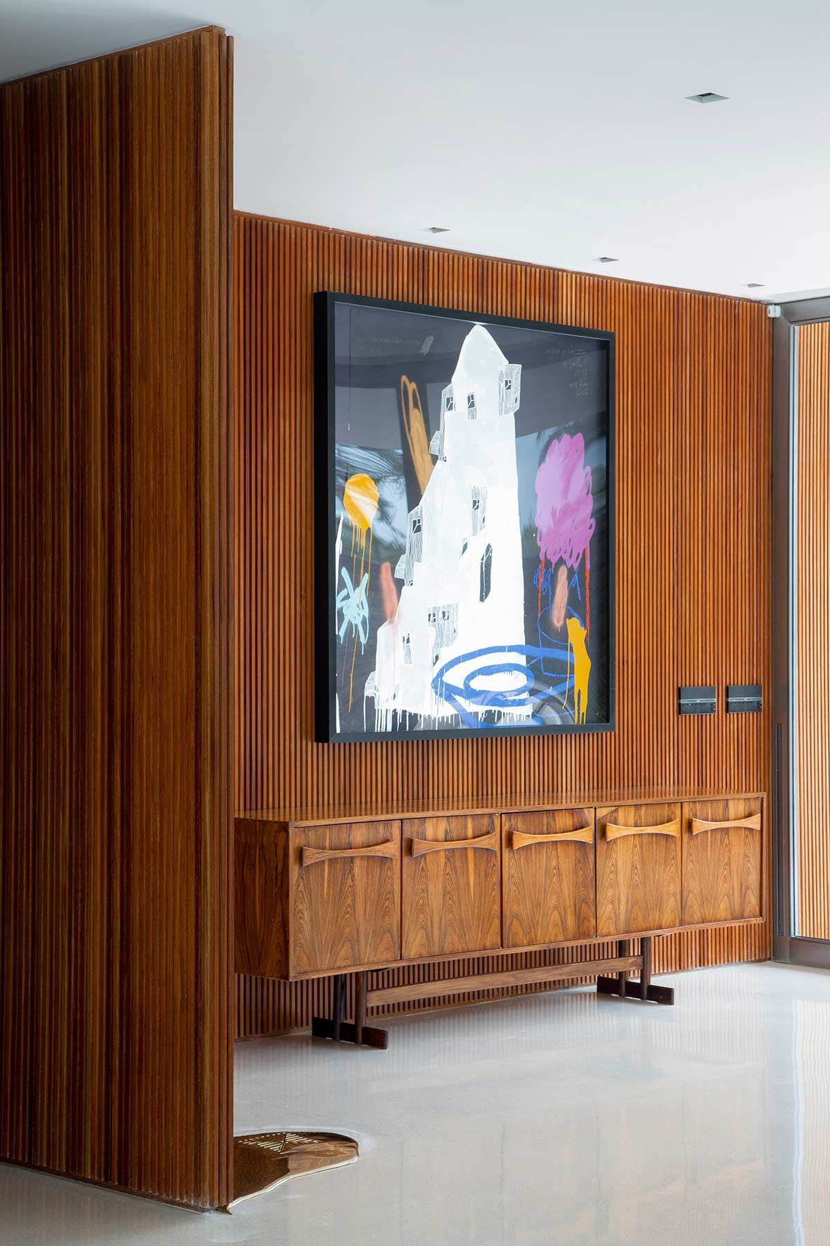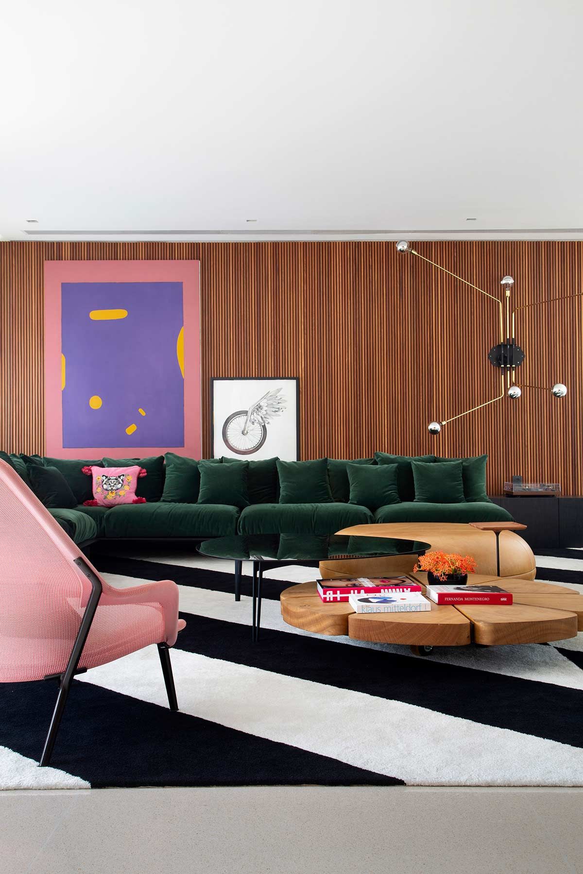 O principal objetivo do projeto foi refletir sua personalidade alegre ao longo da casa. A primeira coisa que ela nos pediu foi um sofá de veludo, que incorporamos no living.