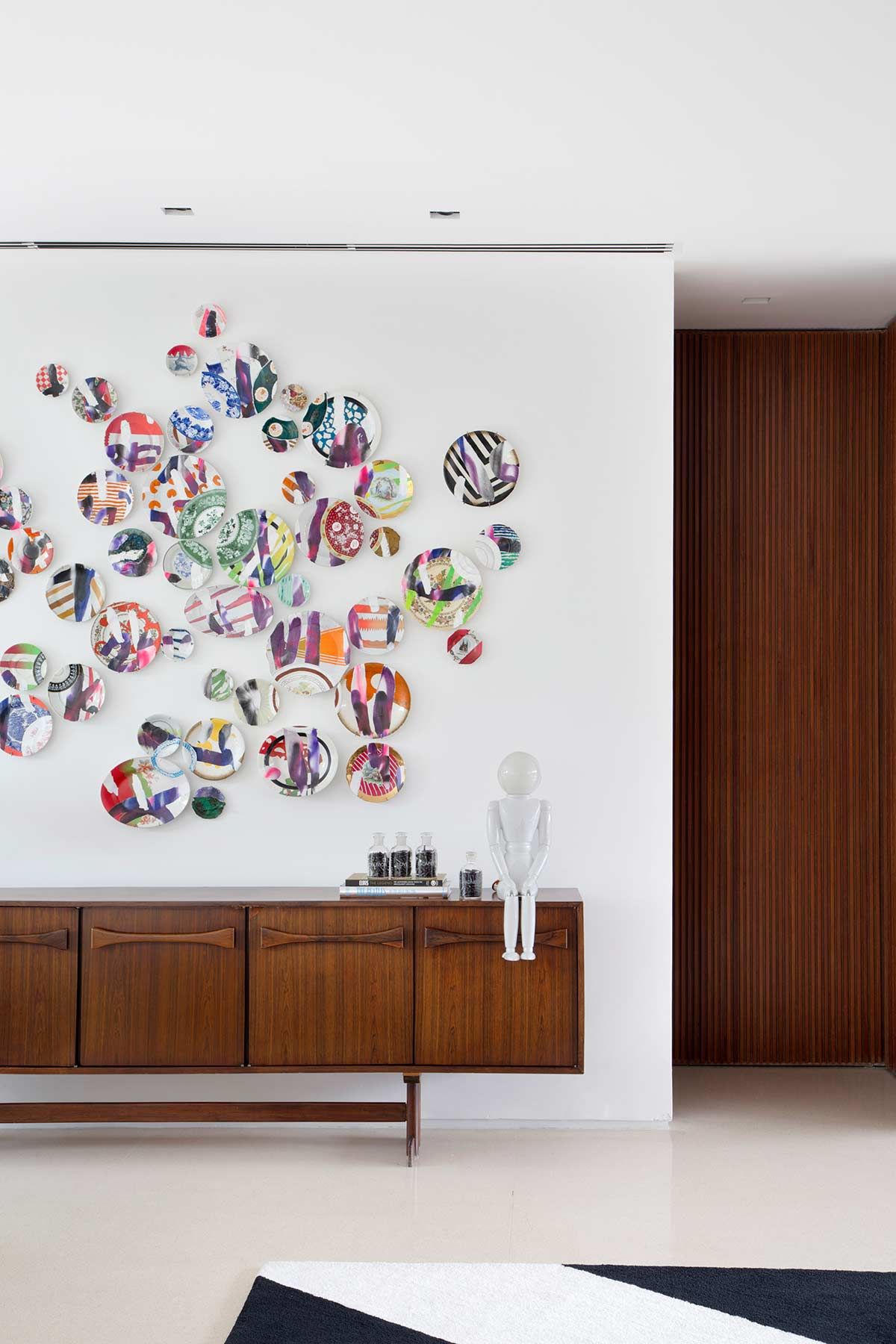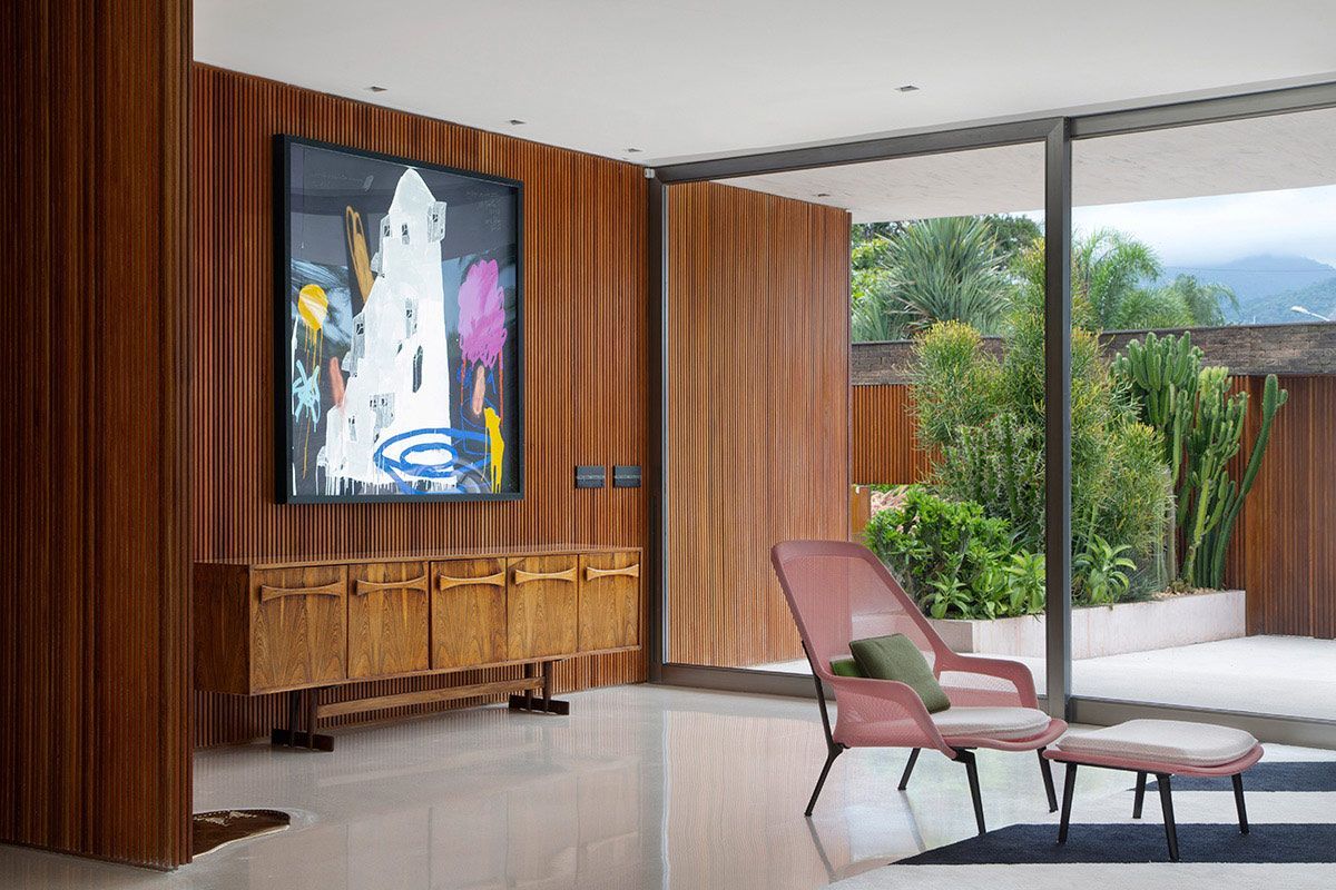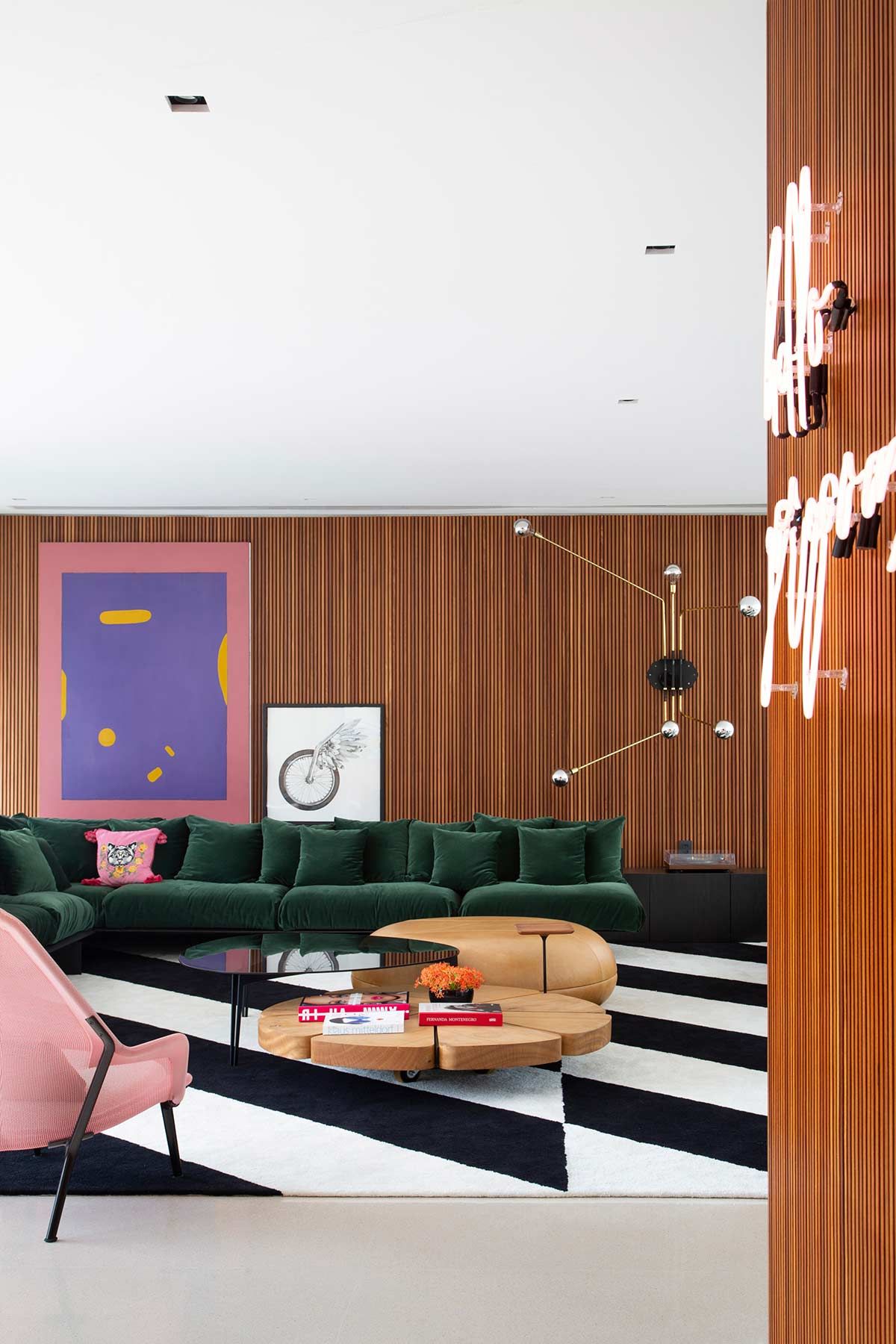 A sala ficou vibrante e carrega móveis com assinatura do designer Jader Almeida, como o sofá em veludo verde, mesa de centro, as cadeiras e o pendente da mesa de jantar. A poltrona Slow Chair da Vitra e o tapete desenhado pelo próprio Studio Ro+Ca, complementaram o cenário aconchegante, que foi todo aquecido pela marcenaria executada sob medida.
