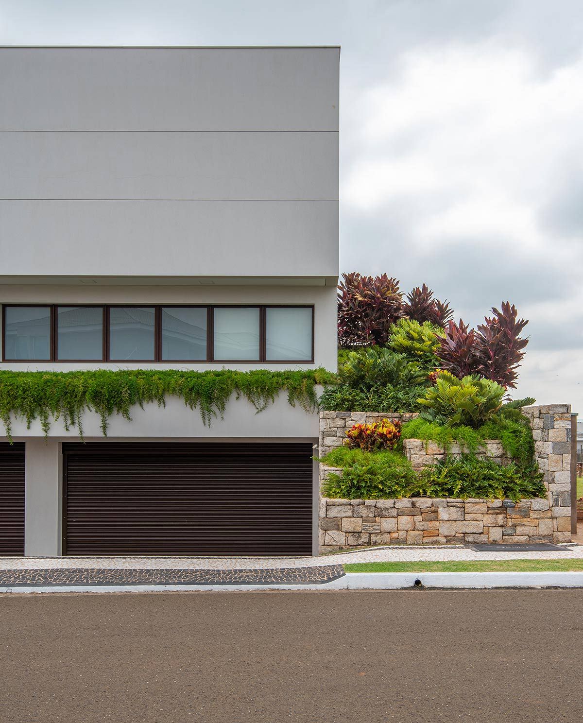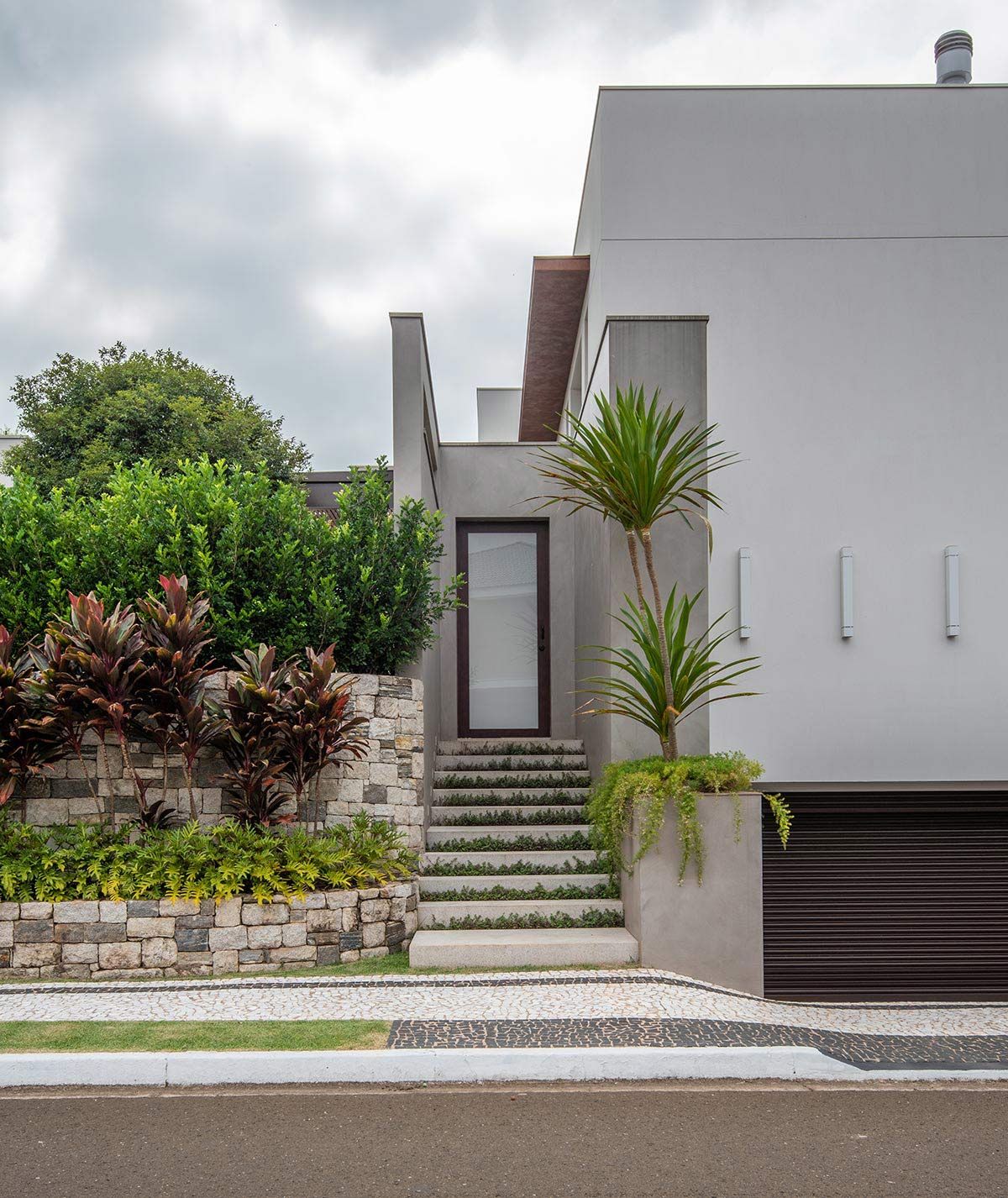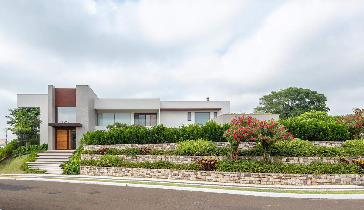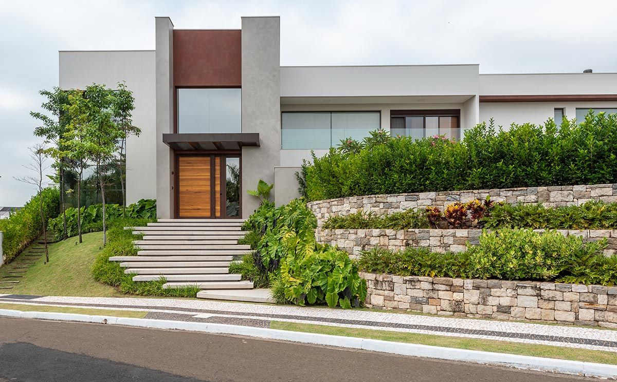 O maior desafio foi minimizar o desnível do terreno, já que os clientes queriam que a garagem fosse subterrânea, e com isso, toda a casa precisou subir. A solução encontrada foi criar um jardim lindo em níveis por toda a extensão da fachada, com as floreiras revestidas com pedra Moledo.