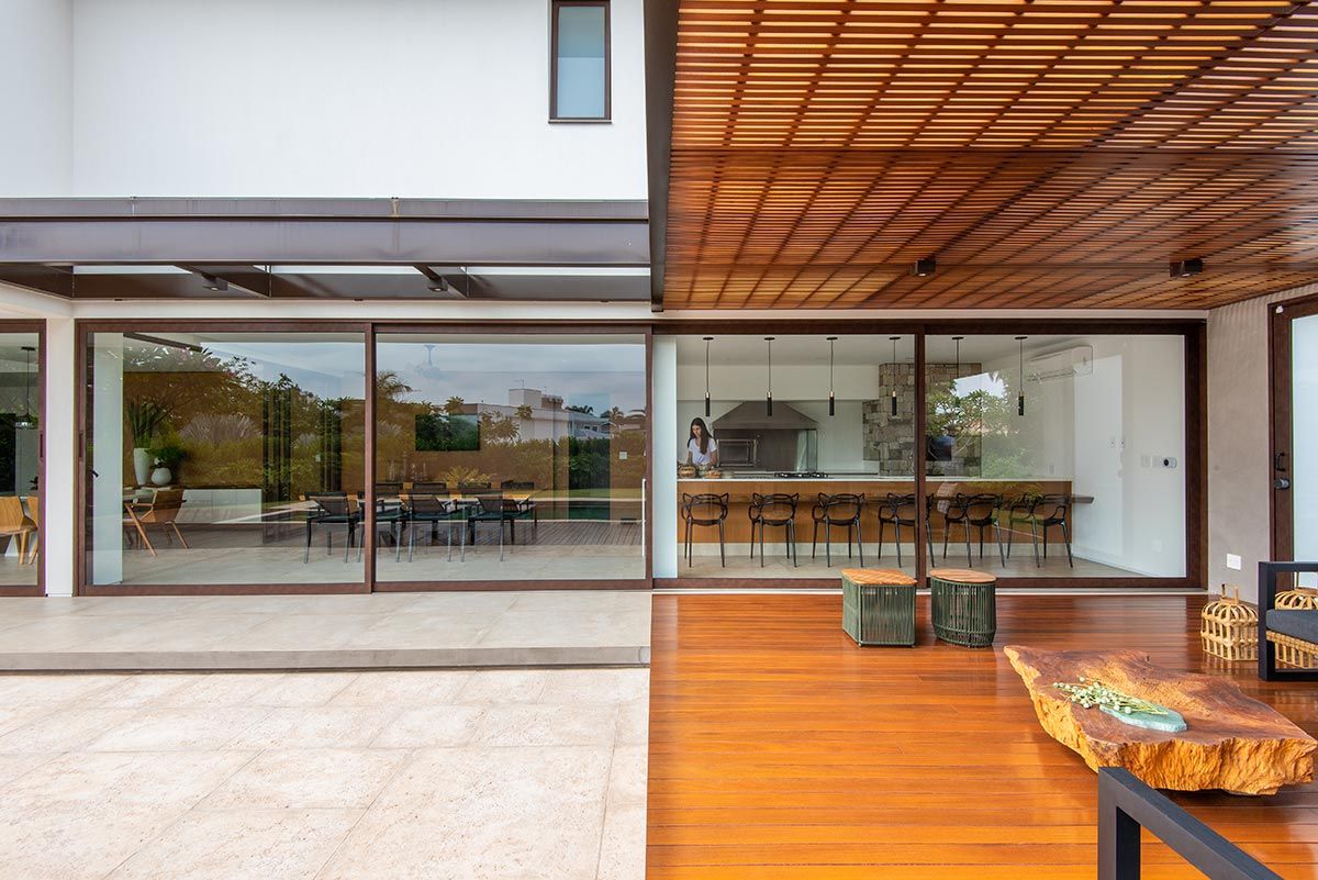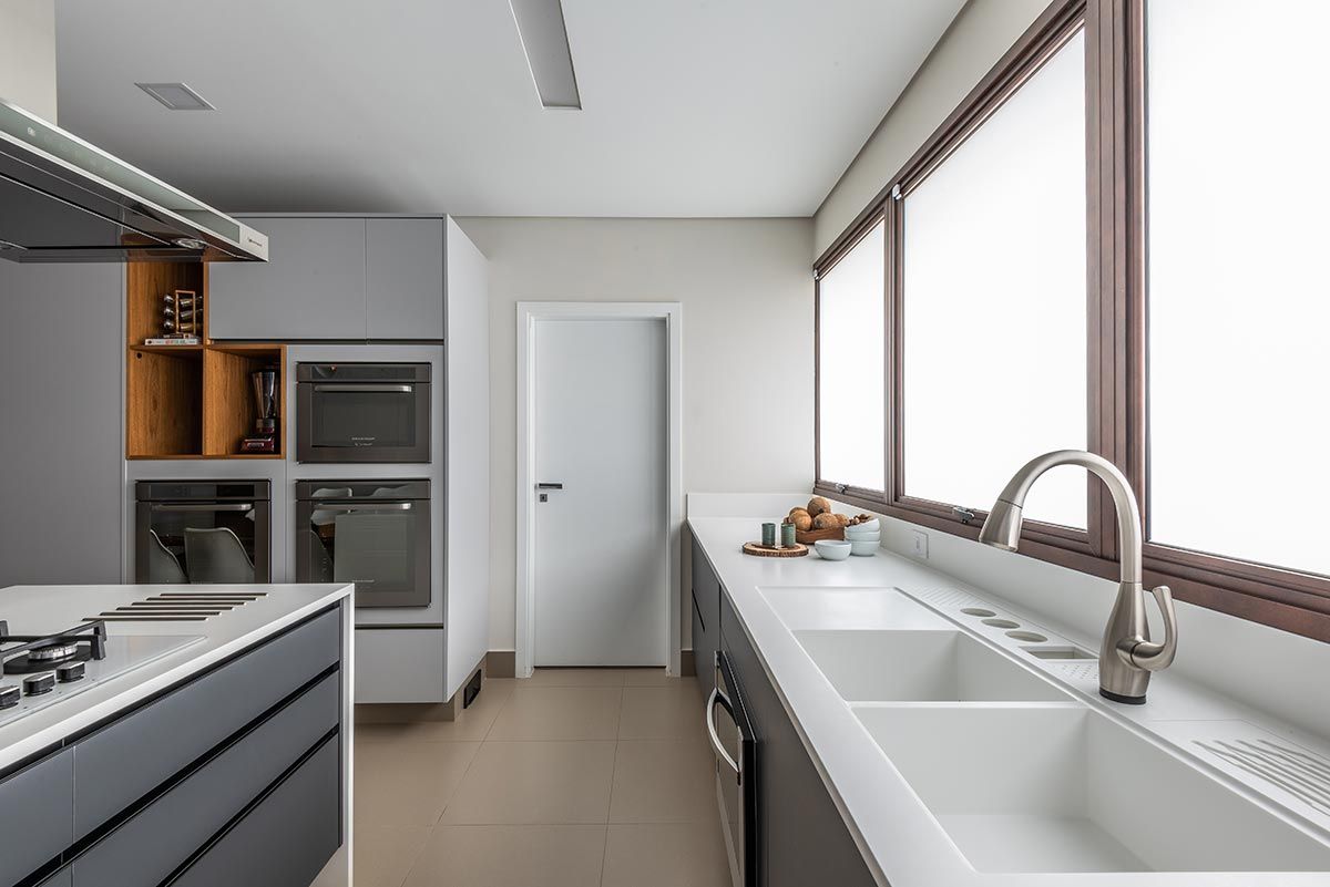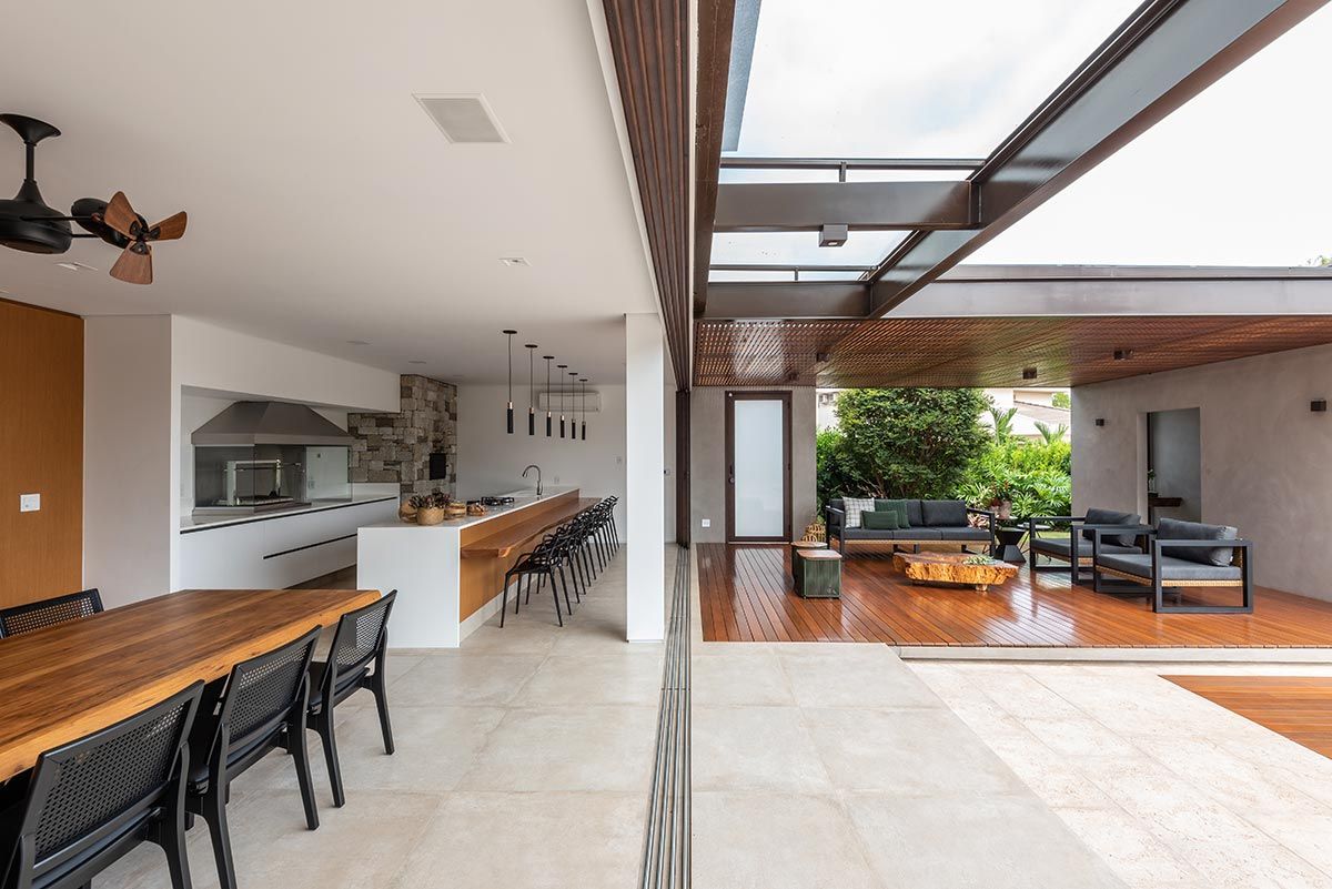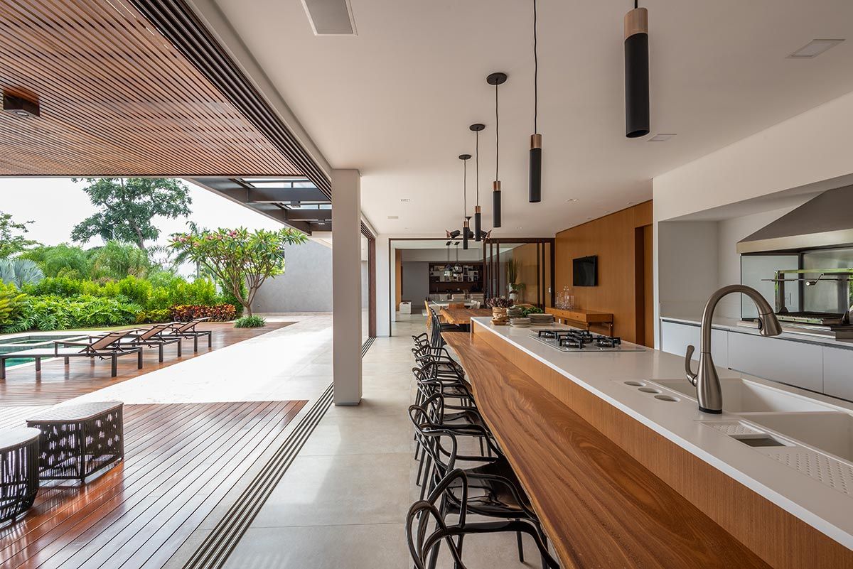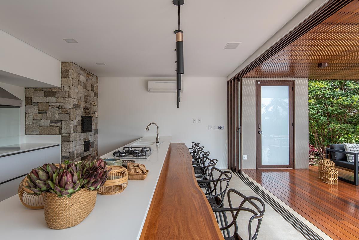 Para integrar ainda mais os ambientes e criar grandes vãos, as esquadrias são totalmente recolhidas dentro de volumes entre paredes, agregando uma estética bem interessante. As escolhas dos acabamentos foram pautadas na praticidade do dia a dia, como as bancadas em Corian que, visualmente fica clean e uniforme, por não ter emendas aparentes, e ainda o material garante durabilidade e funcionalidade na limpeza tanto na cozinha, quanto na churrasqueira, por resistir bem ao calor.
