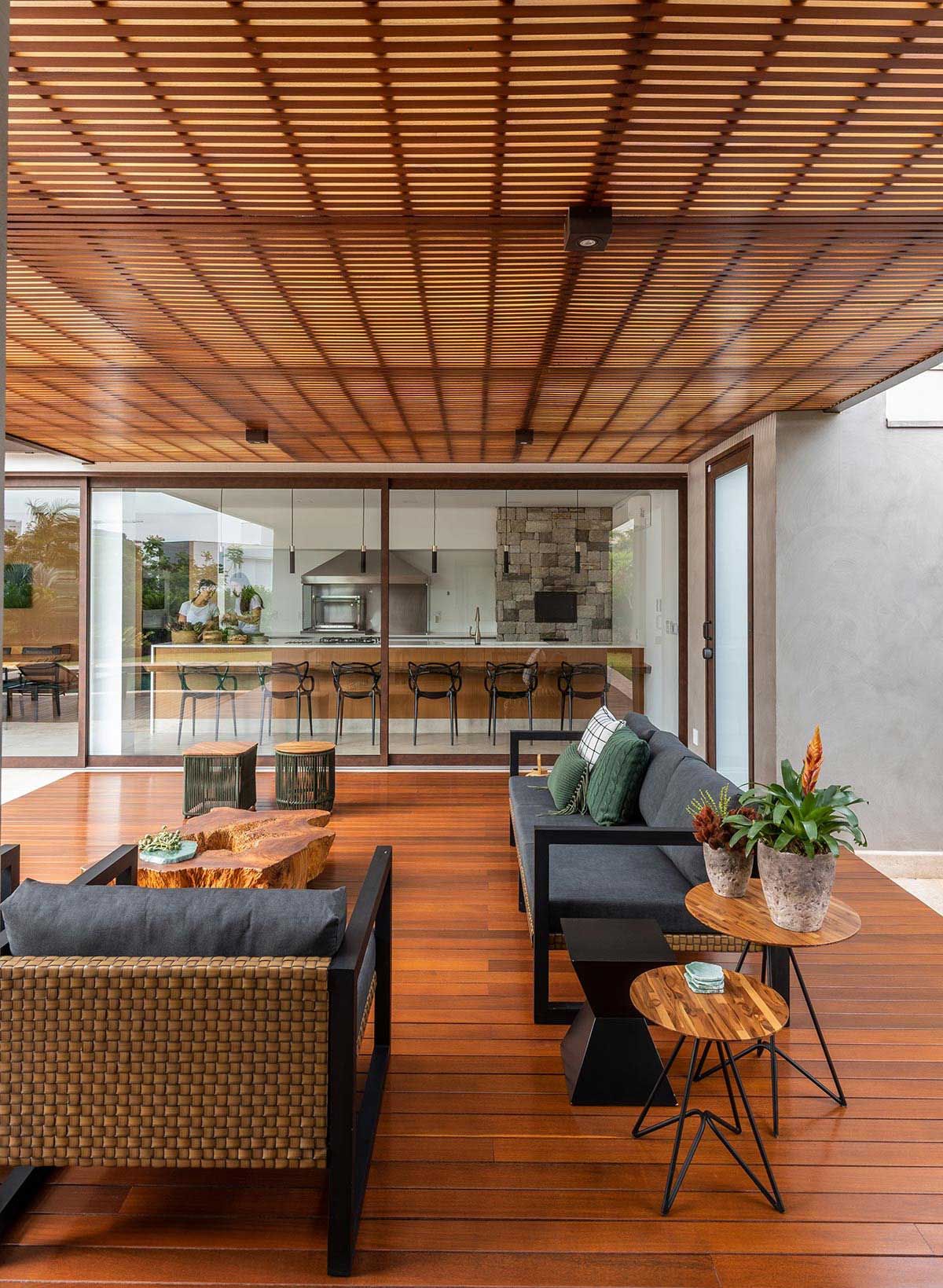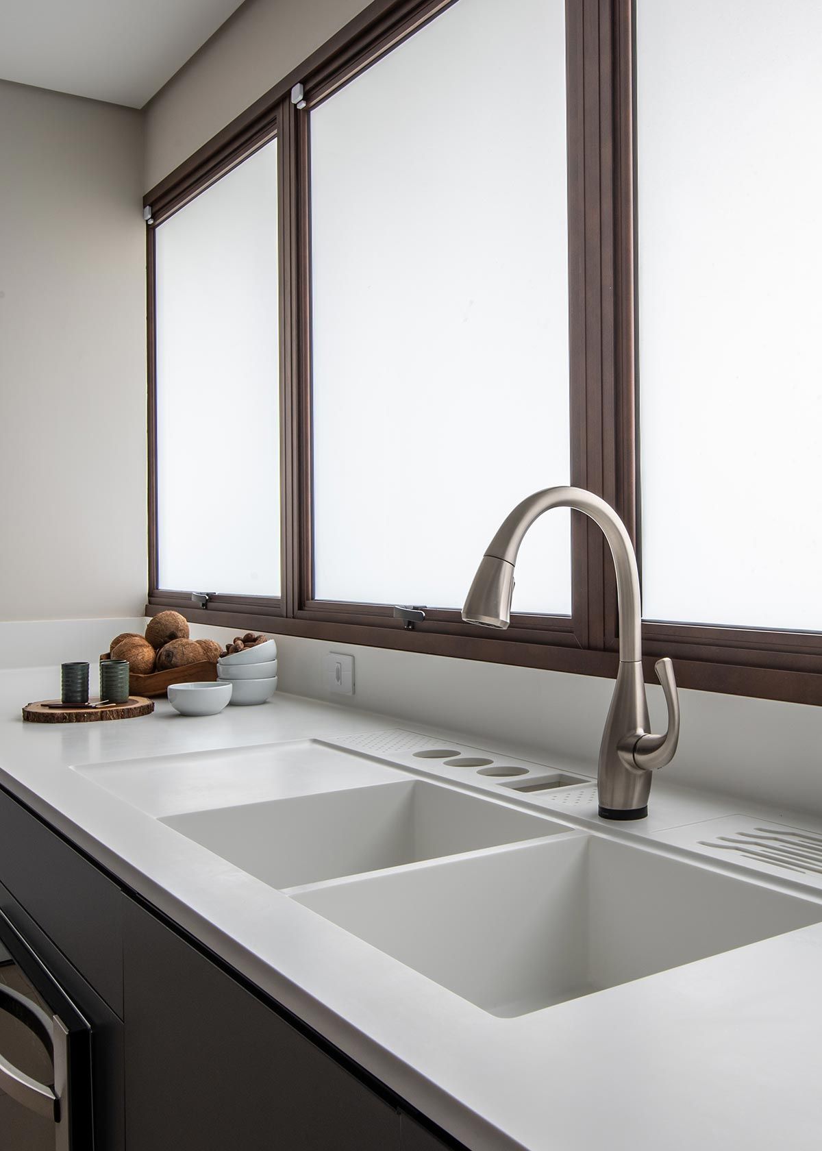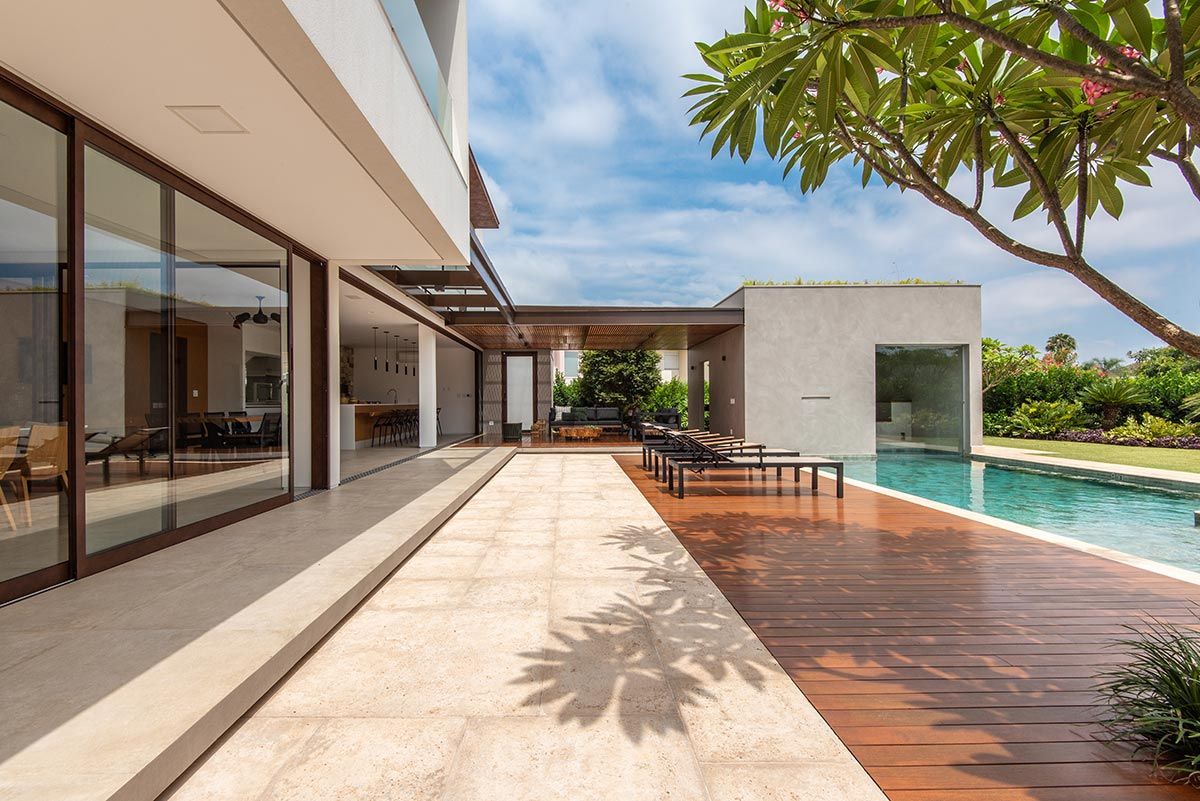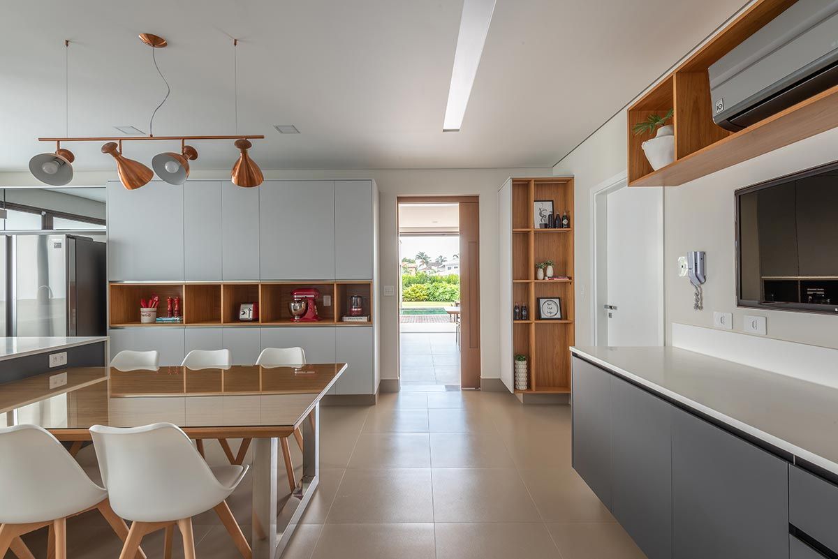 Para integrar ainda mais os ambientes e criar grandes vãos, as esquadrias são totalmente recolhidas dentro de volumes entre paredes, agregando uma estética bem interessante. As escolhas dos acabamentos foram pautadas na praticidade do dia a dia, como as bancadas em Corian que, visualmente fica clean e uniforme, por não ter emendas aparentes, e ainda o material garante durabilidade e funcionalidade na limpeza tanto na cozinha, quanto na churrasqueira, por resistir bem ao calor.