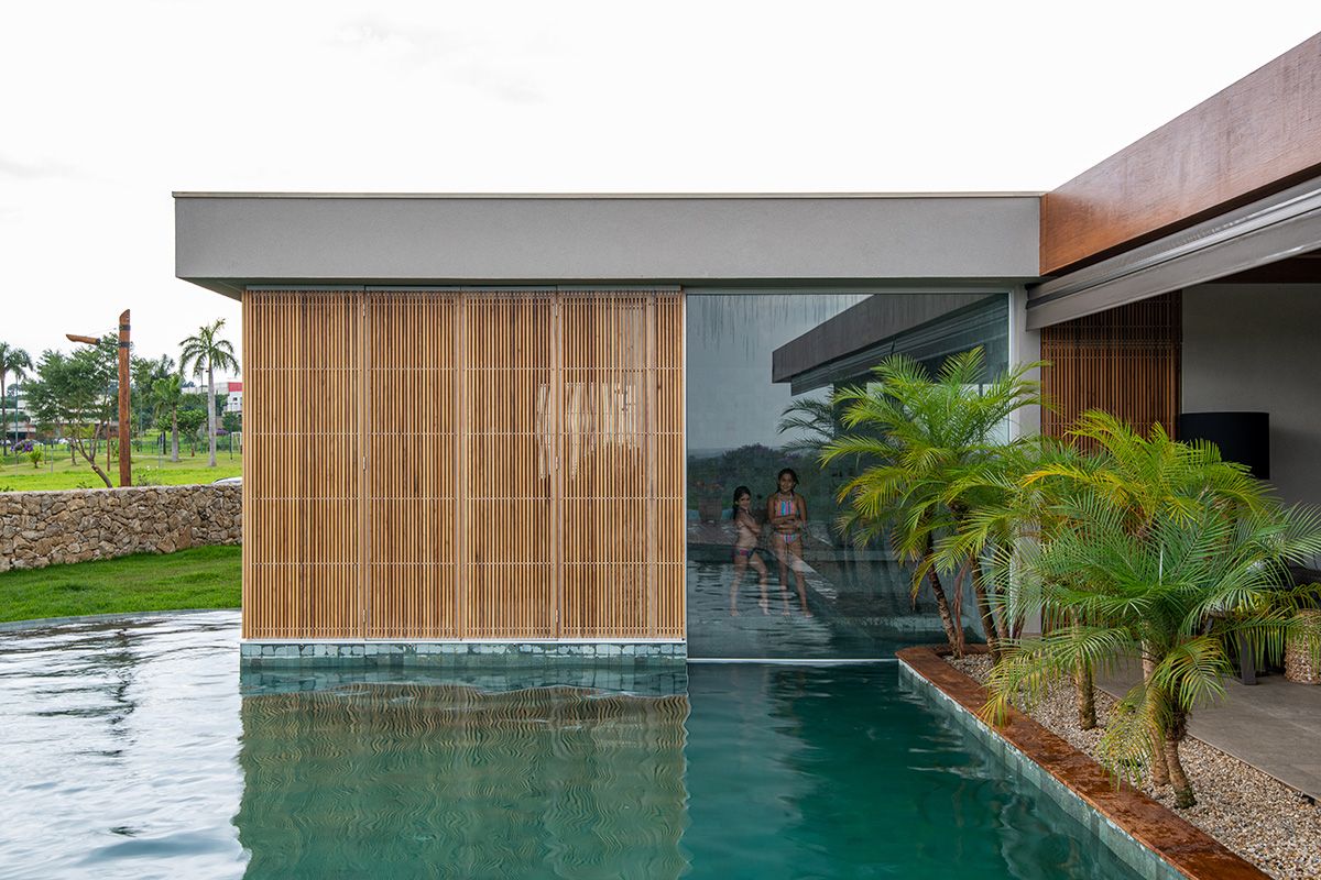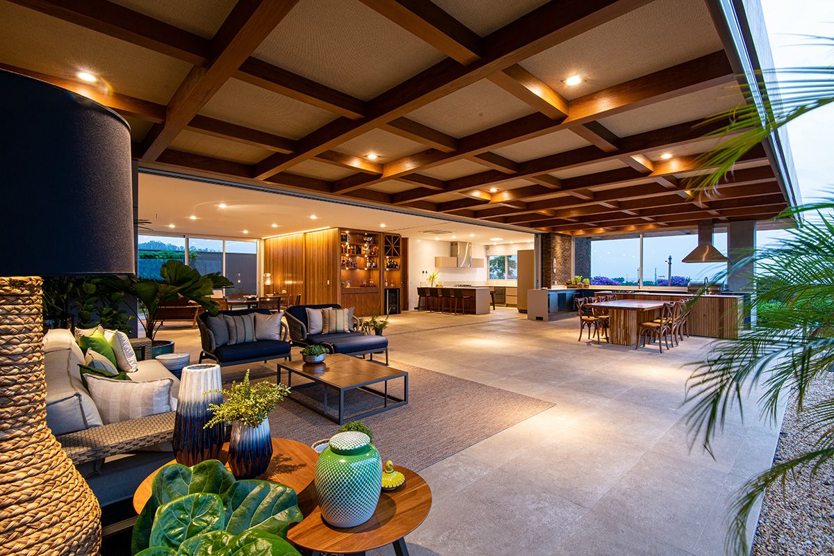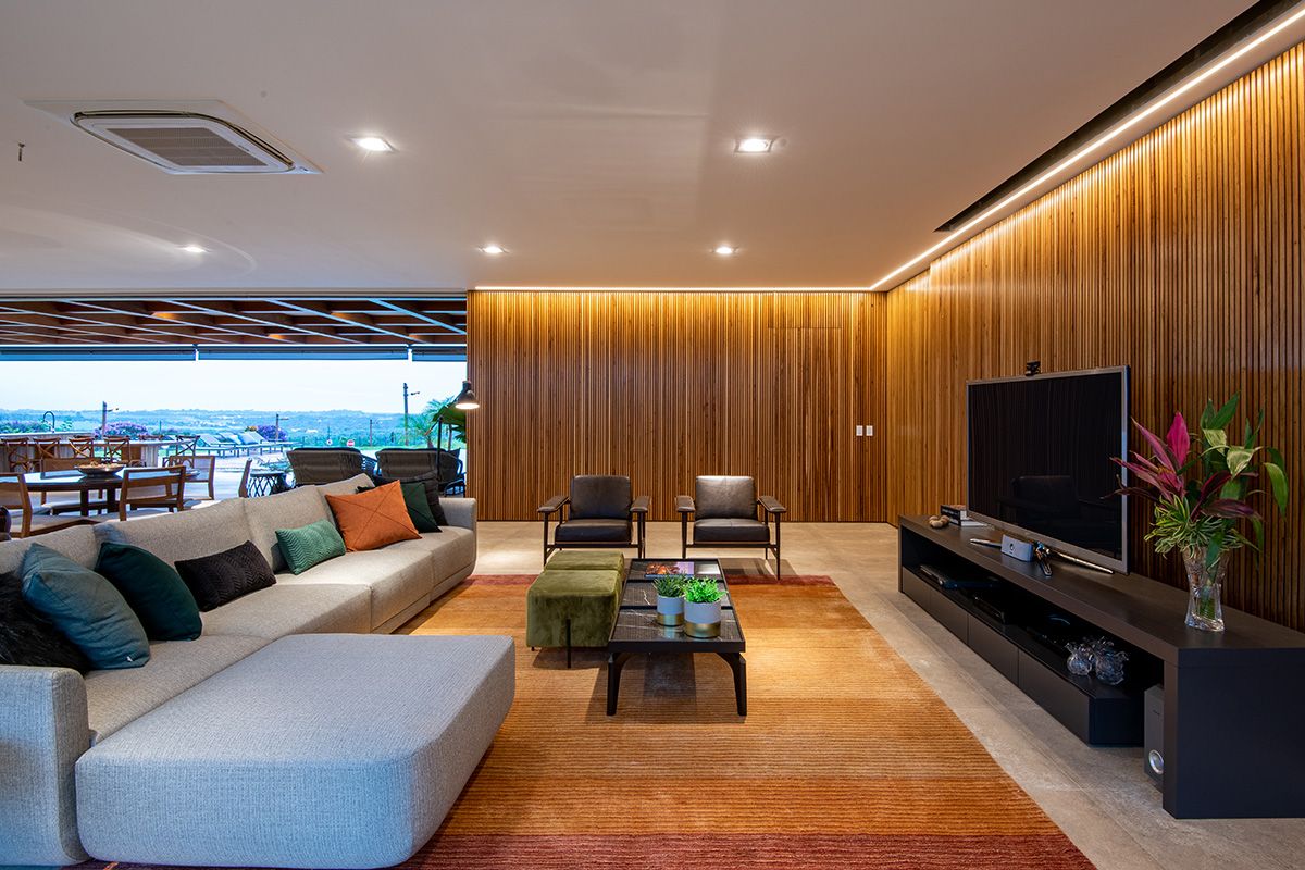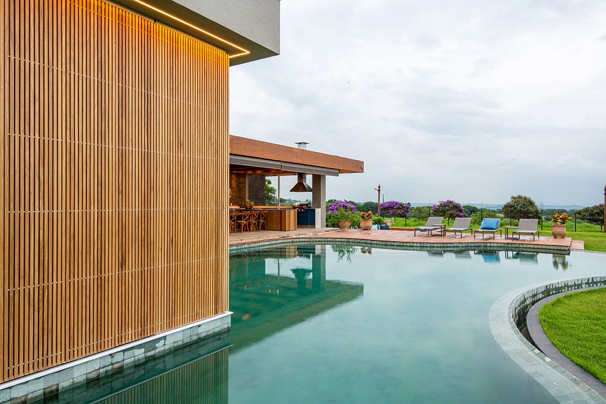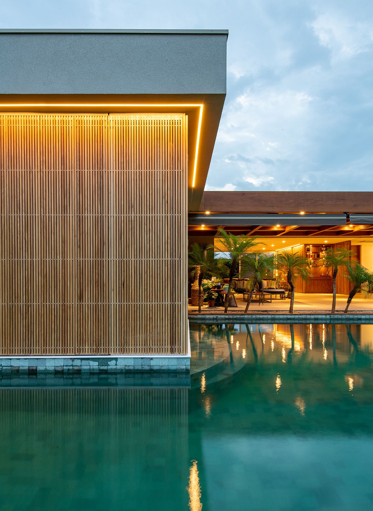 No centro da casa, criou-se um contexto interno-externo através de portas de vidro e madeira, que se recolhem atrás dos painéis ripados, formando assim um espaço único entre estar e a área de lazer. A casa ampla valorizou o convívio entre os moradores, e se tornou um ótimo lugar para receber, sem perder a sensação de acolhimento. A parte externa conta ainda com sauna, spa e piscina com passagem submersa até a suíte do casal – ótima para relaxar e admirar o horizonte.