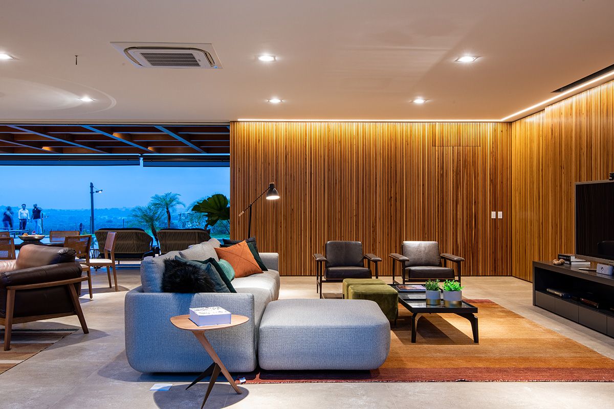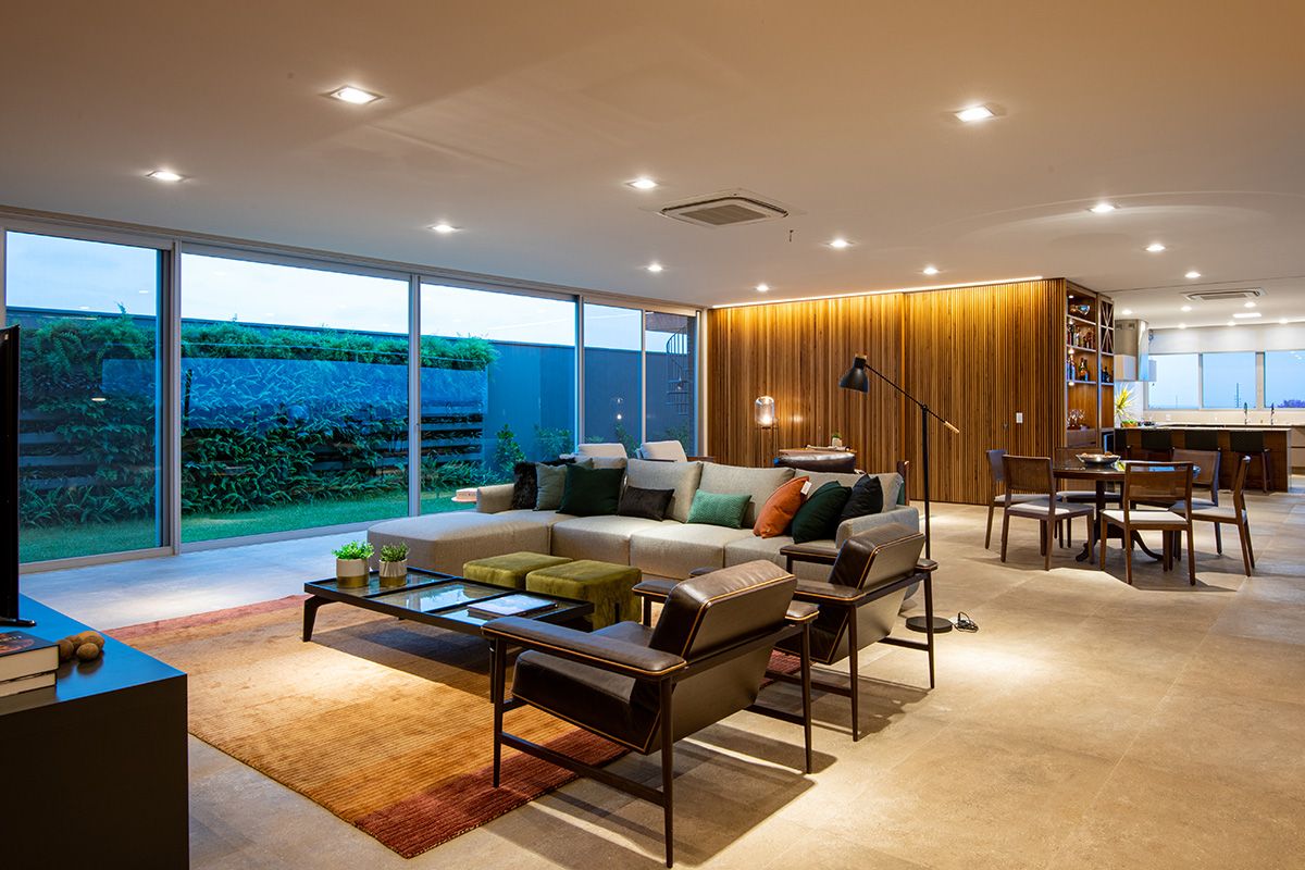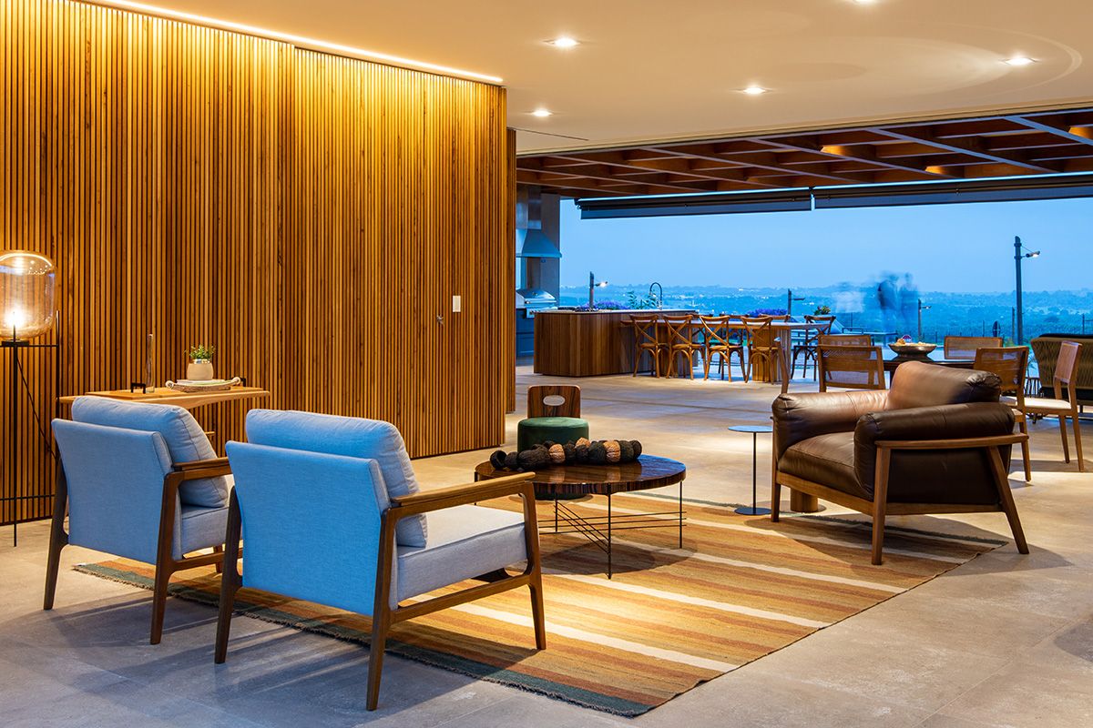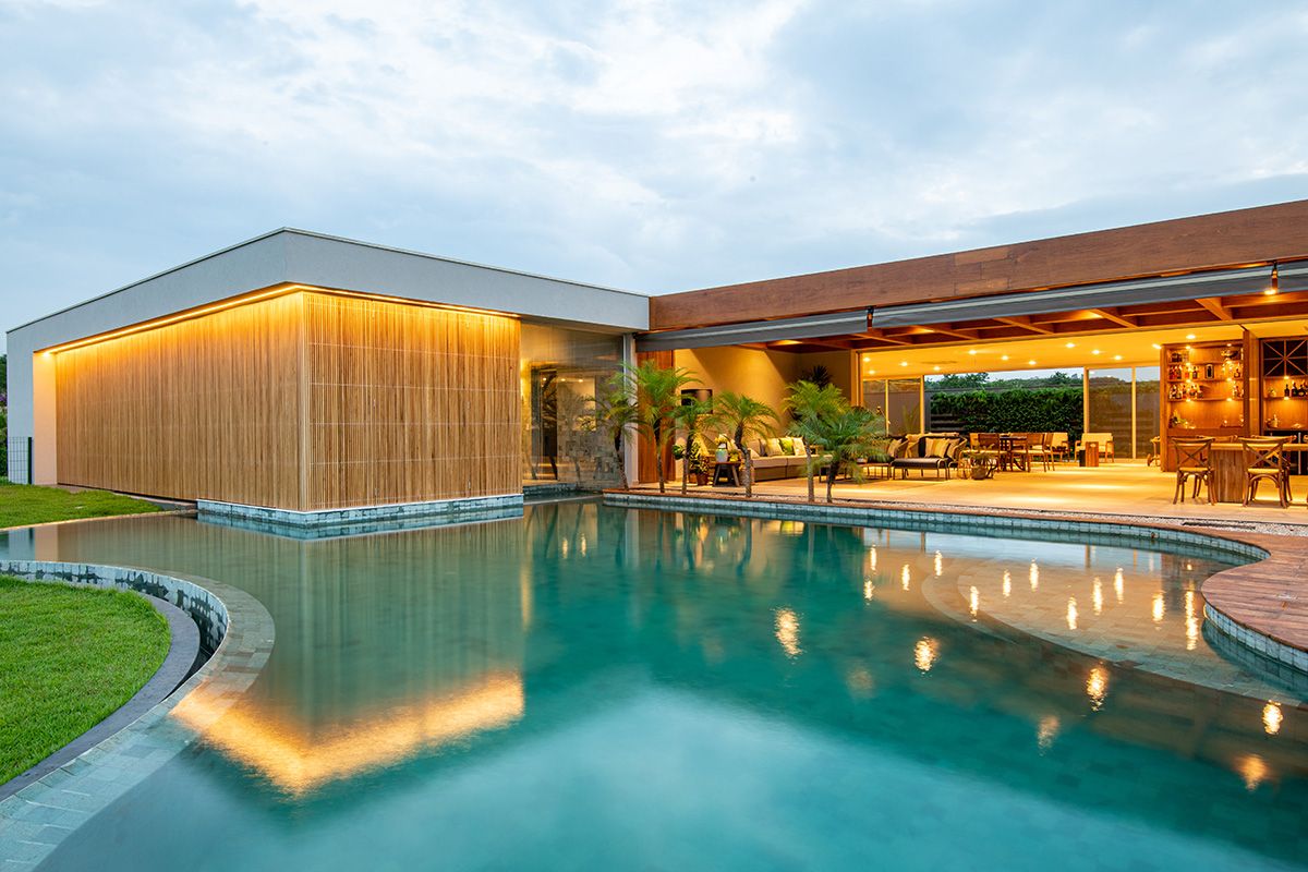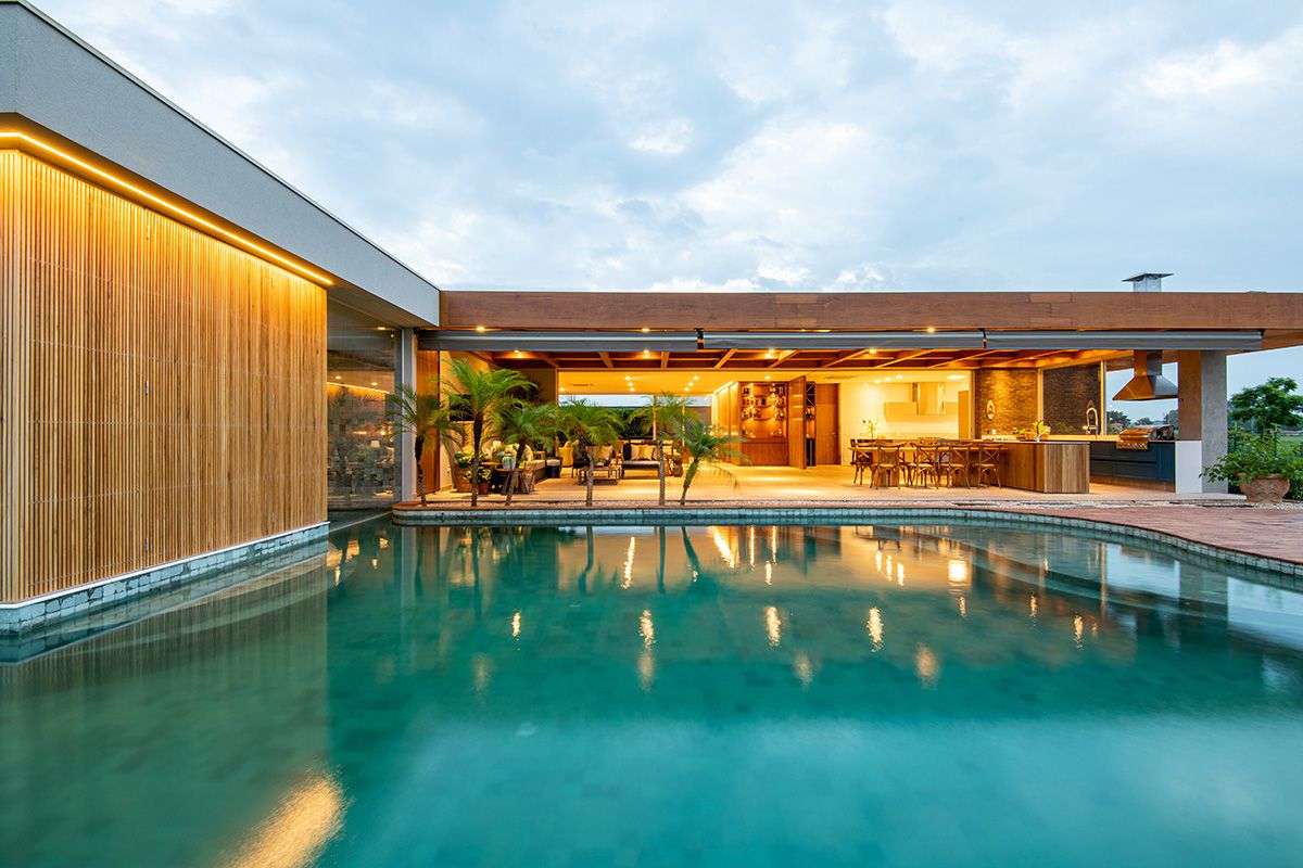 No centro da casa, criou-se um contexto interno-externo através de portas de vidro e madeira, que se recolhem atrás dos painéis ripados, formando assim um espaço único entre estar e a área de lazer. A casa ampla valorizou o convívio entre os moradores, e se tornou um ótimo lugar para receber, sem perder a sensação de acolhimento. A parte externa conta ainda com sauna, spa e piscina com passagem submersa até a suíte do casal – ótima para relaxar e admirar o horizonte.