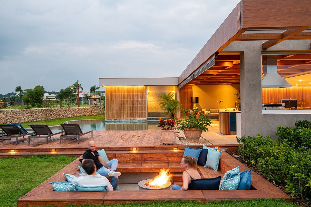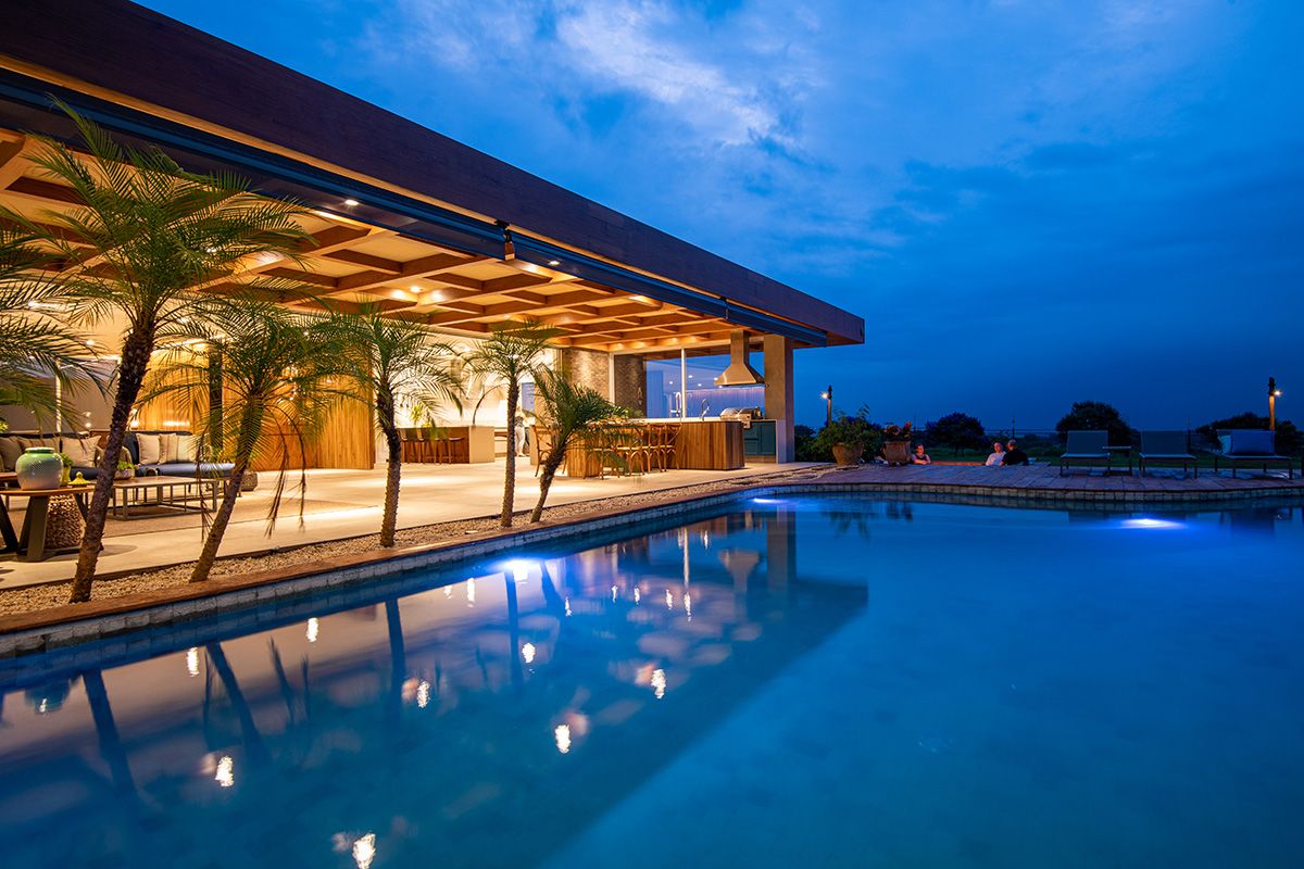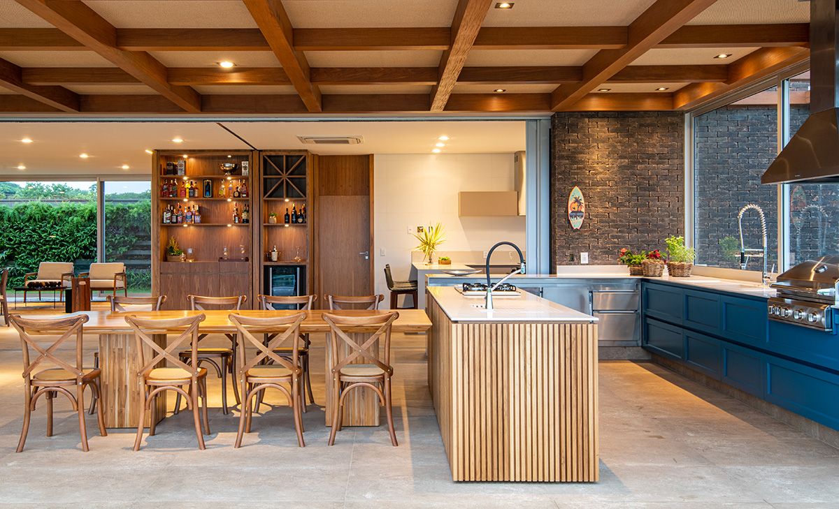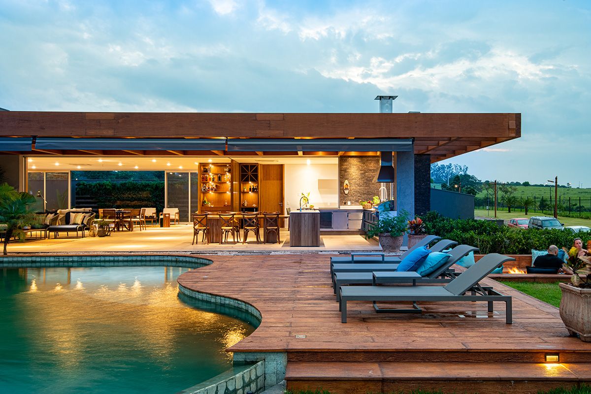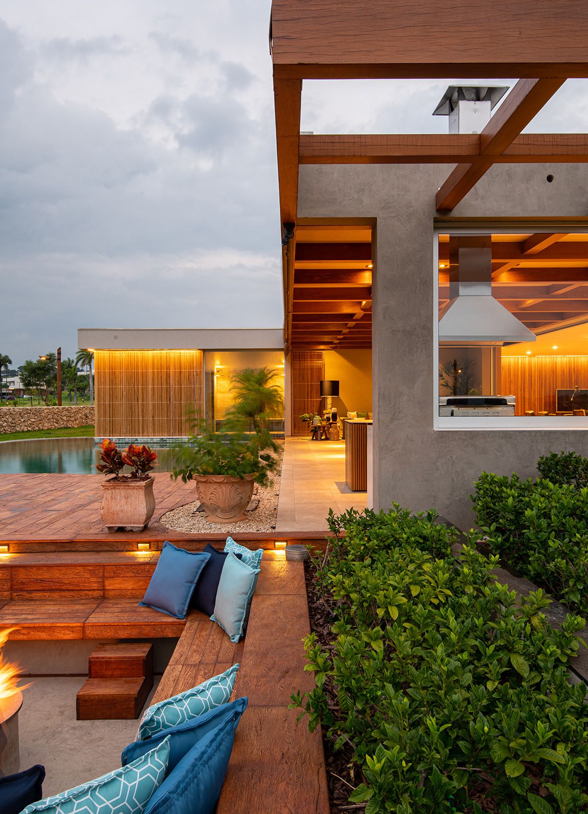 No centro da casa, criou-se um contexto interno-externo através de portas de vidro e madeira, que se recolhem atrás dos painéis ripados, formando assim um espaço único entre estar e a área de lazer. A casa ampla valorizou o convívio entre os moradores, e se tornou um ótimo lugar para receber, sem perder a sensação de acolhimento. A parte externa conta ainda com sauna, spa e piscina com passagem submersa até a suíte do casal – ótima para relaxar e admirar o horizonte.