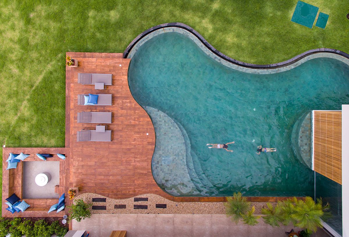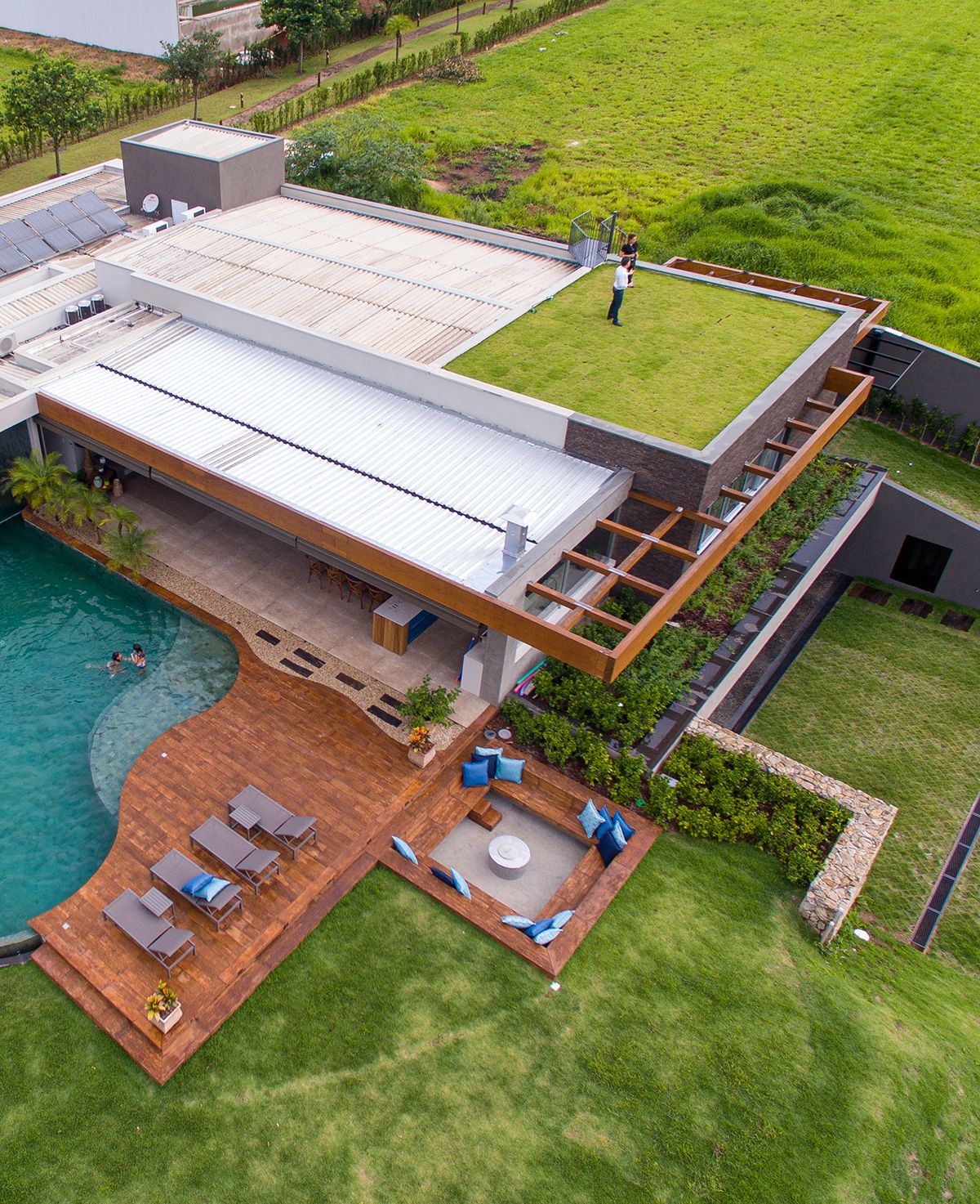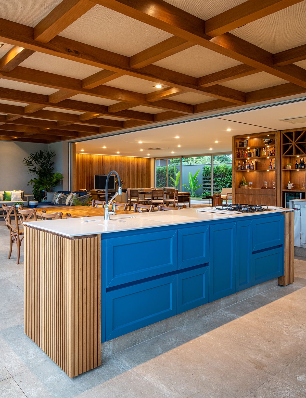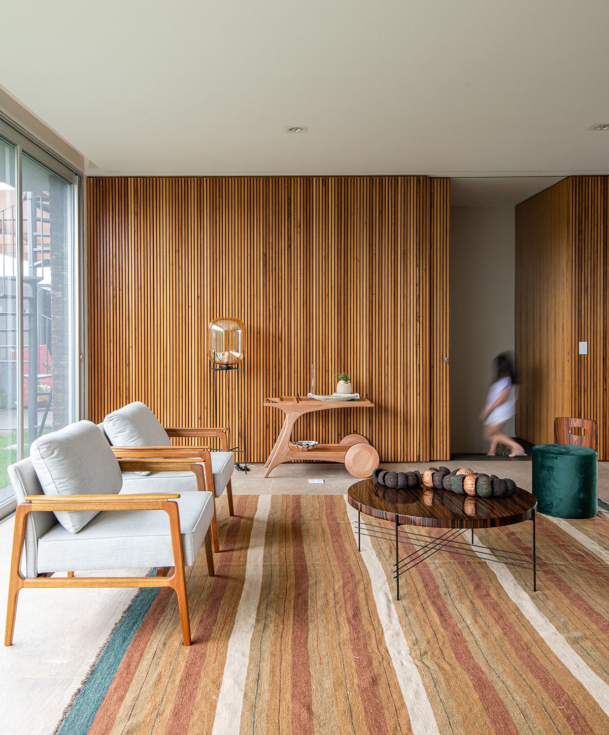 No centro da casa, criou-se um contexto interno-externo através de portas de vidro e madeira, que se recolhem atrás dos painéis ripados, formando assim um espaço único entre estar e a área de lazer. A casa ampla valorizou o convívio entre os moradores, e se tornou um ótimo lugar para receber, sem perder a sensação de acolhimento. A parte externa conta ainda com sauna, spa e piscina com passagem submersa até a suíte do casal – ótima para relaxar e admirar o horizonte.