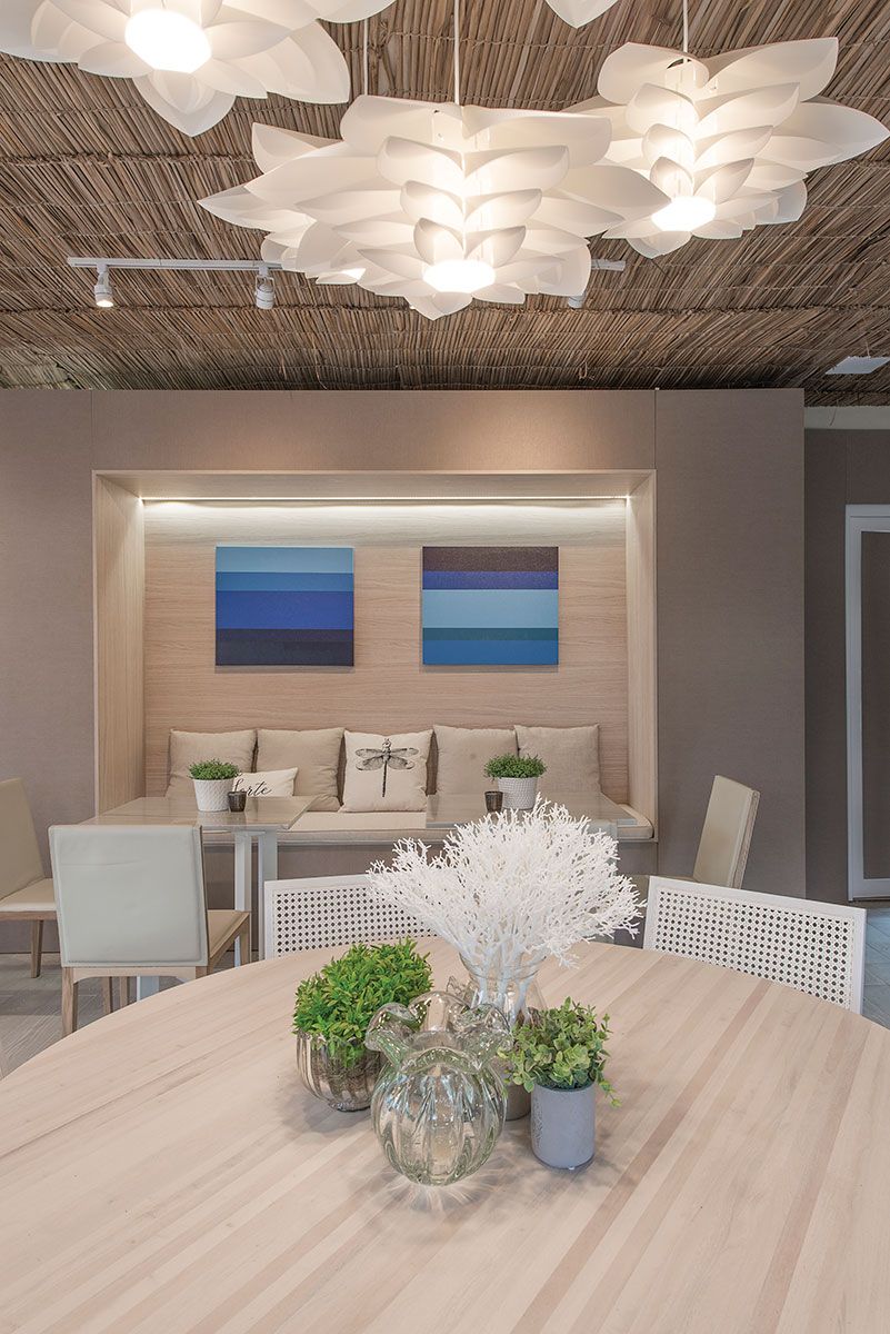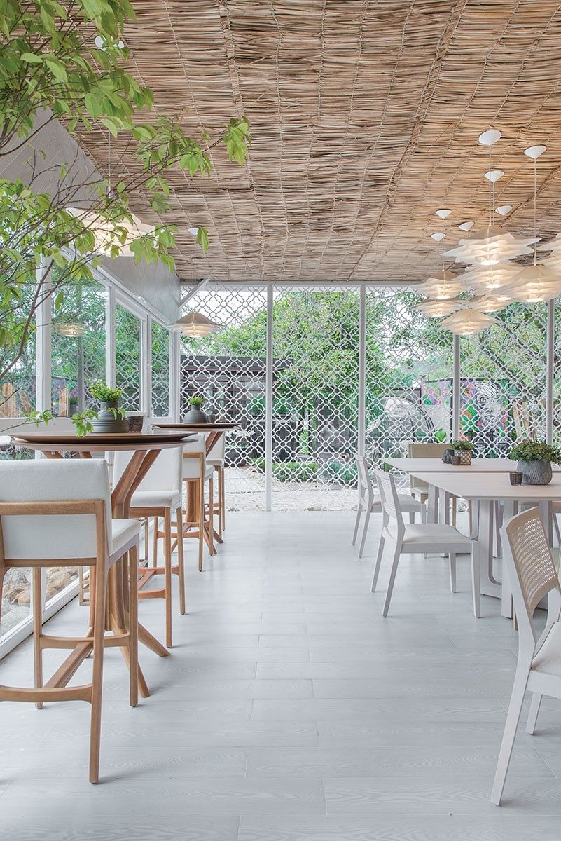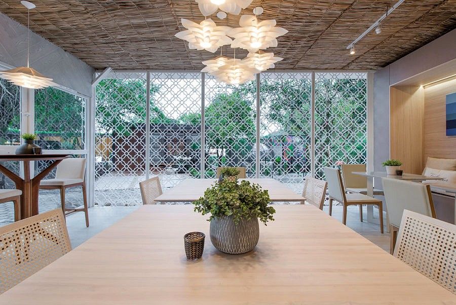 Uma parede de plantas naturais se contrapõe às cores neutras, assim como o revestimento dos banheiros em tom canela, que remete ao pôr do sol da Ilha. Como destaque, a estrutura feita em muxarabi, inspirado nas rendas de bilro, forte herança da colonização açoriana na cidade. Além de evidenciar a ventilação do espaço, ele cria efeitos poéticos de luz e sombra. Já a palha, cria uma atmosfera rústica e aconchegante.
