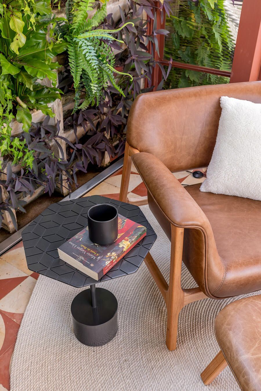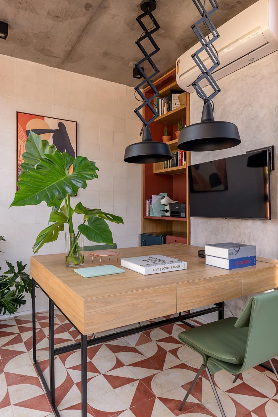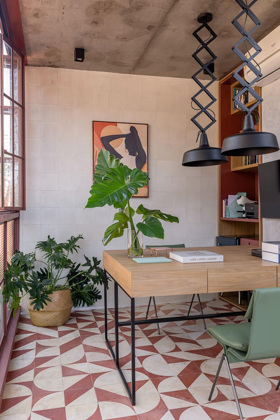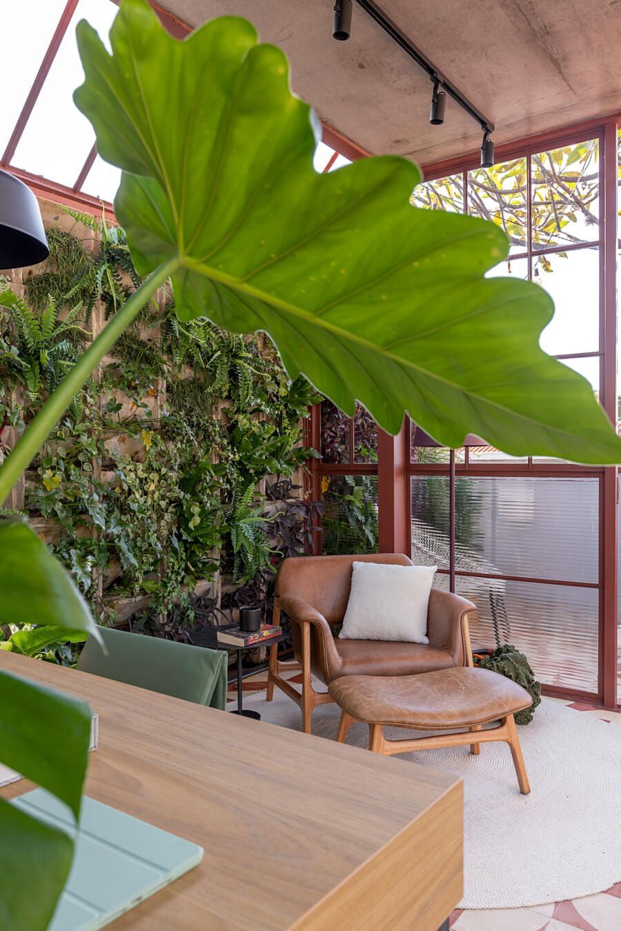 “O ladrilho hidráulico por exemplo, além de lindo, já tinha história para contar, então levamos a cor marsala dele para a estrutura metálica e marcenaria e o tom claro para a parede de fundo do escritório, mantendo a mesma linguagem. Para manter também a rusticidade dos materiais, usamos a laje em concreto aparente. A parede verde, antes abandonada, foi reativada com novas plantas. E para facilitar o cuidado dessas plantas, instalamos uma irrigação automática e ao lado dela, projetamos um canto de leitura e uma pausa no trabalho.”
