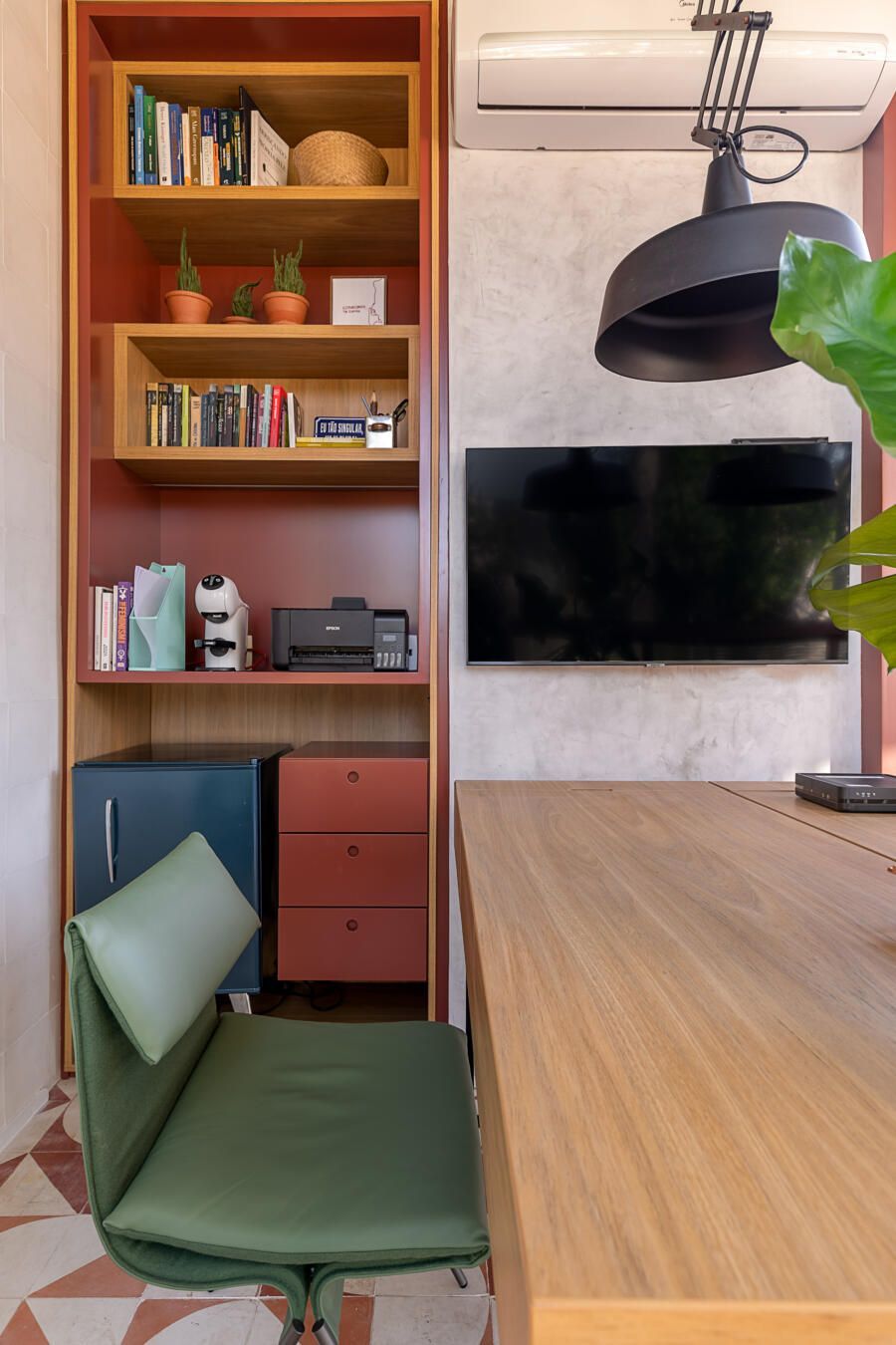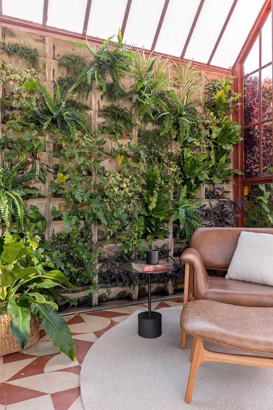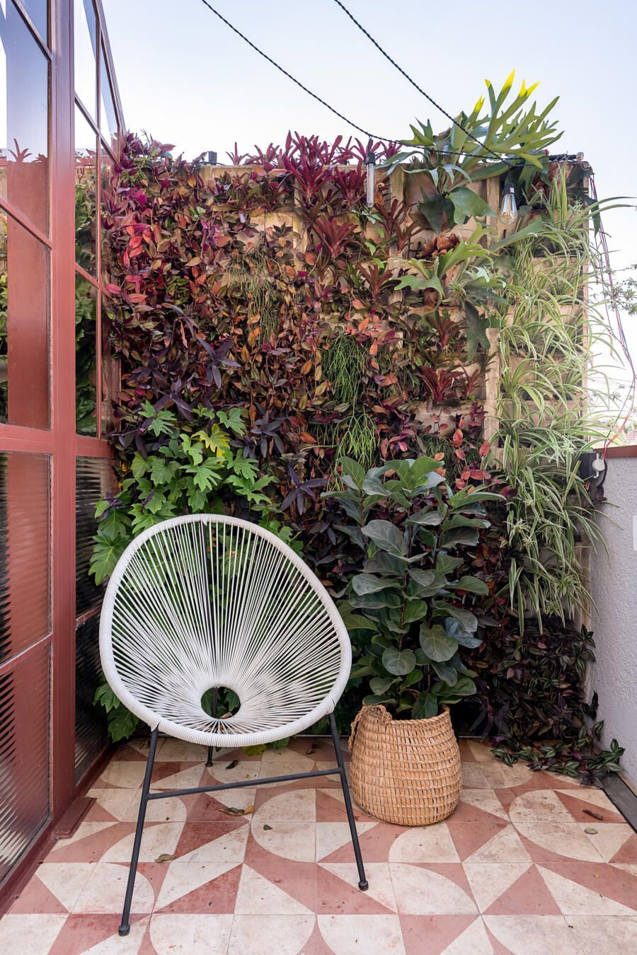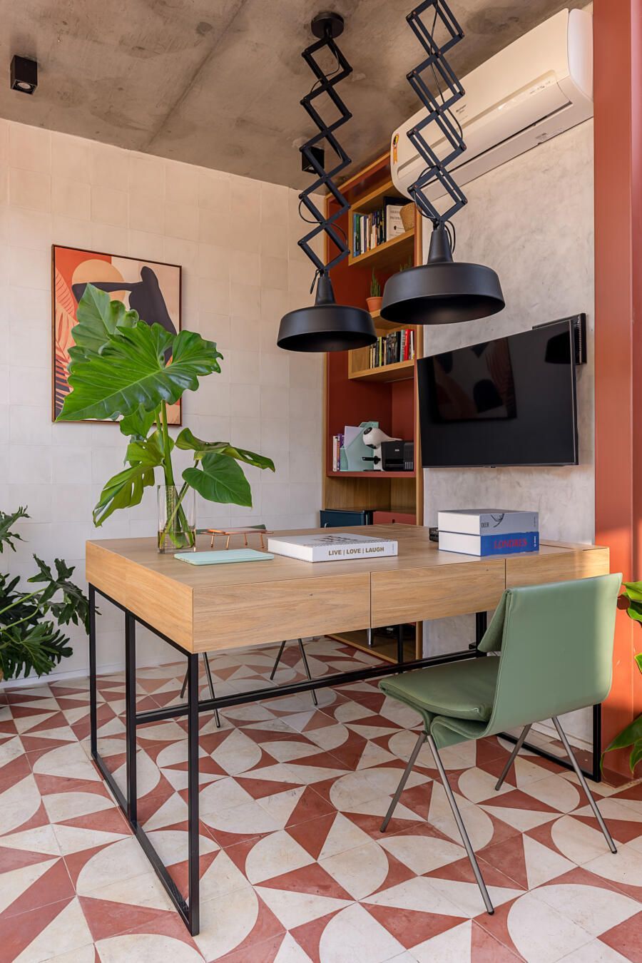 “O ladrilho hidráulico por exemplo, além de lindo, já tinha história para contar, então levamos a cor marsala dele para a estrutura metálica e marcenaria e o tom claro para a parede de fundo do escritório, mantendo a mesma linguagem. Para manter também a rusticidade dos materiais, usamos a laje em concreto aparente. A parede verde, antes abandonada, foi reativada com novas plantas. E para facilitar o cuidado dessas plantas, instalamos uma irrigação automática e ao lado dela, projetamos um canto de leitura e uma pausa no trabalho.”